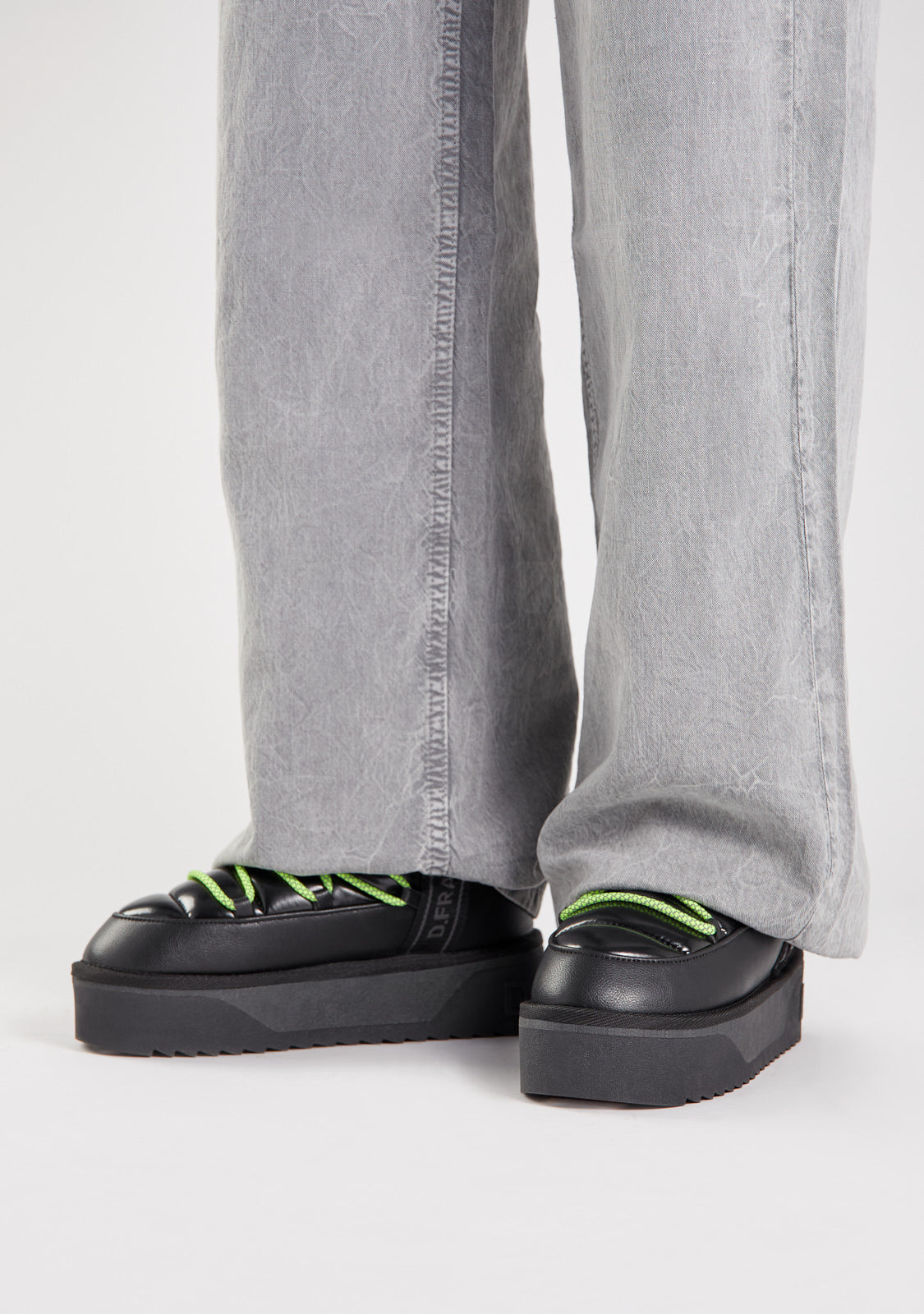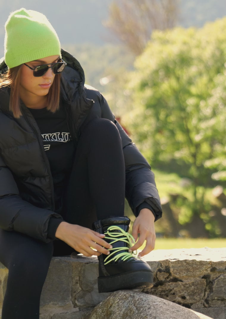 We define cold days with a warm and distinctive piece. This model is made with high-quality, lightweight, and flexible fabrics. Its double-height sole provides great comfort. Additionally, it features our custom emblem on both the heel and the side. Its green laces ensure a perfect fit and support and include reflective details.