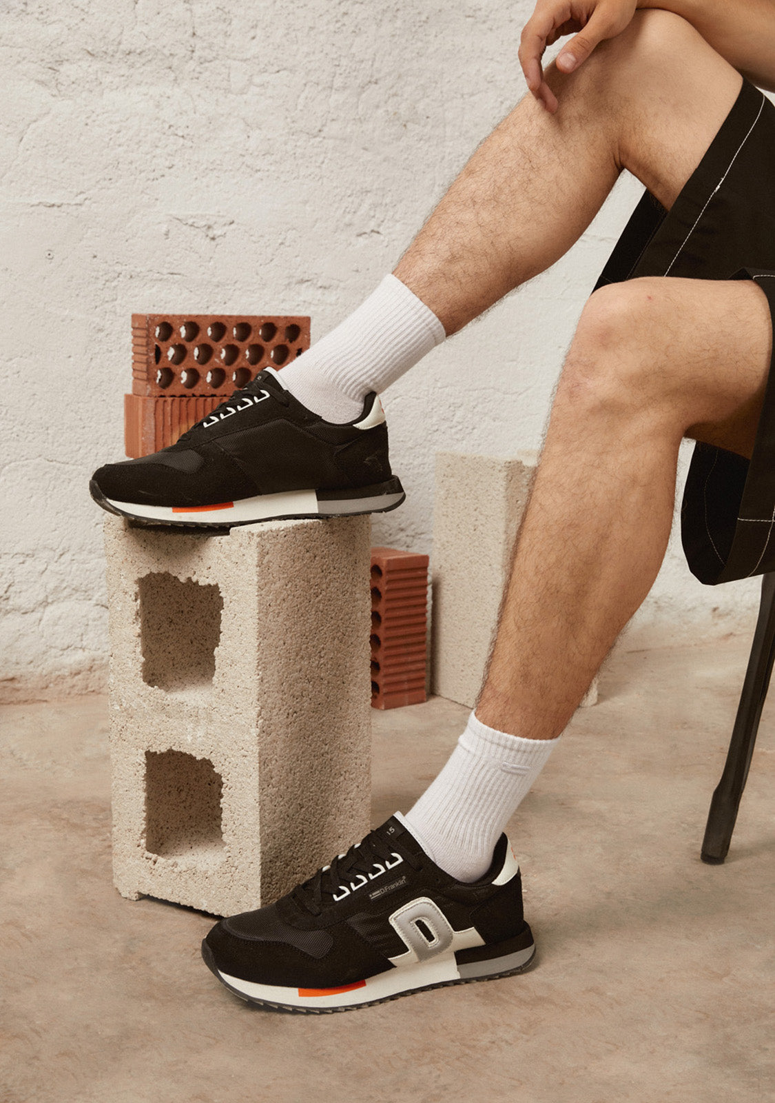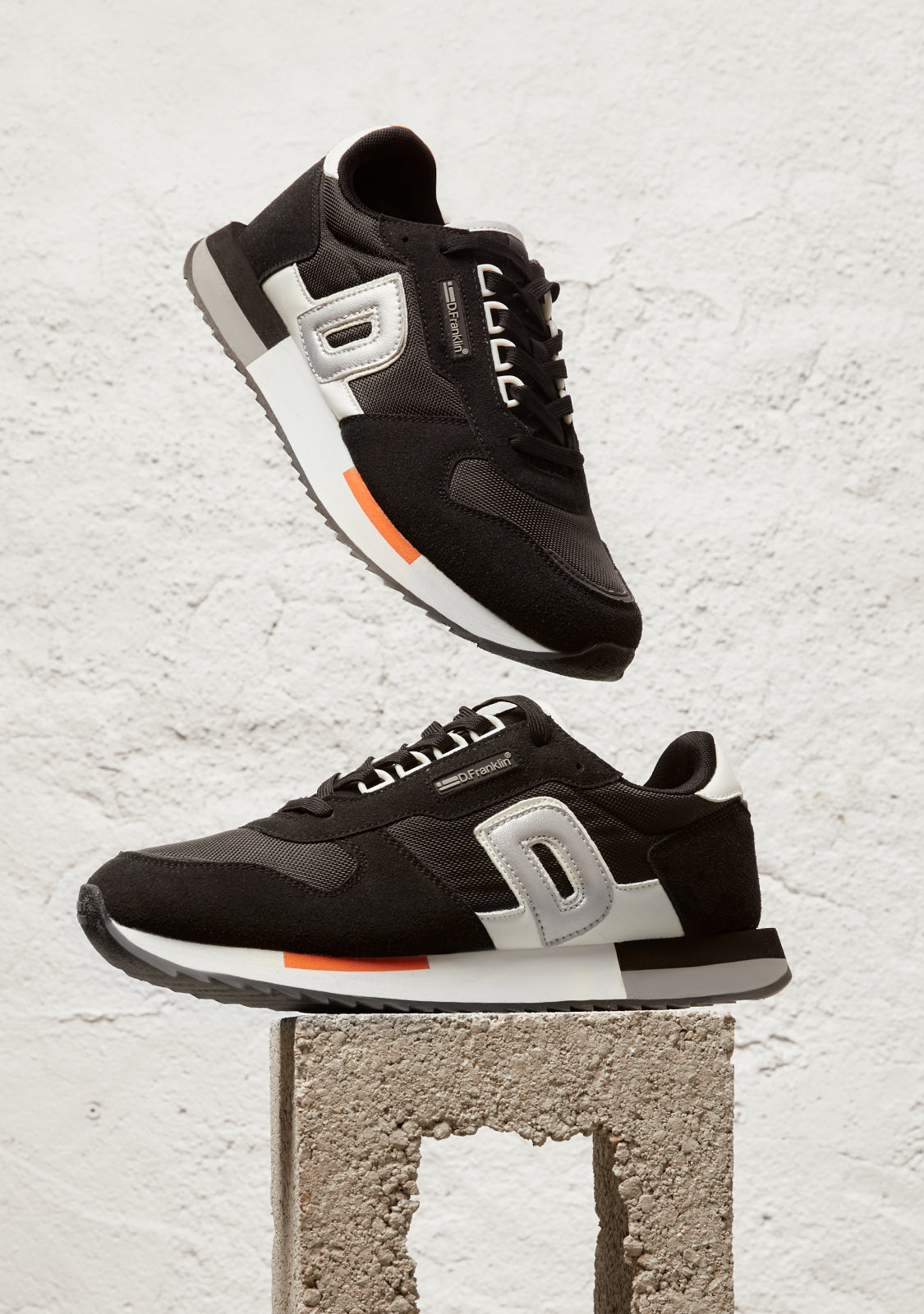 Dieses Modell hat eine klassische Ästhetik in schwarzen Farben mit orangefarbenen Details. Es zeigt den Buchstaben D unseres Emblems an der Seite. Es verfügt auch über Baumwollschnürsenkel für eine perfekte Passform. Die Sohle mit doppelter Dichte und gezacktem Profil sorgt für einen bequemen, leichten Sitz und guten Halt.