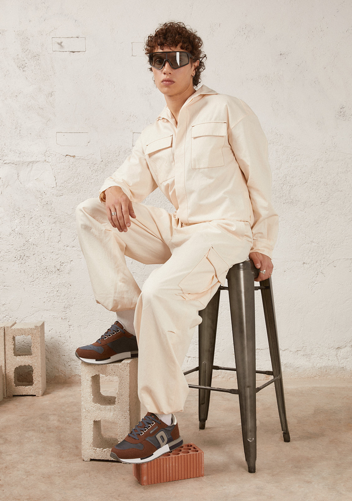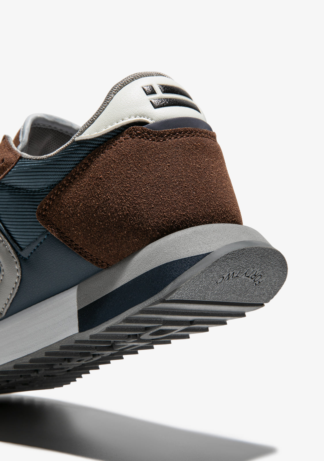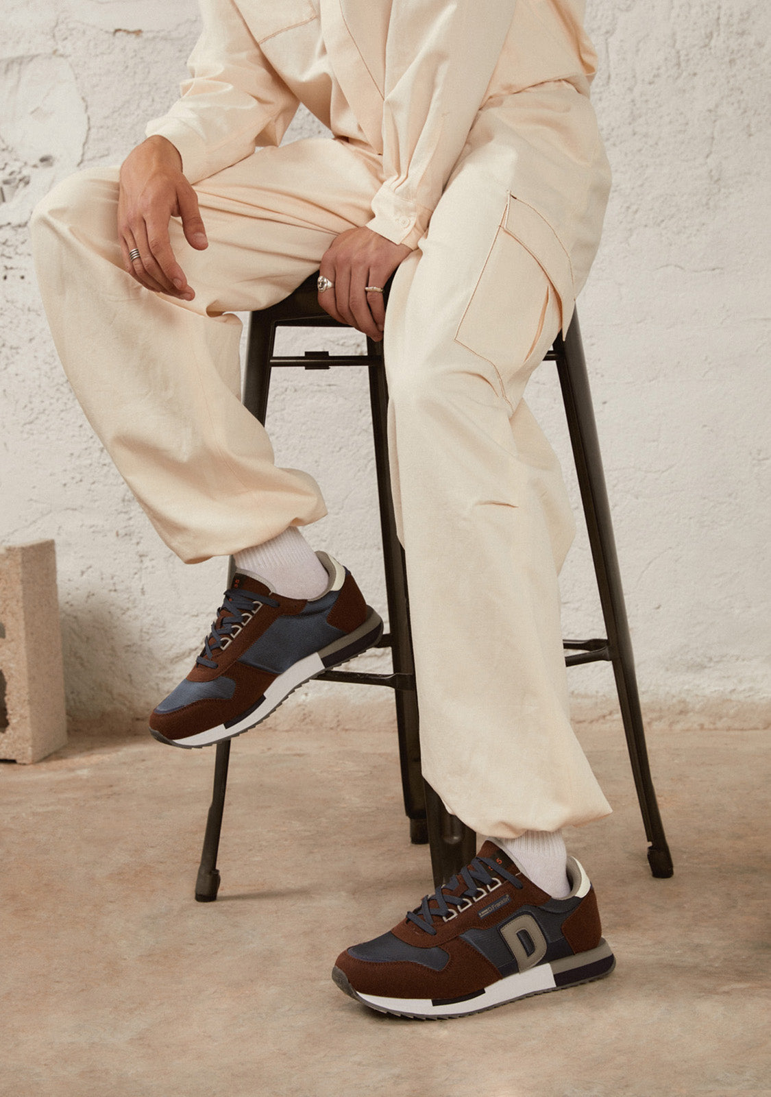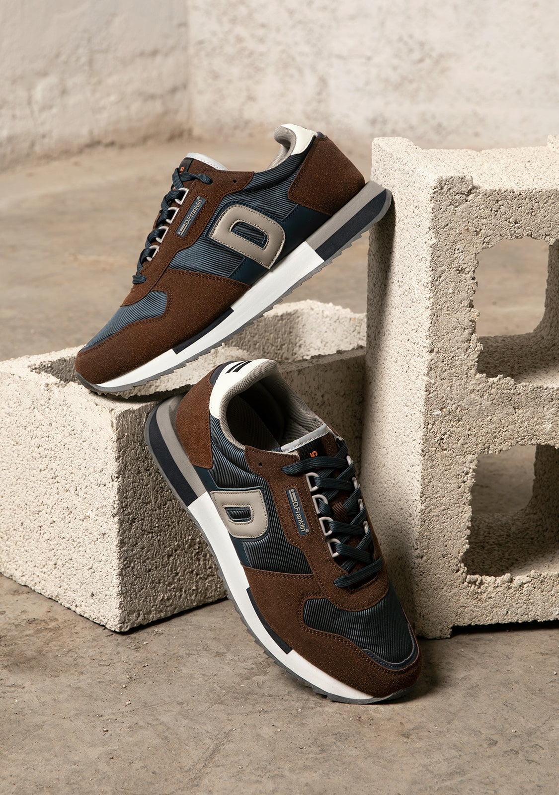 Dieses Modell hat eine klassische Ästhetik in Brauntönen mit grauen Details. Es zeigt den Buchstaben D unseres Emblems an der Seite. Es verfügt auch über Baumwollschnürsenkel für eine perfekte Passform. Die zweidimensionale gezahnte Sohle bietet eine bequeme, leichte Passform und guten Halt.