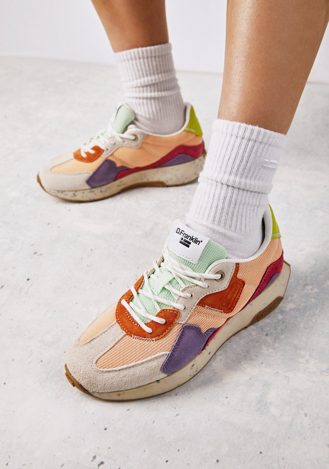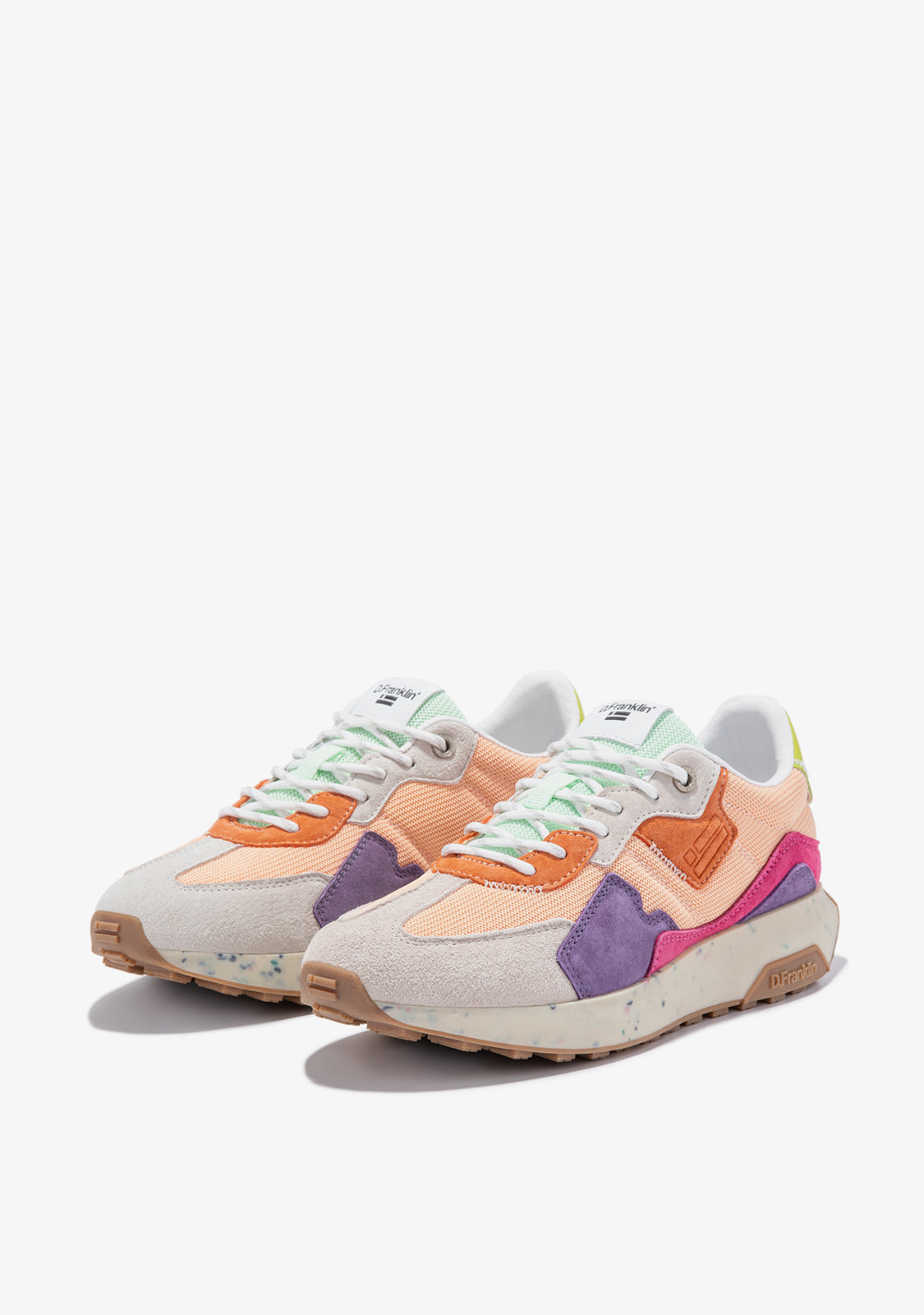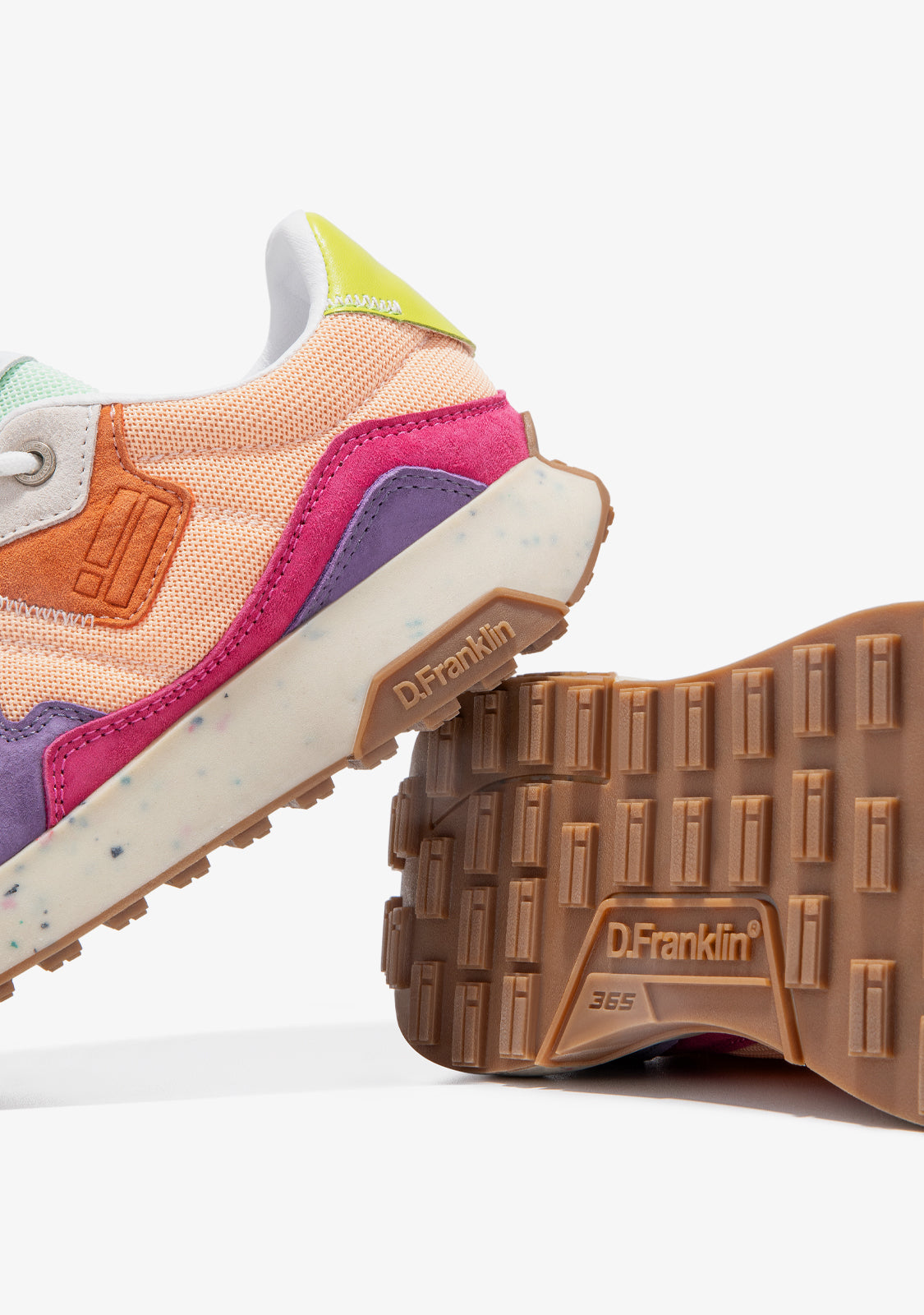 Dieses Modell kombiniert orange, grüne und lila Töne in einem Design, das sich durch seine Einzigartigkeit auszeichnet. Es verfügt über eine D.Franklin-Flagge an der Seite und Schnürdetails für eine perfekte Passform. Darüber hinaus hat es eine Sohle mit zwei Dichten. Die erste besteht aus recycelten Materialien für einen komfortablen und leichten Gang, und die zweite ist geprägt, um Grip zu bieten.