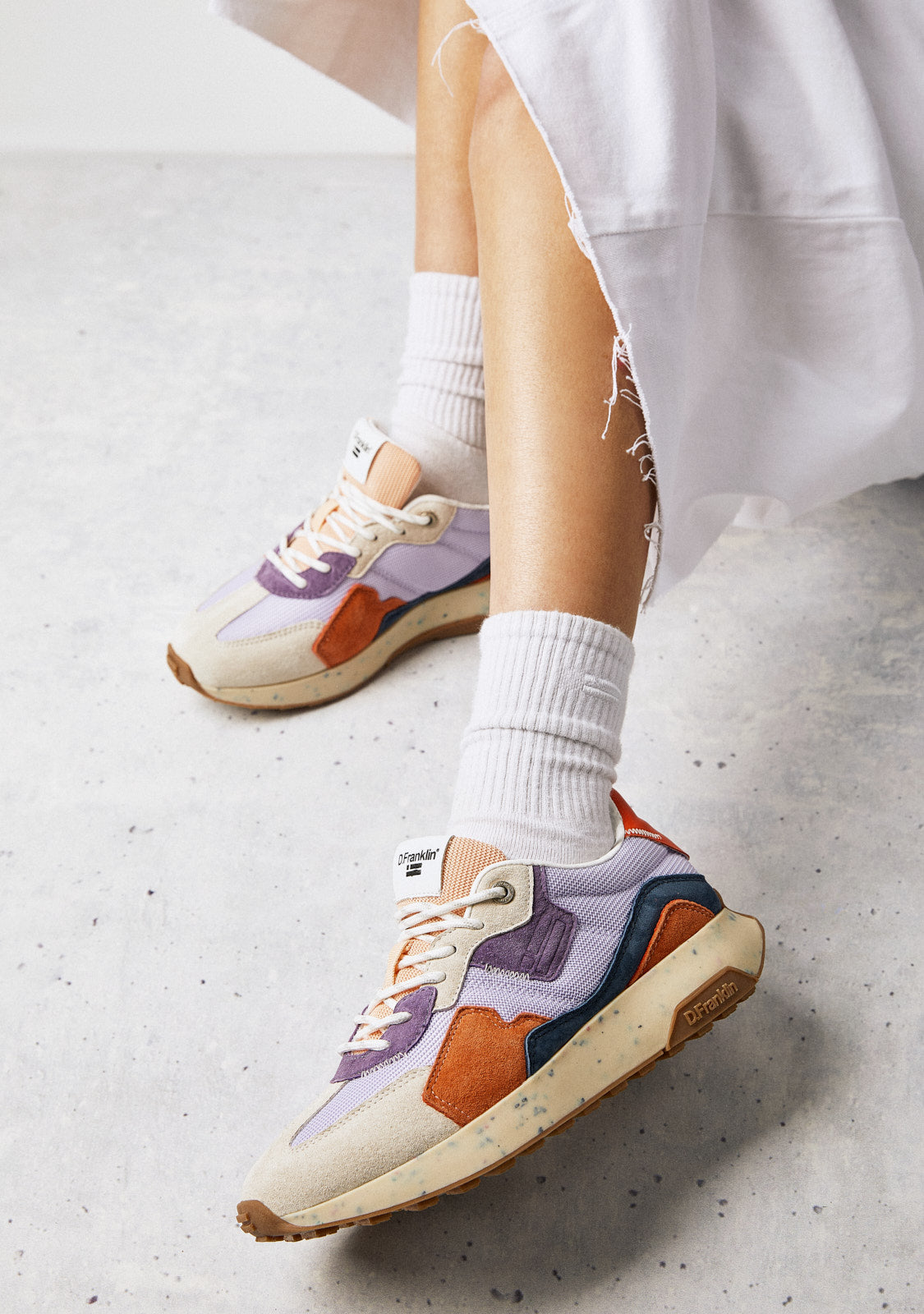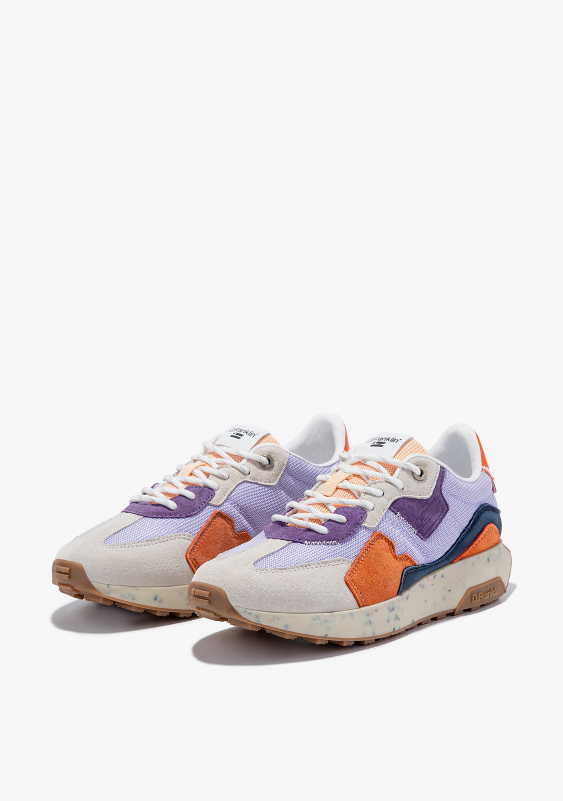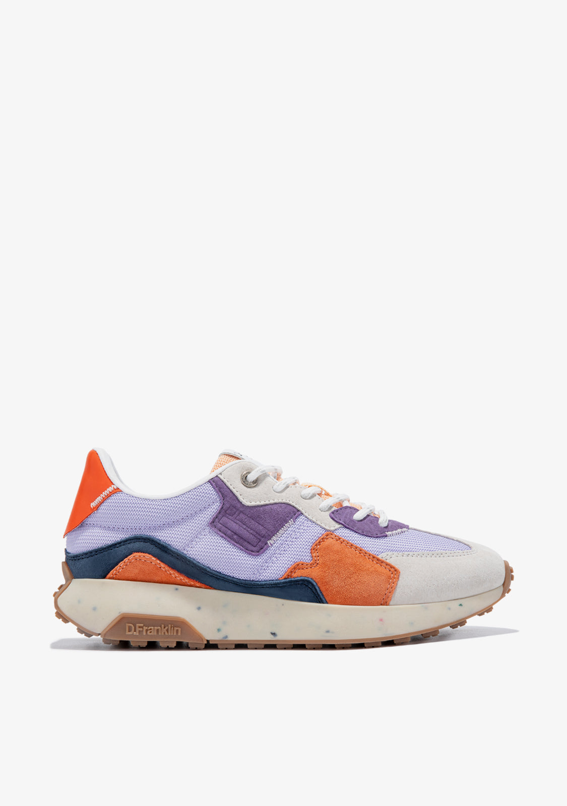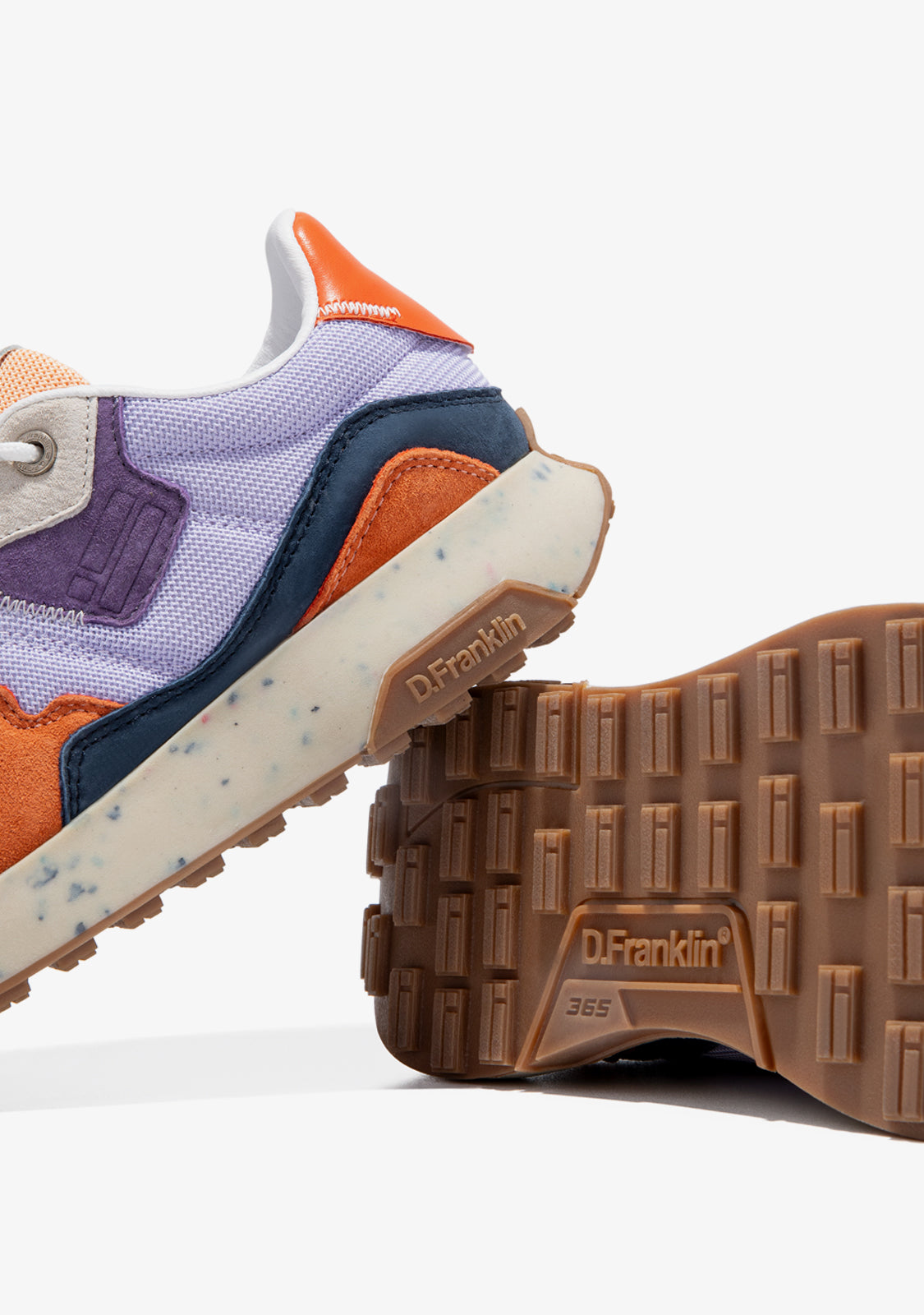 Dieses Modell kombiniert orange, grau und mauve Töne in einem Design, das sich durch seine Einzigartigkeit auszeichnet. Es verfügt über eine D.Franklin-Flagge an der Seite und Schnürdetails für eine perfekte Passform. Darüber hinaus hat es eine Sohle mit zwei Dichten. Die erste besteht aus recycelten Materialien für einen bequemen und leichten Gang, und die zweite ist geprägt, um Grip zu bieten.
