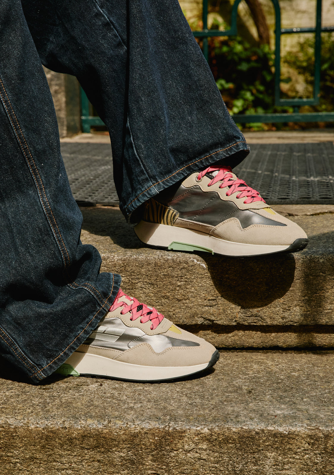 Dieses Modell vereint verschiedene Texturen mit silbernen und rosa Tönen, die seine Einzigartigkeit hervorheben. Es verfügt über die D.Franklin-Flagge an der Seite und bedruckte Schnürsenkel für einen perfekten Sitz. Darüber hinaus hat es eine Sohle mit zwei Dichten. Die erste besteht aus recycelten Materialien für einen bequemen und leichten Gang, und die zweite ist geprägt, um Grip zu bieten.