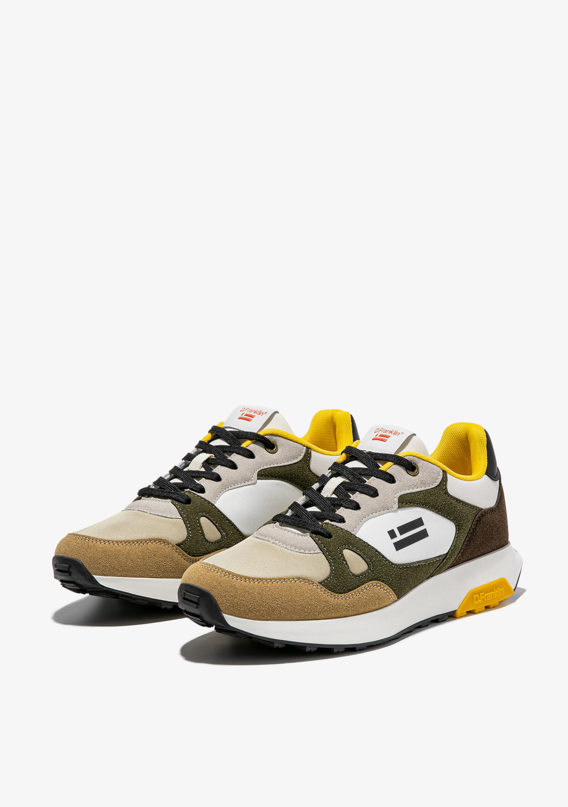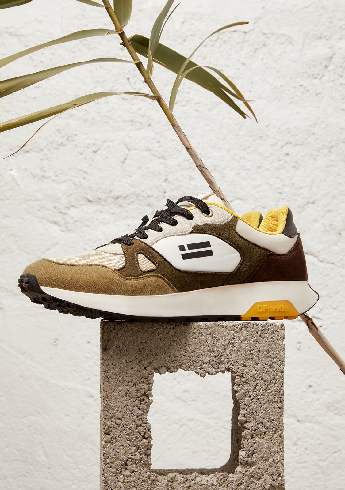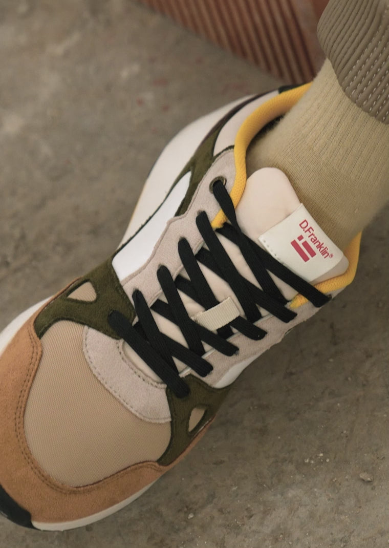 Dieses Modell kombiniert die Natürlichkeit von Braun- und Khakigrüntönen in einem Design, das sich durch seine Einzigartigkeit auszeichnet. Es verfügt über eine D.Franklin-Flagge an der Seite und Baumwollschnürsenkel für einen perfekten Sitz. Darüber hinaus hat es eine Sohle mit zwei Dichten. Die erste besteht aus recycelten Materialien für einen bequemen und leichten Gang, und die zweite ist geprägt, um Grip zu bieten.