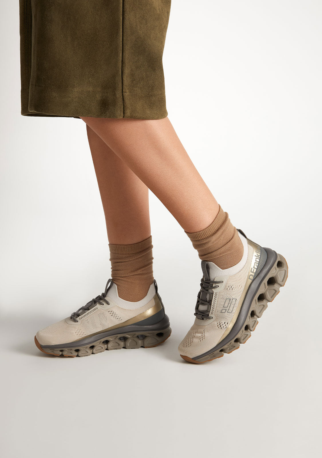 Die Aero Cream / Gold von D.Franklin kombiniert die Eleganz von Creme mit dem glänzenden Touch von Gold und schafft so einen anspruchsvollen und stilvollen Sneaker. Perfekt für diejenigen, die eine vielseitige, aber dennoch mutige Option suchen.