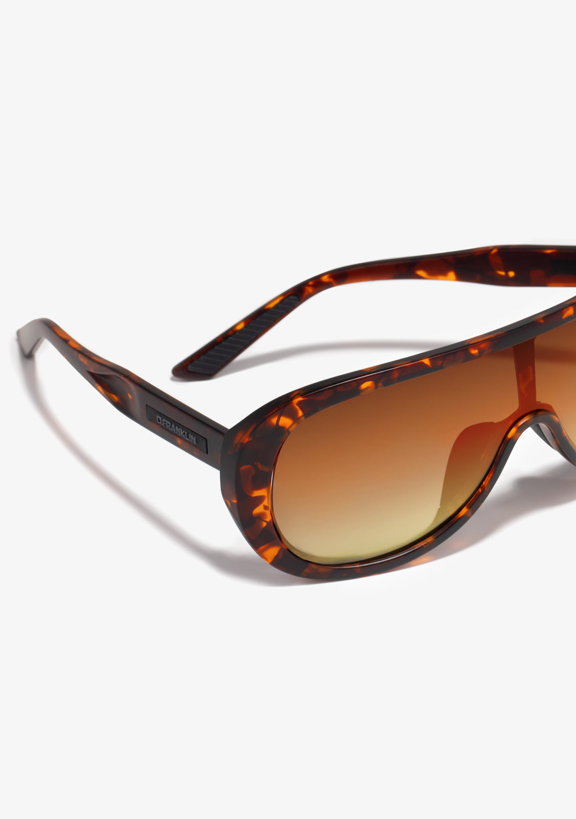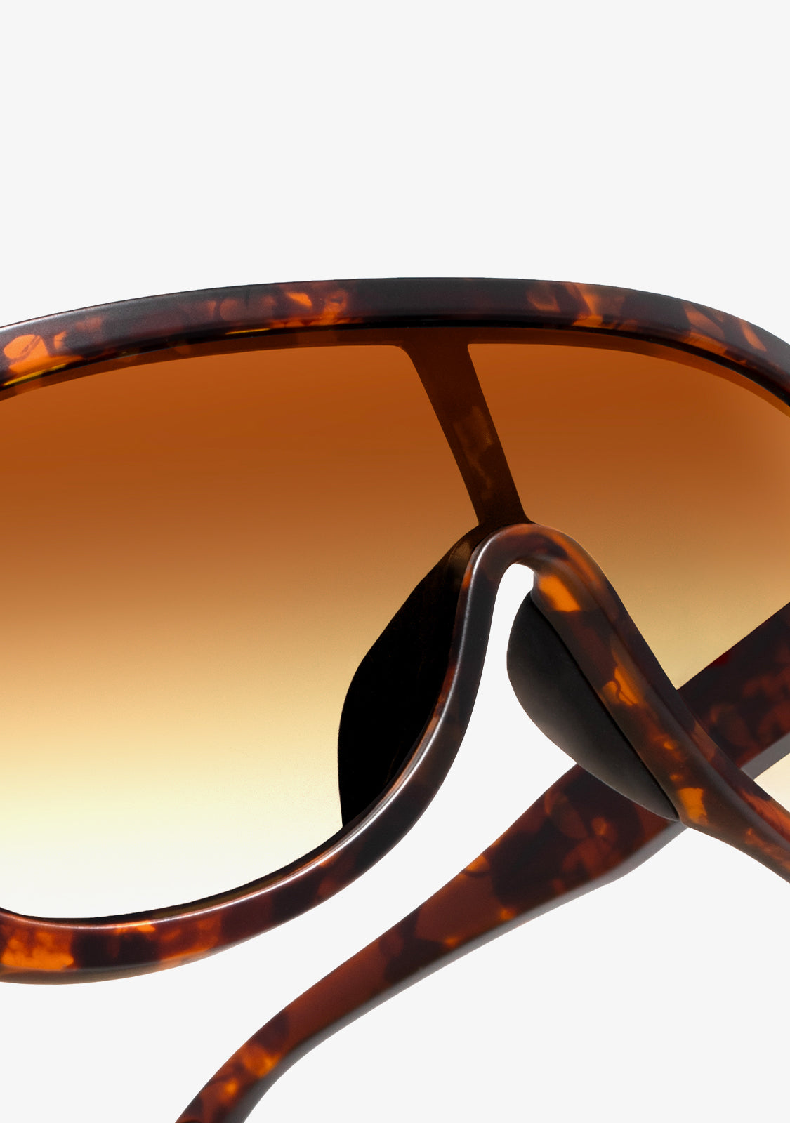 Dieses Modell verfügt über ein Schildpatt-Gestell mit einer leicht geschwungenen Ästhetik. Es hat getönte Gläser und unser charakteristisches Emblem an der Seite der Bügel. Die einheitliche Gläserbreite von 131 mm und das vordere Gestell von 147 mm sind mit einem 135 mm langen Bügel verbunden.