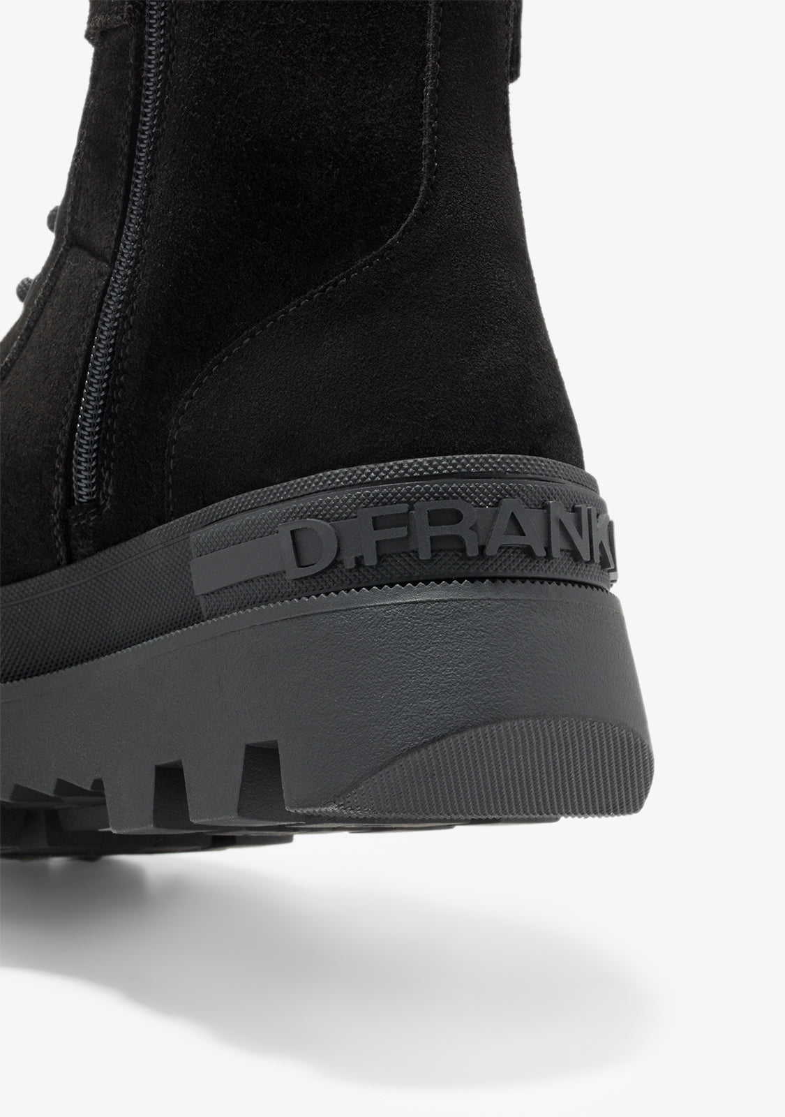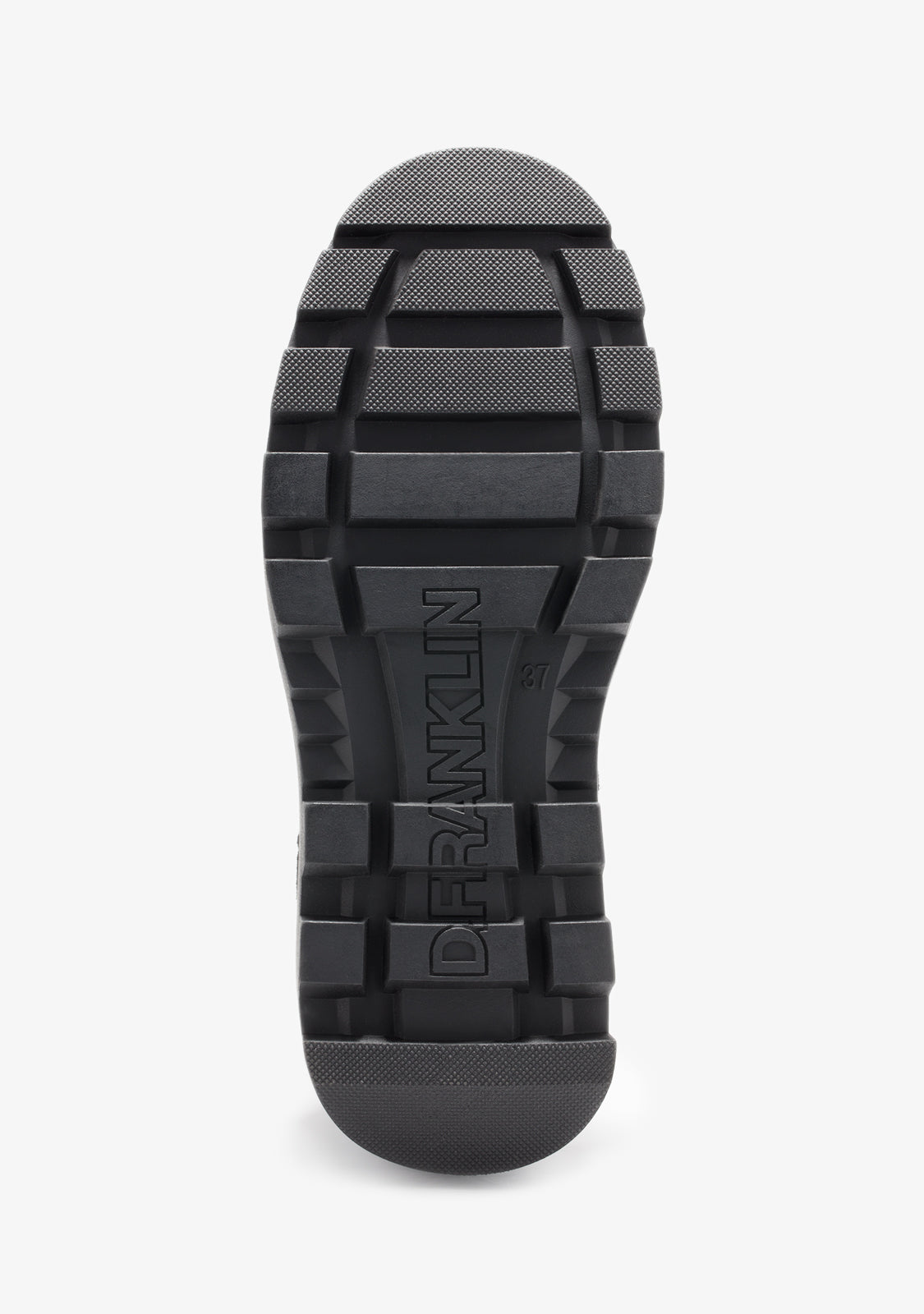Dieses D.Franklin-Modell in Schwarz verfügt über einen inneren Reißverschluss auf einer Seite und verstellbare Baumwollschnürsenkel. Seine Track-Stil-Sohle bietet unvergleichlichen Halt. Es zeigt auch unser Logo und Emblem geprägt auf dem Keil und der Zehe.