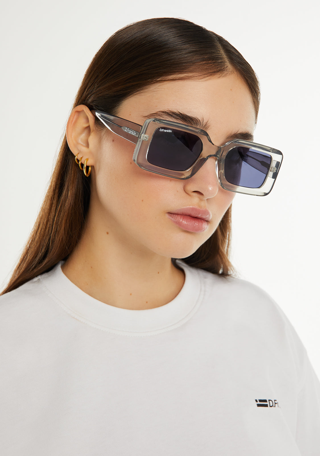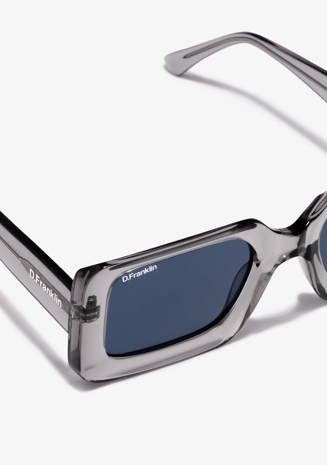Unser Bahamas-Modell in Grautönen hat die charakteristischen Details der D.Franklin-Marke, das Logo, das auf den Bügeln eingraviert ist, und das Emblem auf der Linse. Die Linsenbreite beträgt 51 mm und die Front 146 mm. Die seitlichen Bügel sind 145 mm lang.
