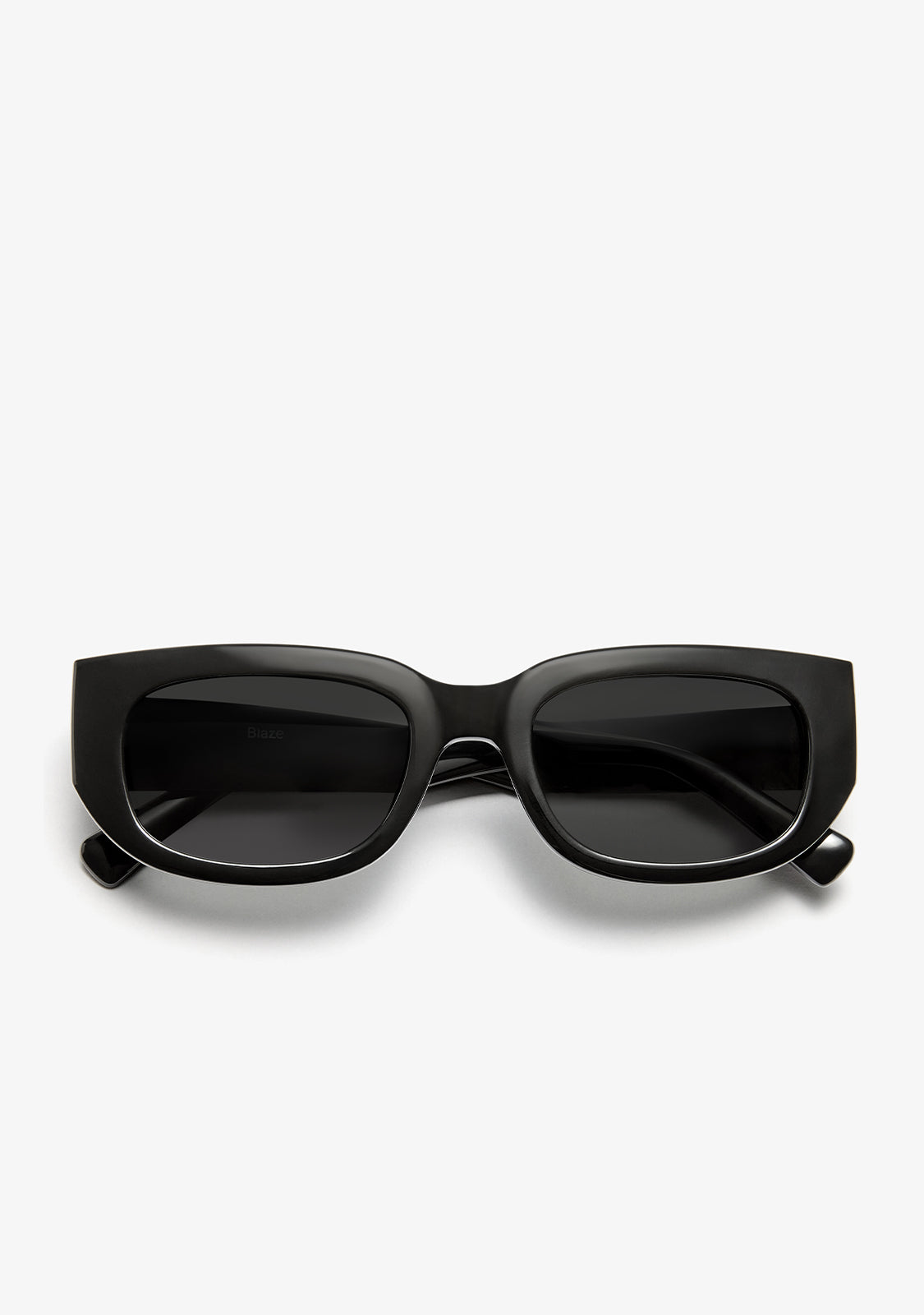 Die Blaze Black / Black Sonnenbrille verfügt über eine markante rechteckige Silhouette mit einem eleganten, ganz schwarzen Finish. Inspiriert von Retro-Formen und verfeinert mit klaren Linien, verleihen sie jedem Alltagslook eine selbstbewusste Note.