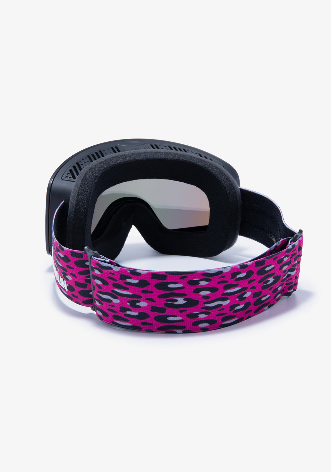 Dieses von Gipfeln inspirierte Modell verfügt über verspiegelte Polycarbonatlinsen ohne Grenzen oder Rahmen. Es hat ein silbernes, pinkes und schwarzes Finish mit unserem charakteristischen Emblem an der Seite seines Leopardenmuster-elastischen Bands. Die einheitliche Linsenbreite beträgt 179,5 mm.