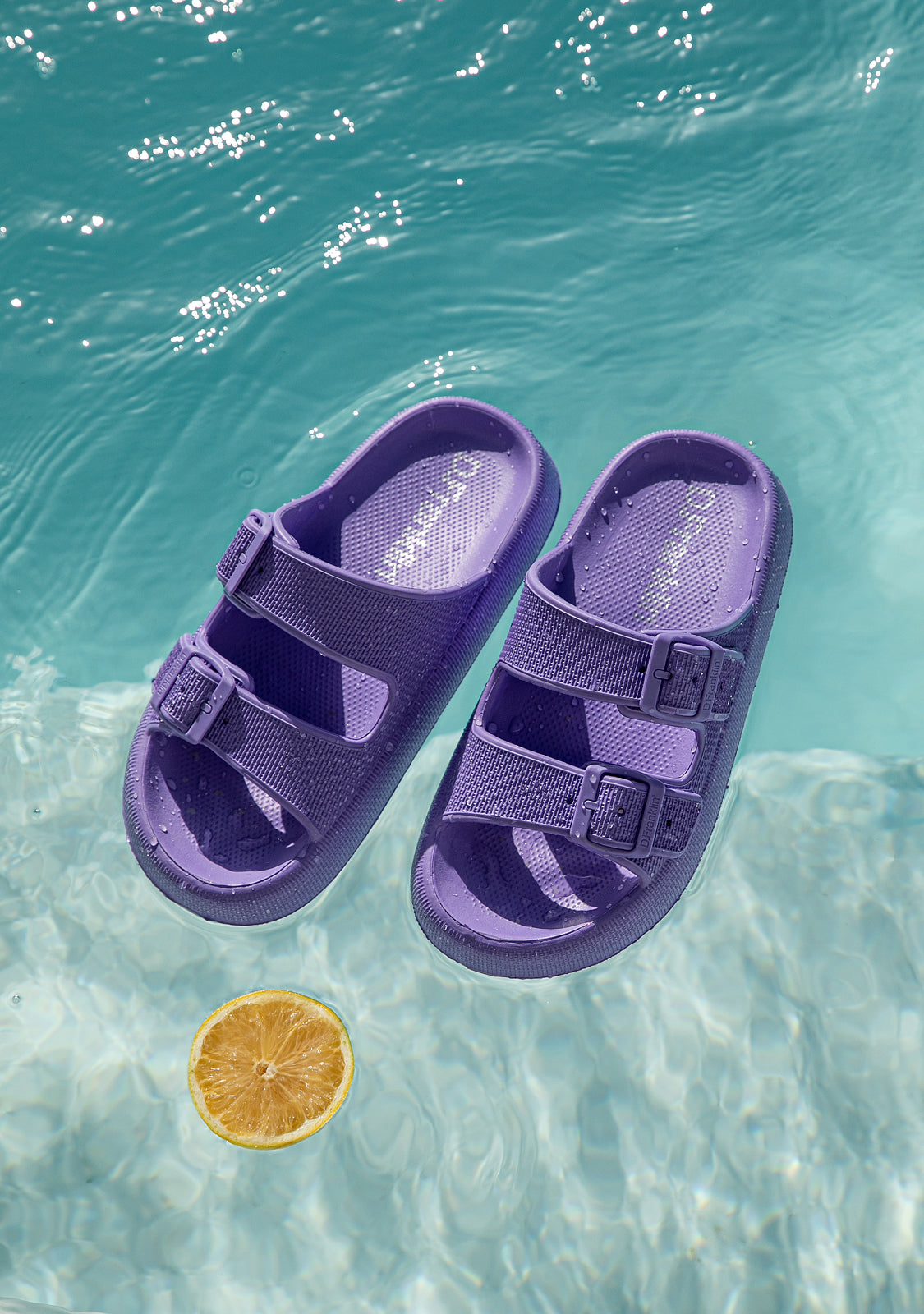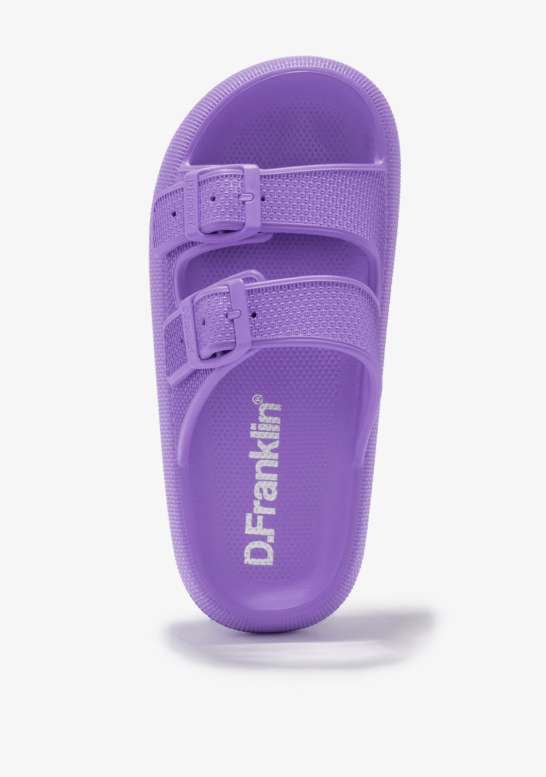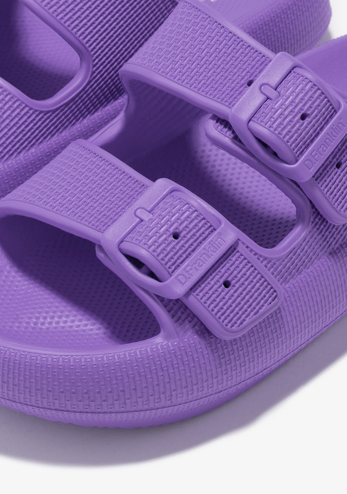 Schattierungen von Lila überschwemmen den Sand des Pfeiffer Beach in Kalifornien in dieser Sandale. Hergestellt aus EVA für einen leichten Schritt. Entworfen mit einer abgerundeten Silhouette und doppeltem Schnallenverschluss in Lavendel. D.Franklin-Logo auf der Sohle. Die Bloomer Bio Sandalen fallen etwas klein aus. Wir empfehlen, eine Größe größer als gewöhnlich zu wählen.
