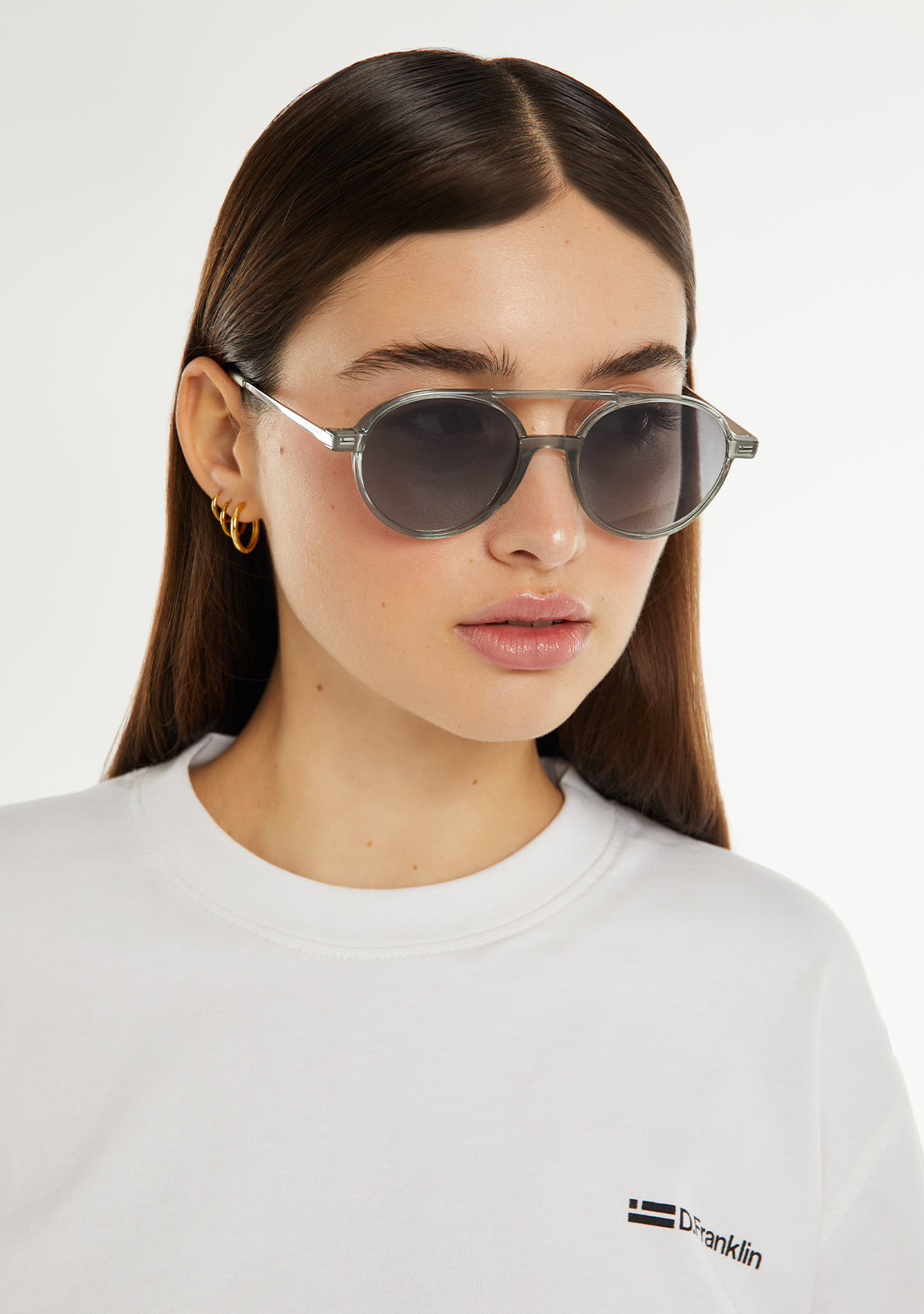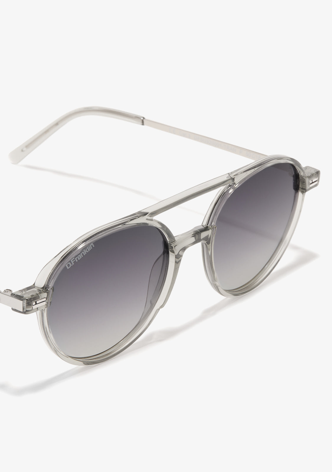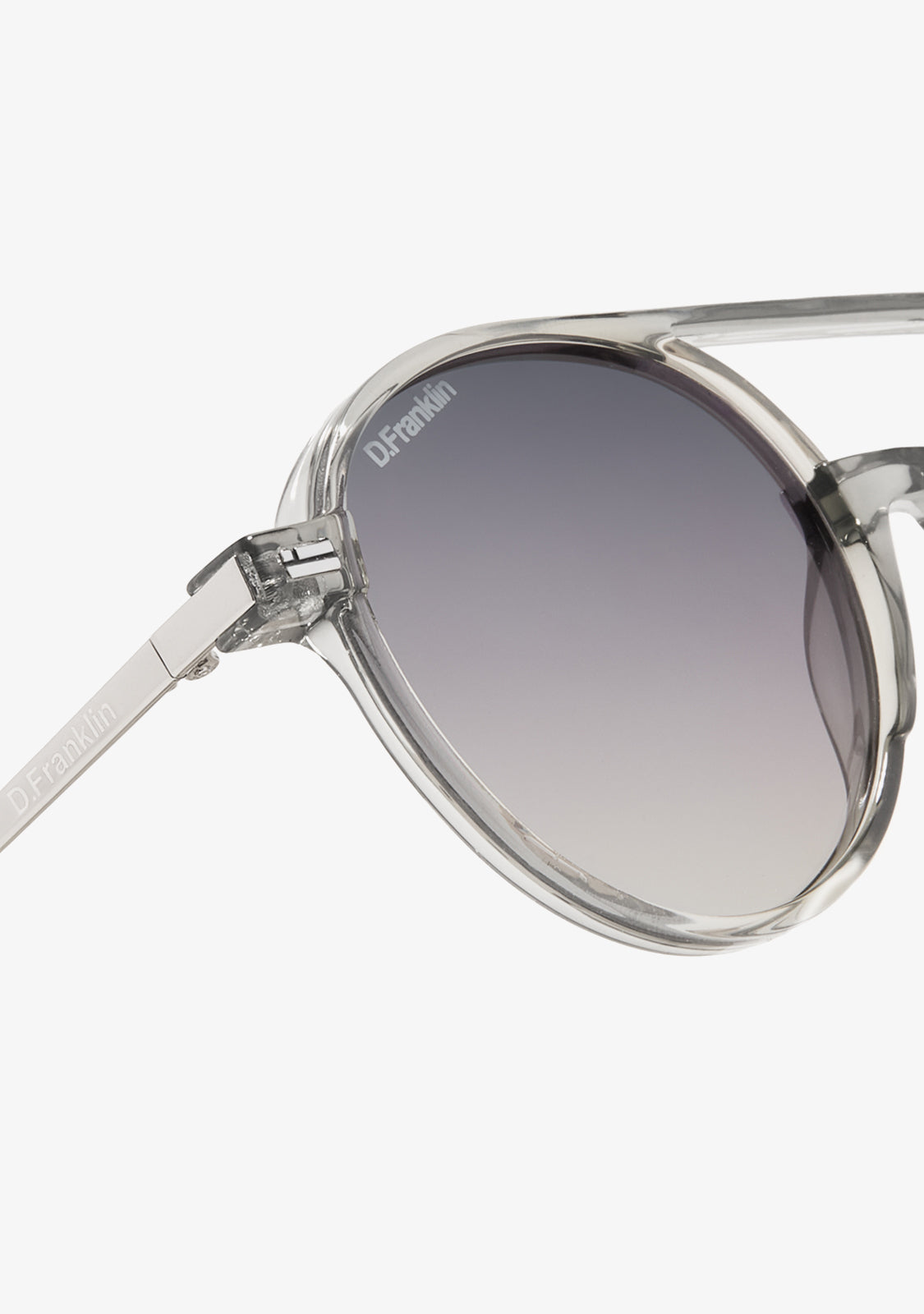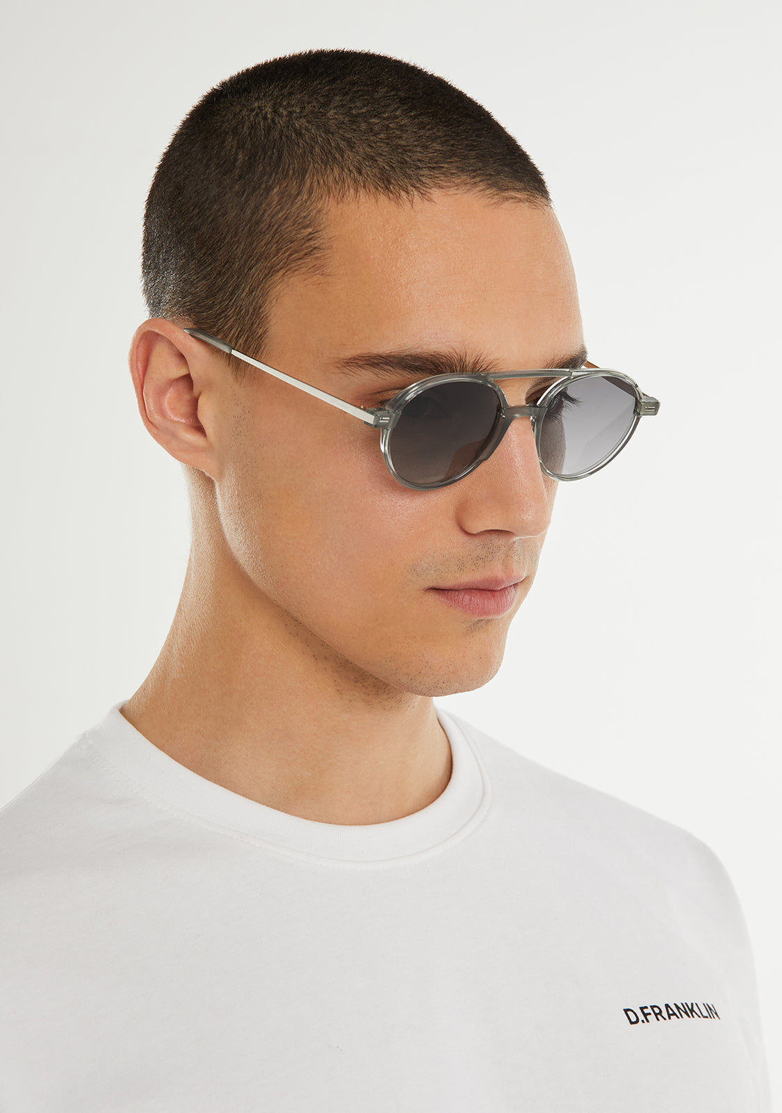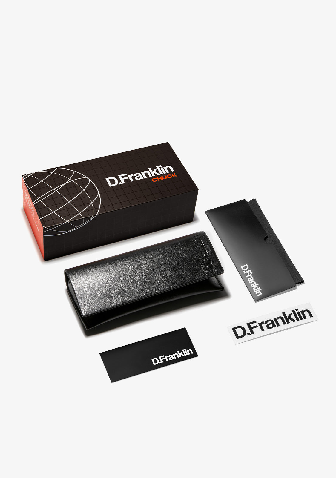 Unser grautöniger Chuck verfügt über die charakteristischen D.Franklin-Details, ein graviertes Logo an den Bügeln und ein Emblem auf dem Glas. Die Glasbreite beträgt 50 mm und die Front ist 140 mm. Die Bügellänge beträgt 145 mm, was für alle Gesichtsformen geeignet ist.