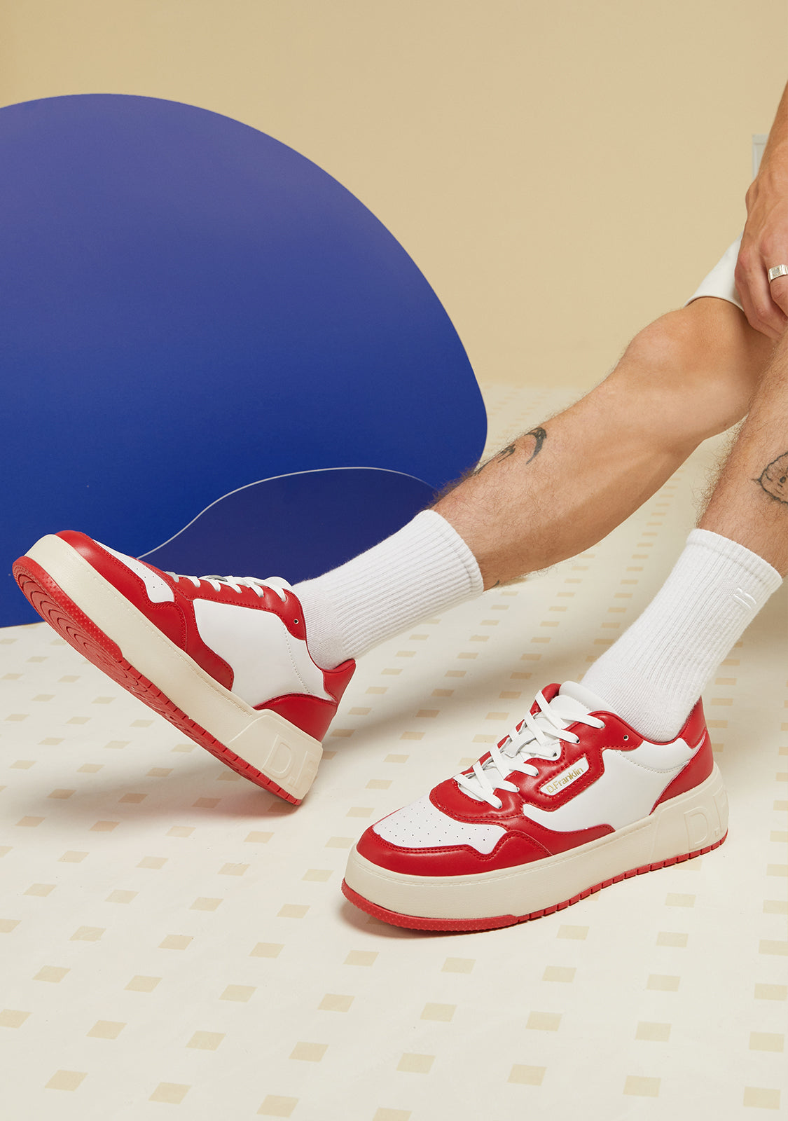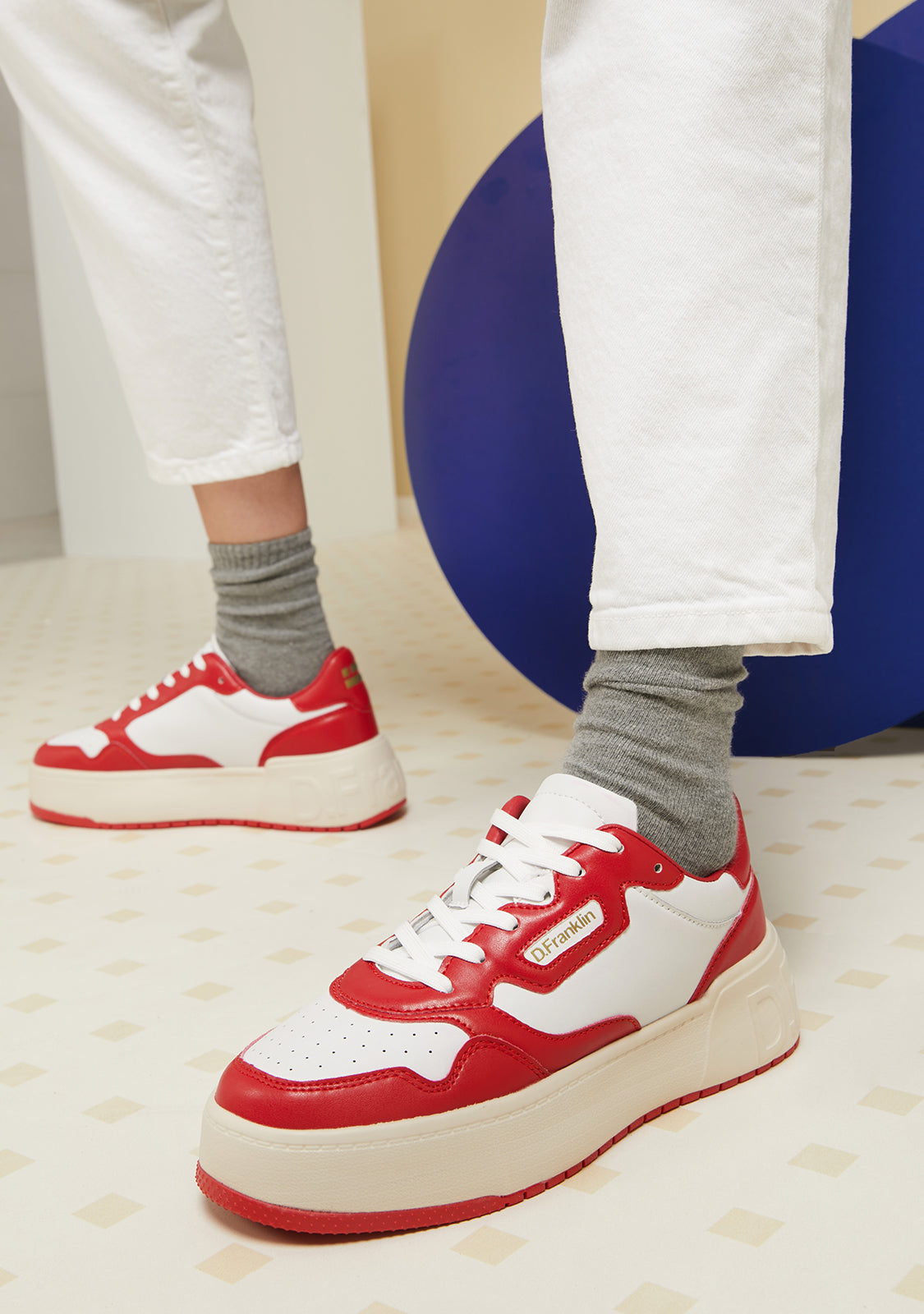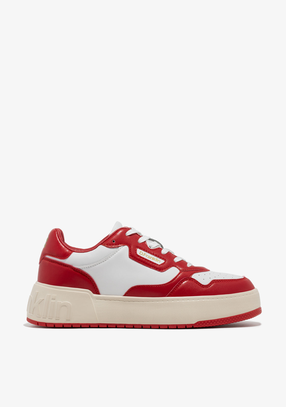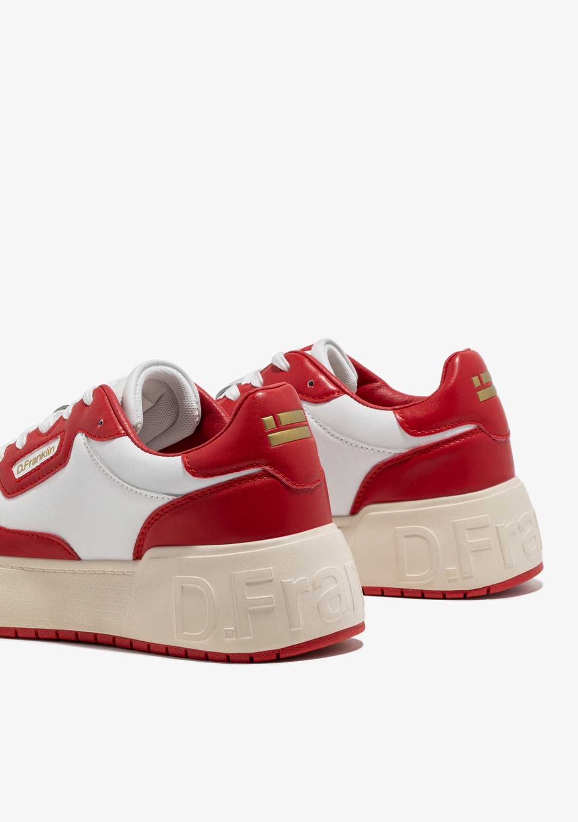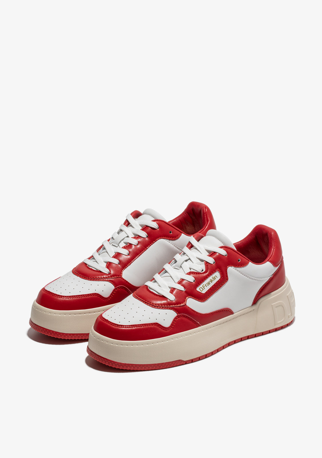 Die weißen Court D.Franklin Sneakers sind mit roten Akzenten und Baumwollschnürsenkeln gefertigt. Die kontrastierende Sohle verfügt über ein geprägtes Logo sowohl an der Ferse als auch an der Sohle. Sie haben eine Höhe von 4 cm und eine Phylon-Sohle für leichte Dämpfung.