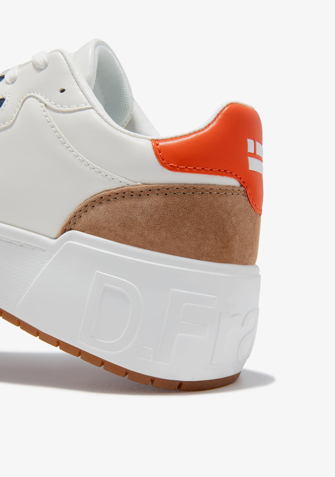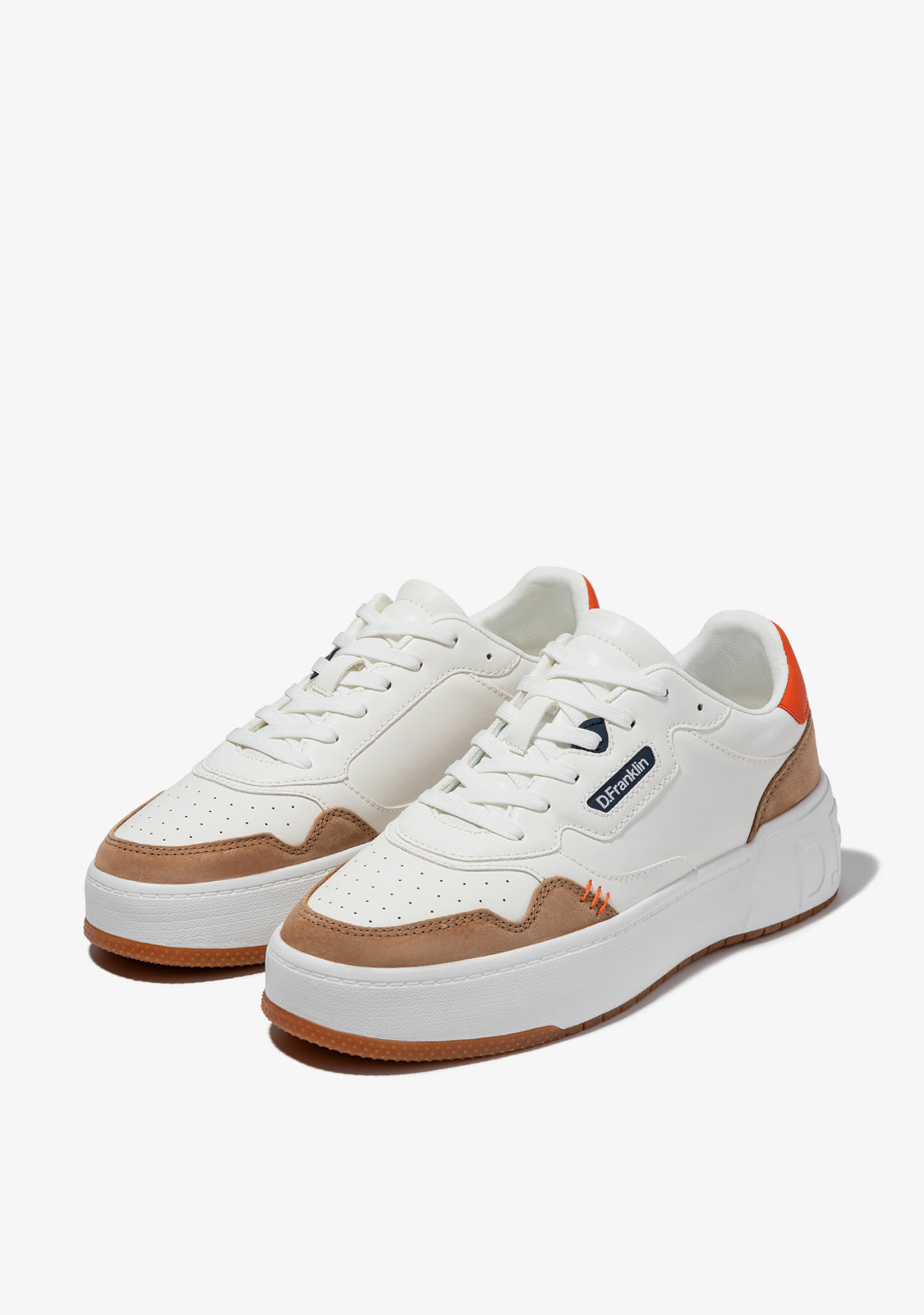 Unser Court-Modell ist mit marineblauen, orangefarbenen und braunen Details gefertigt. Außerdem mit passender Stickerei und dreifacher Naht. Die Sohle verfügt über ein geprägtes Logo an der Ferse, Sohle und Seite. Mit einer Höhe von 4 cm und einer Phylon-Sohle für leichte Dämpfung. Darüber hinaus ist die Innensohle anatomisch und herausnehmbar.