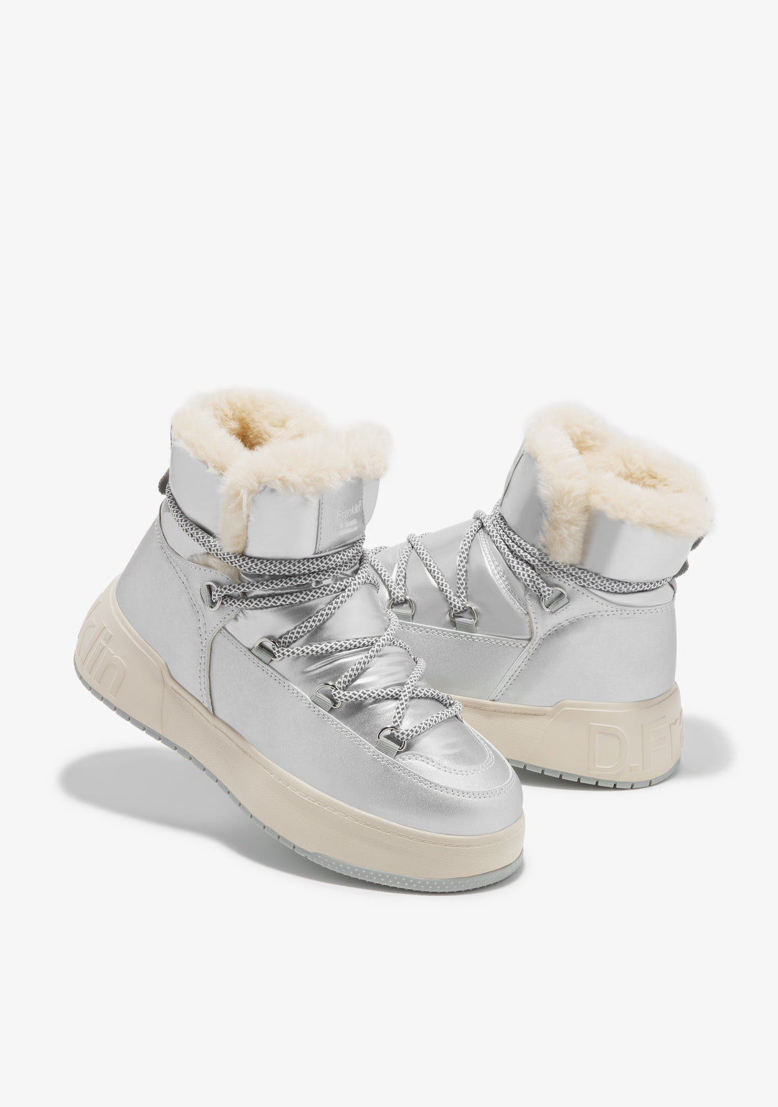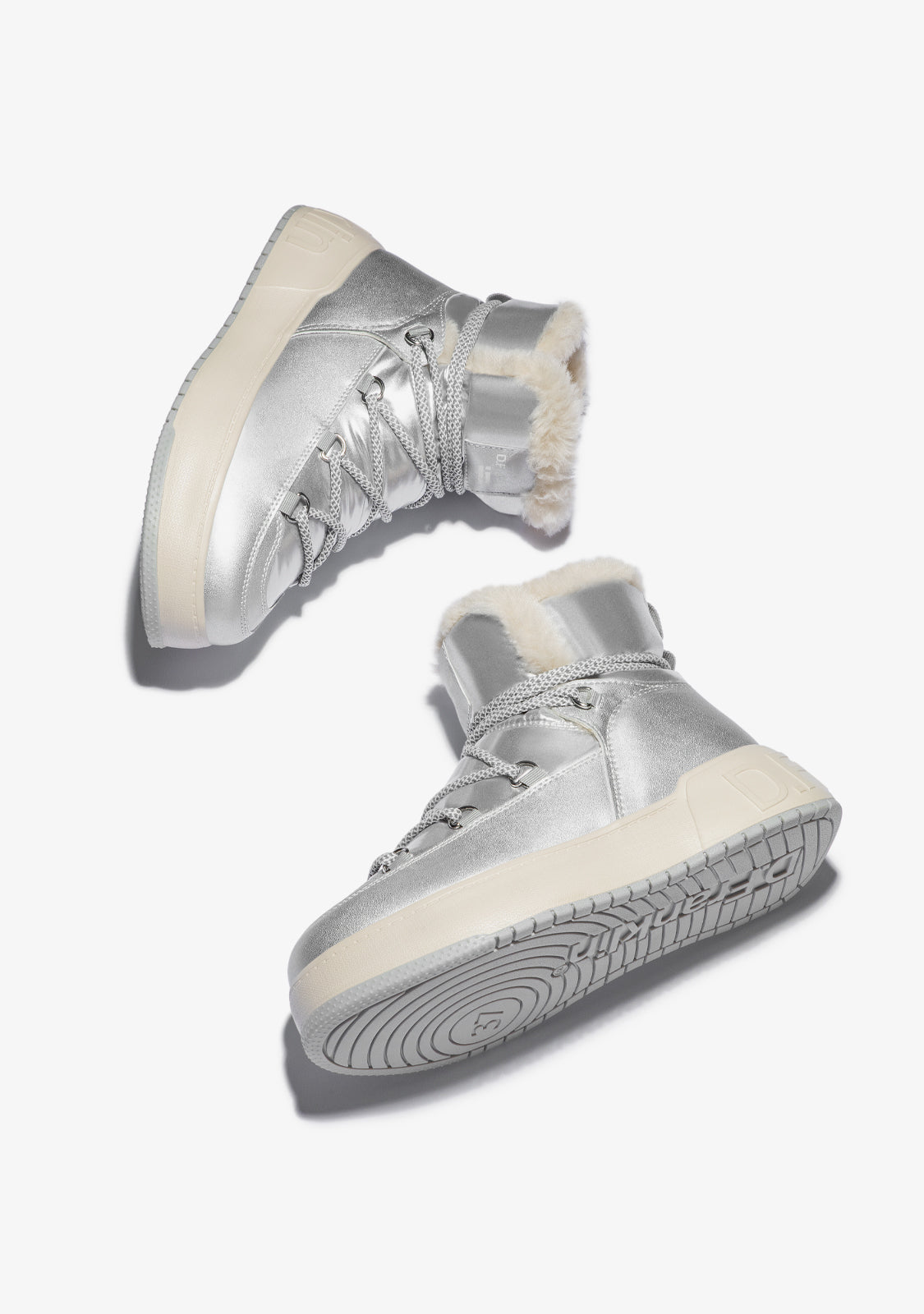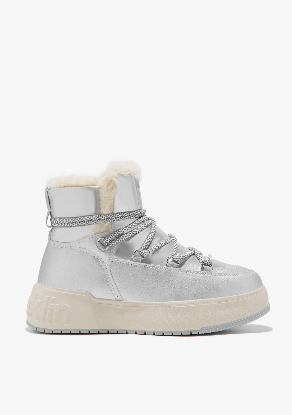 Bereiten Sie sich auf den Winter mit unseren Fell innen Stiefeln vor. Dieses silberfarbene Modell verfügt über reflektierende Mehrposition-Schnürsenkel für Grip und Dämpfung.