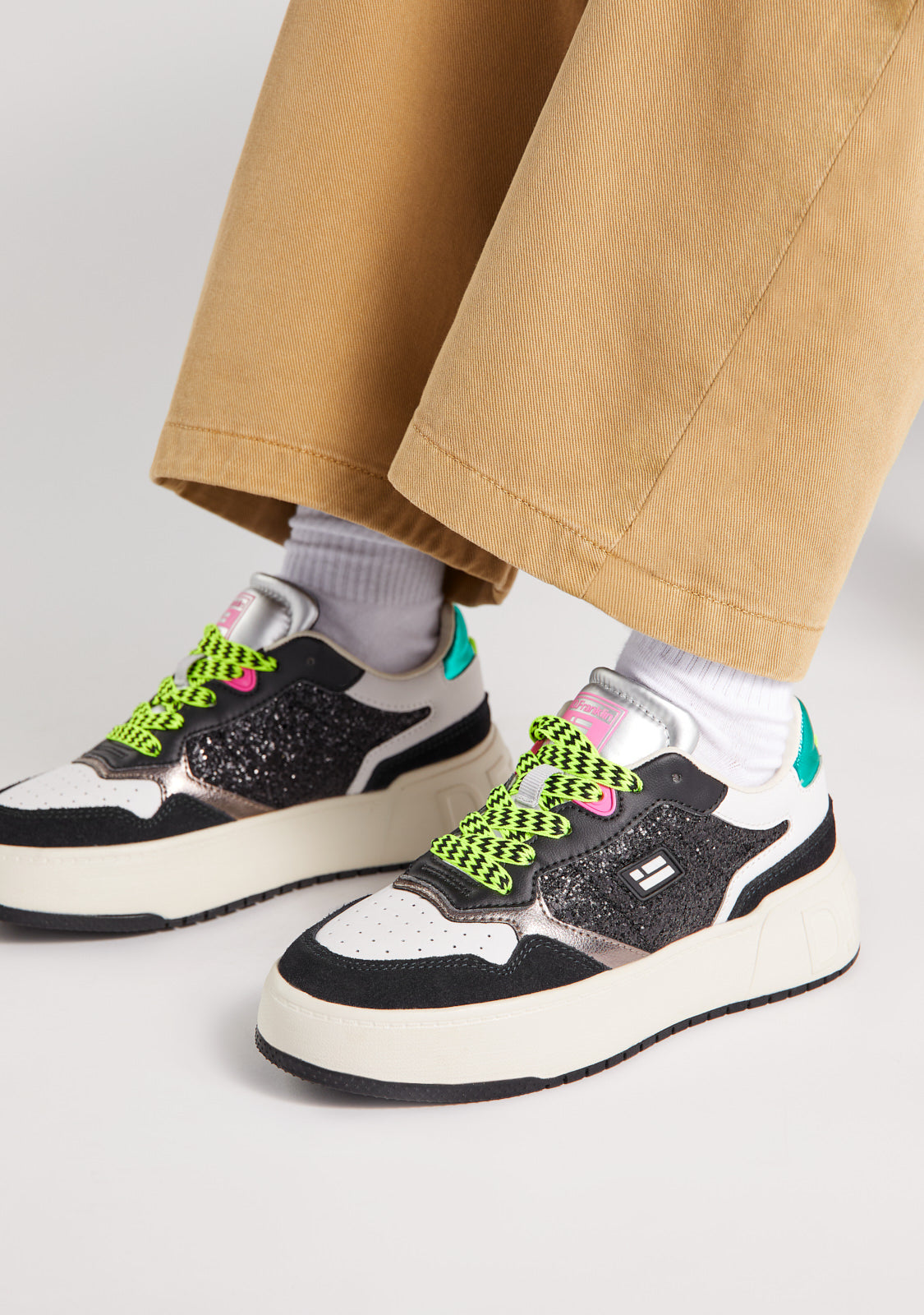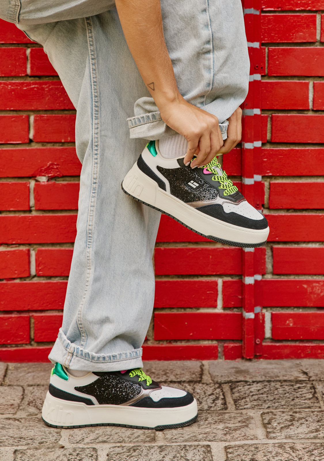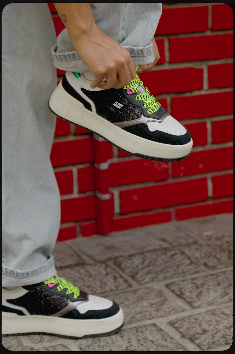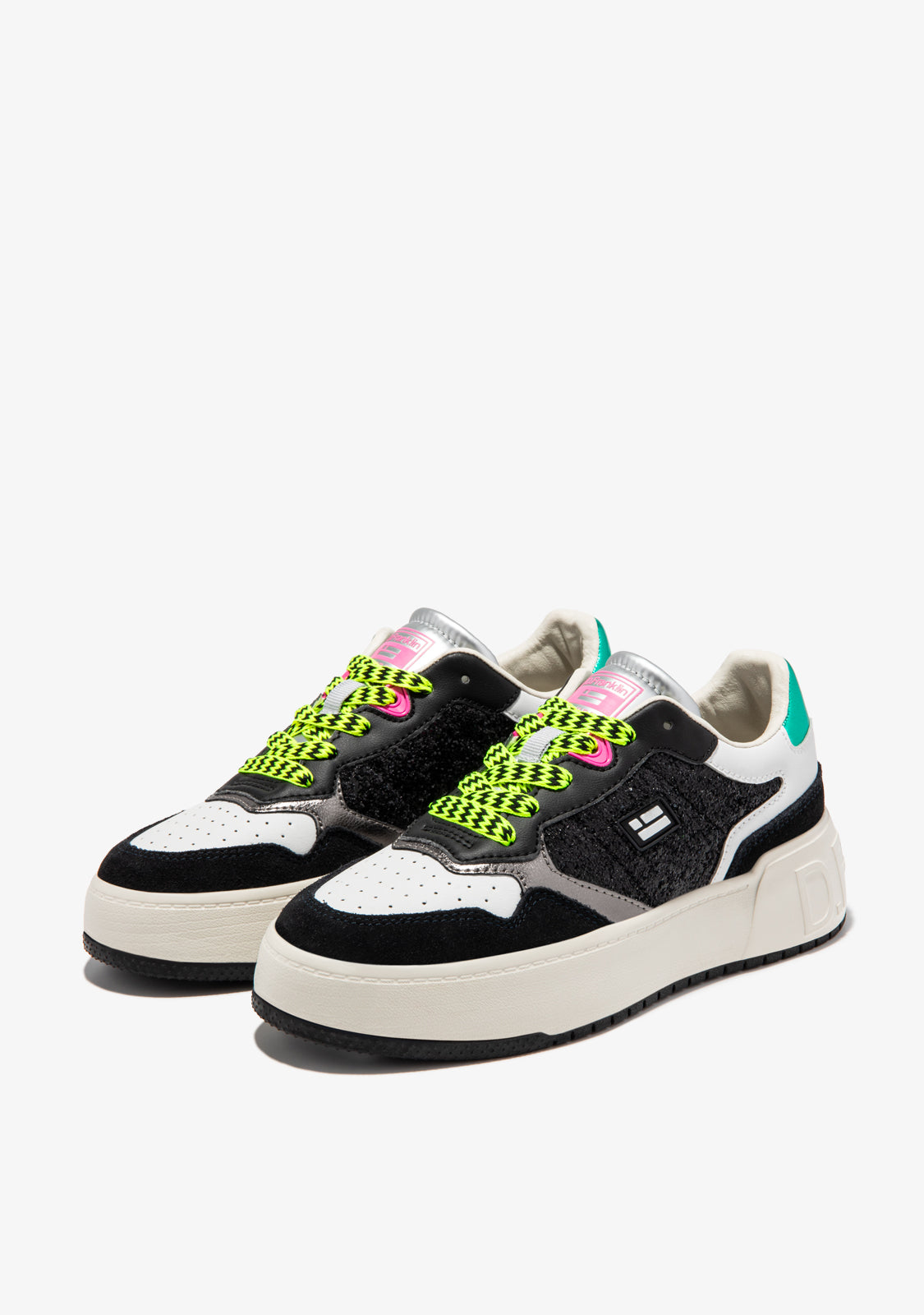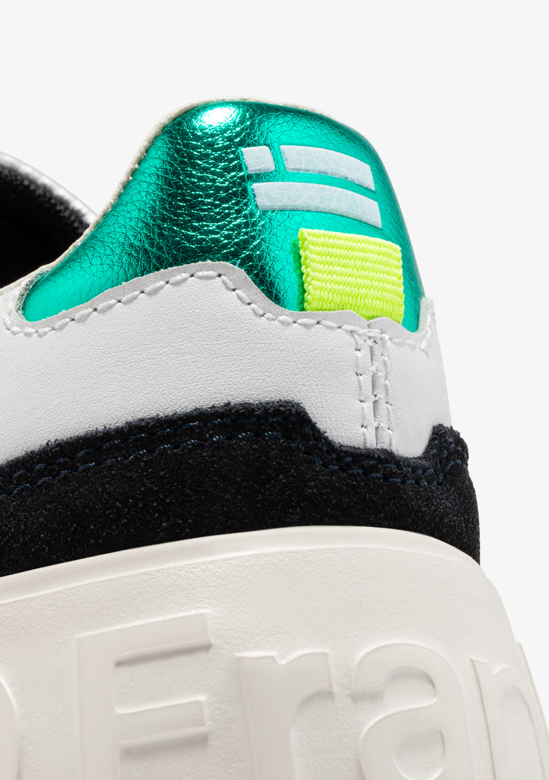 Das Modell Court D.Franklin ist mit Fluorfarbtönen, Glitzer und bedruckten Schnürsenkeln gefertigt. Sie haben eine kontrastierende schwarze Sohle mit eingeprägtem Logo sowohl an der Ferse als auch an der Sohle. Außerdem verfügen sie über eine weiße Flagge an der Seite. Mit einer Höhe von 4 cm und einer Phylon-Sohle für leichte Dämpfung. Das anatomische Fußbett ist ebenfalls herausnehmbar.