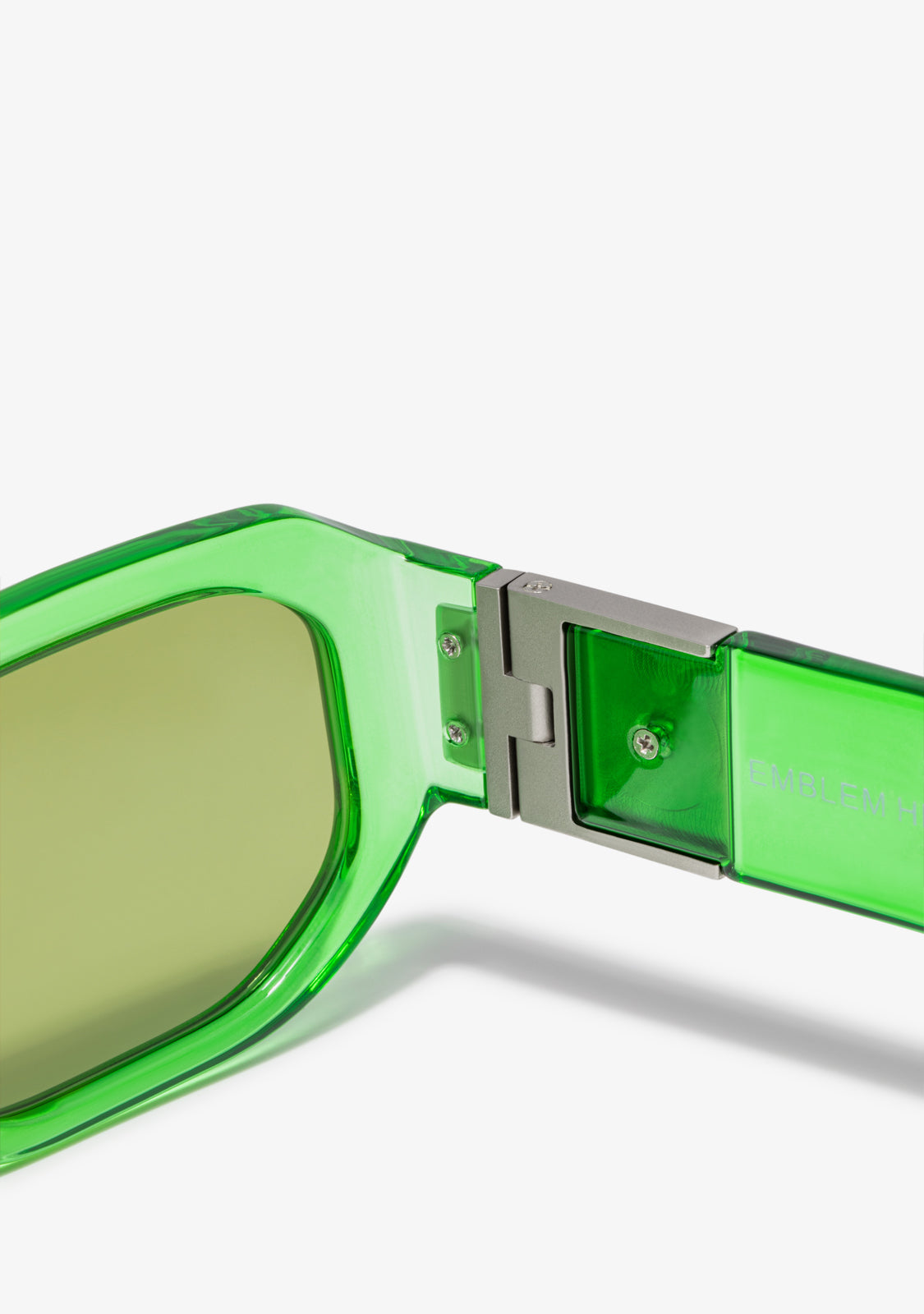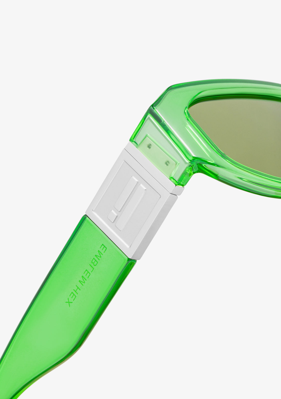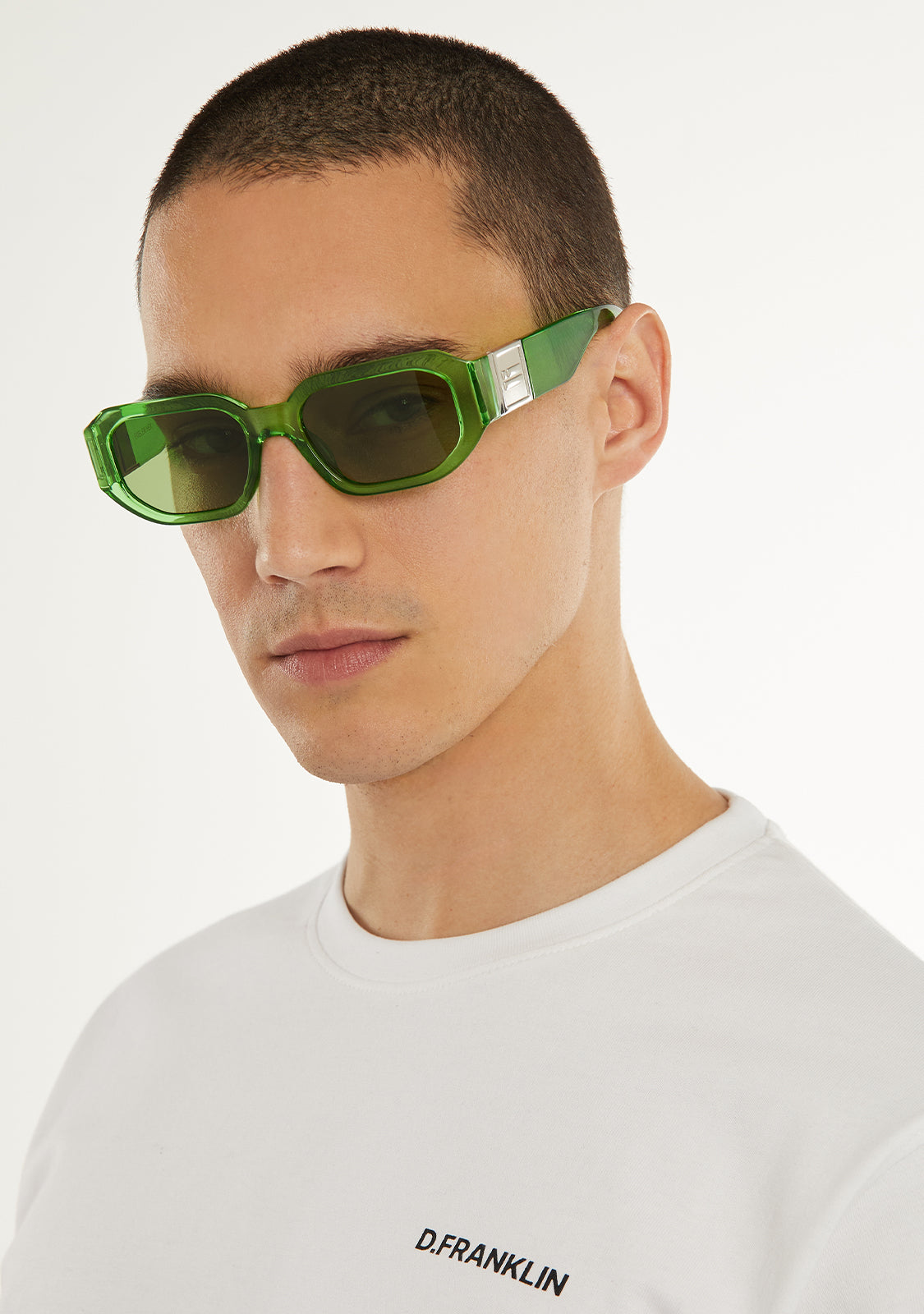 Grüne polarisierte Gläser und passender Rahmen heben die Einzigartigkeit dieses Designs hervor. Es verfügt über unsere markante D.Franklin-Flagge mit einem metallischen Gold-Finish an beiden Bügeln. Die Linsenbreite von 52 mm und der vordere Rahmen von 139 mm sind mit einem asymmetrischen 140 mm langen Bügel verbunden.