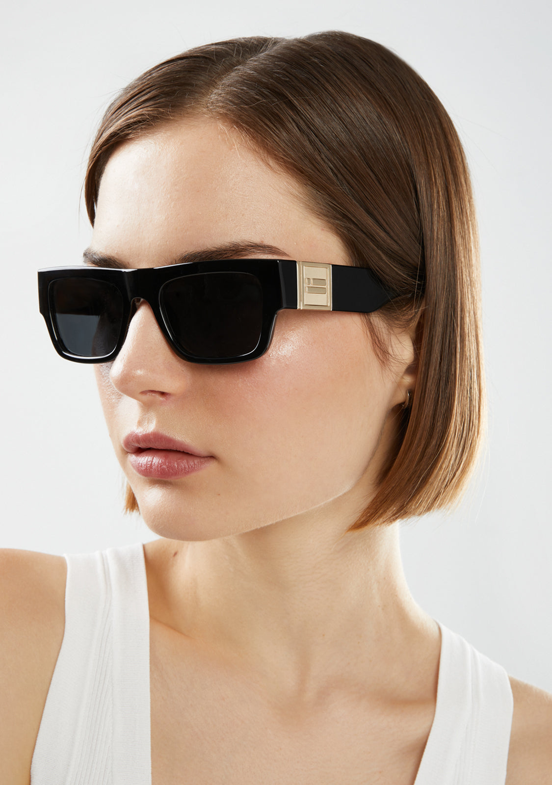 Lineare Frontsonnenbrille. Ein Modell, das die urbane Ästhetik in einem rechteckigen Rahmen einfängt. Der wahre Star für Ihre gewagtesten Outfits. Mit metallischen Details, die Ihre Gesichtszüge betonen.