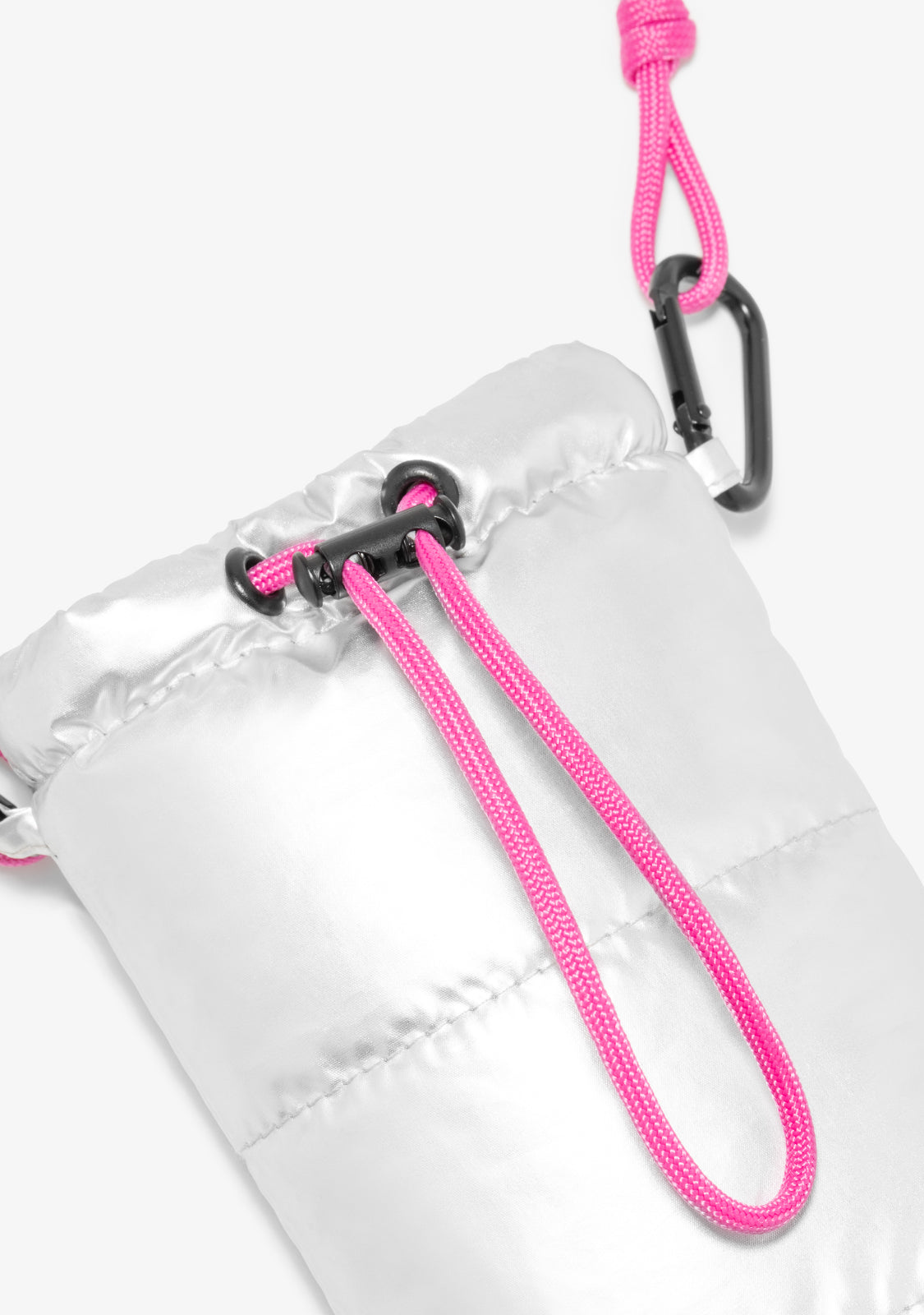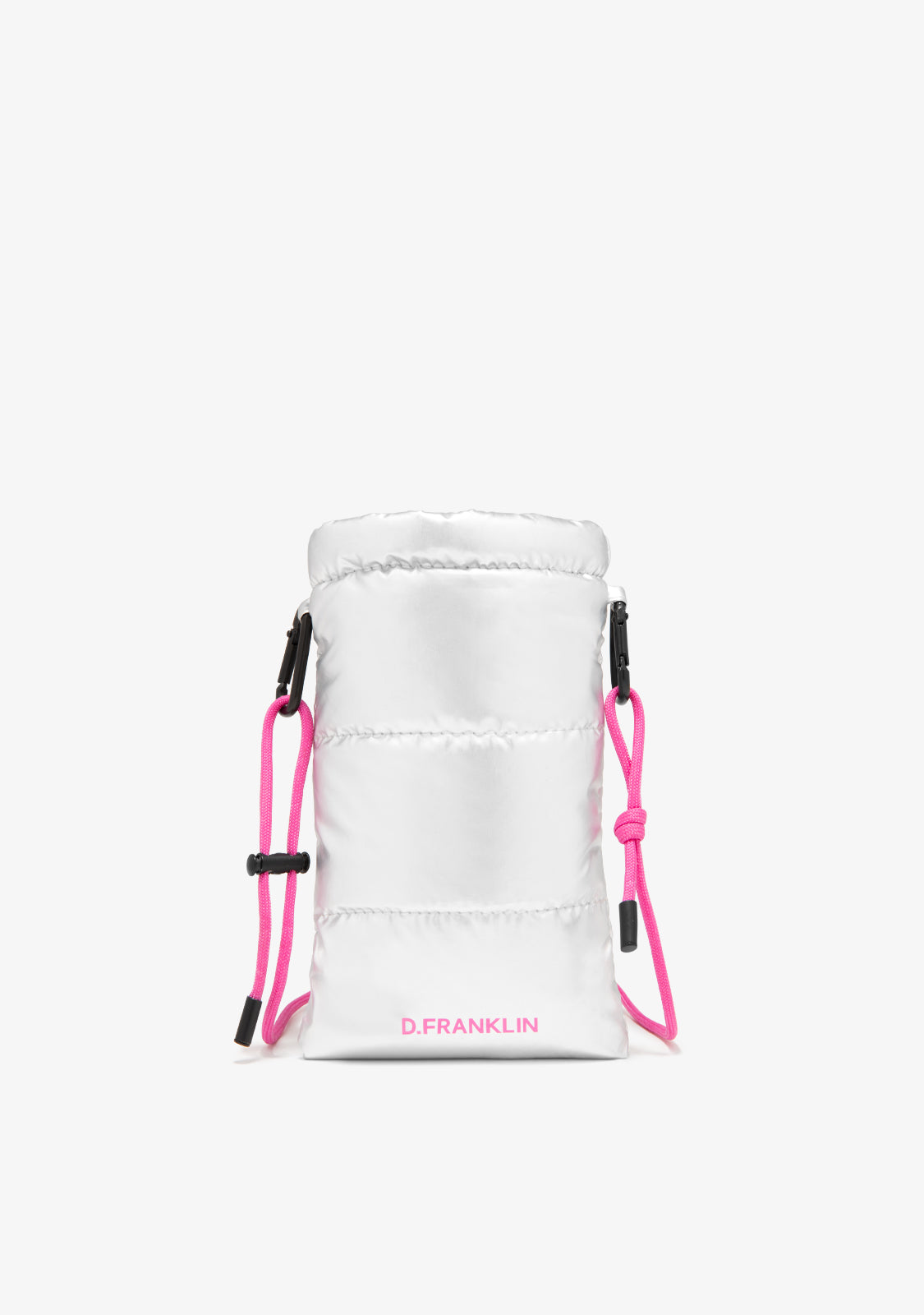 Dieses Modell mit silberner Oberfläche hat eine abnehmbare fuchsiafarbene Schnur, dank seiner Karabiner, die es ermöglichen, die Länge anzupassen. Es hat einen verstellbaren Verschluss und ein fuchsiafarbenes D.Franklin-Logo, das auf der Vorderseite aufgedruckt ist.
