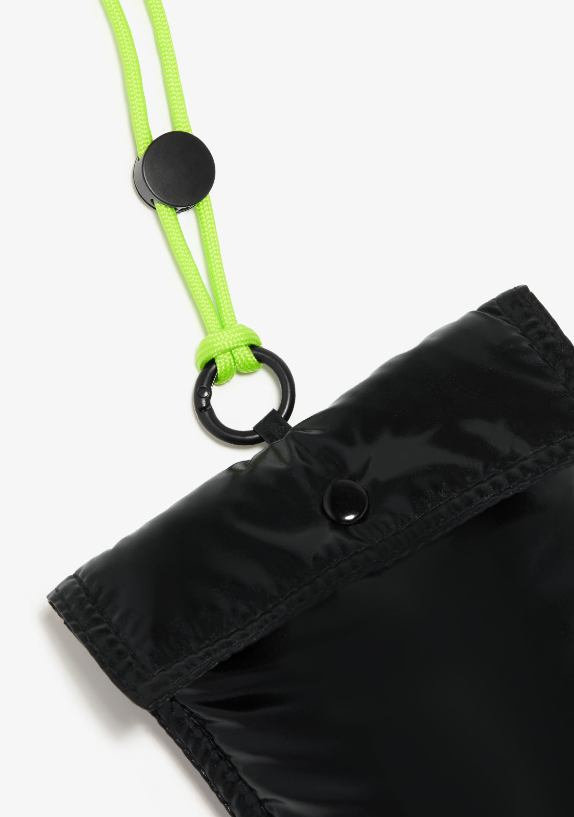 Dieses Modell mit schimmerndem schwarzen Finish hat eine abnehmbare limonengrüne Schnur, dank des Metallrings, der es Ihnen ermöglicht, die Länge anzupassen. Es verfügt über einen Knopfverschluss und ein limonengrünes, siebbedrucktes D.Franklin-Logo auf der Vorderseite.