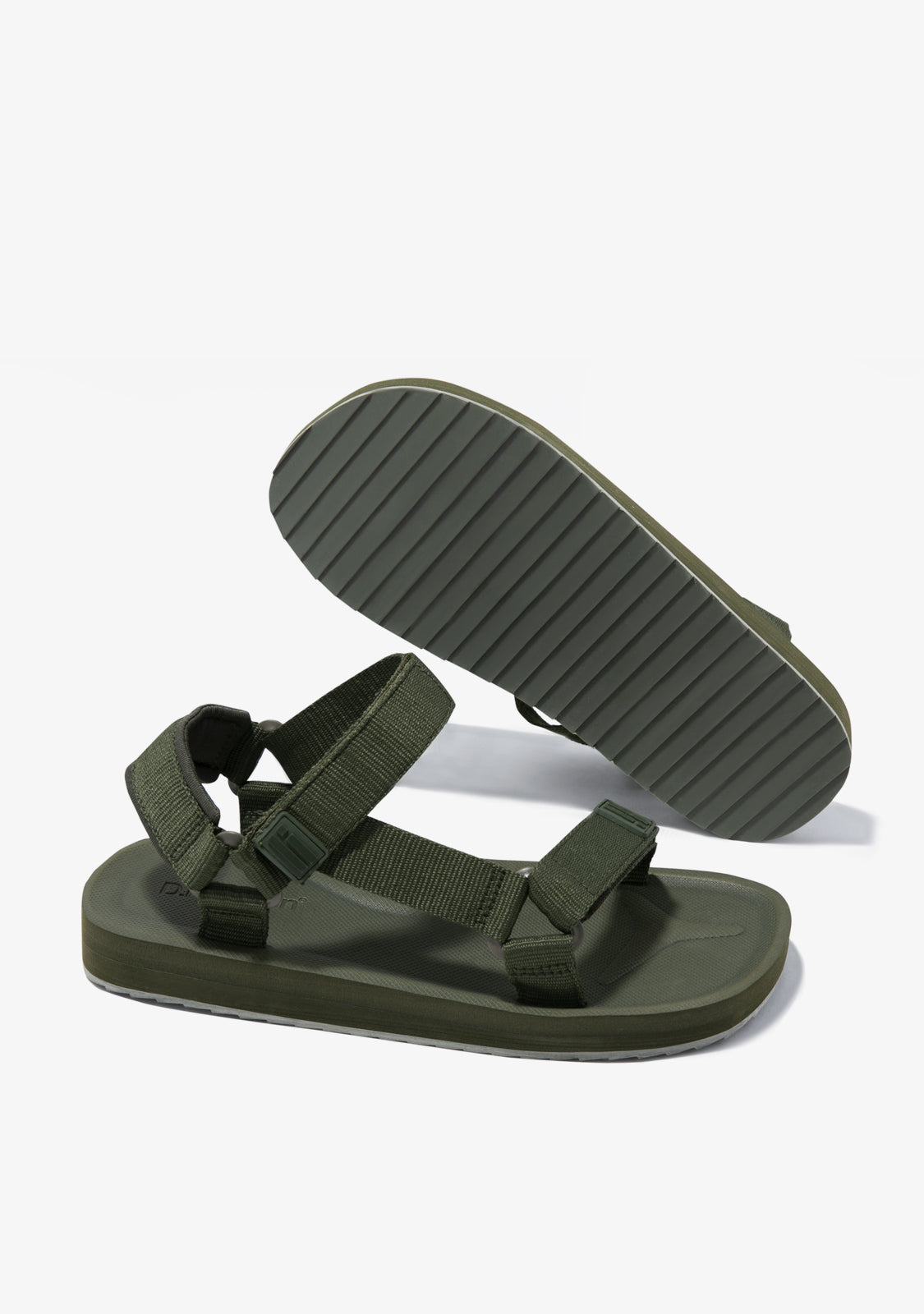 Eine Flucht aus der Stadt. Eine Auszeit vom Alltag. Ein Design, um neue Orte fernab des Vertrauten zu entdecken. Sportlicher Sandale mit khakifarbenem Klettverschluss. Hergestellt mit EVA Sohle für Komfort.