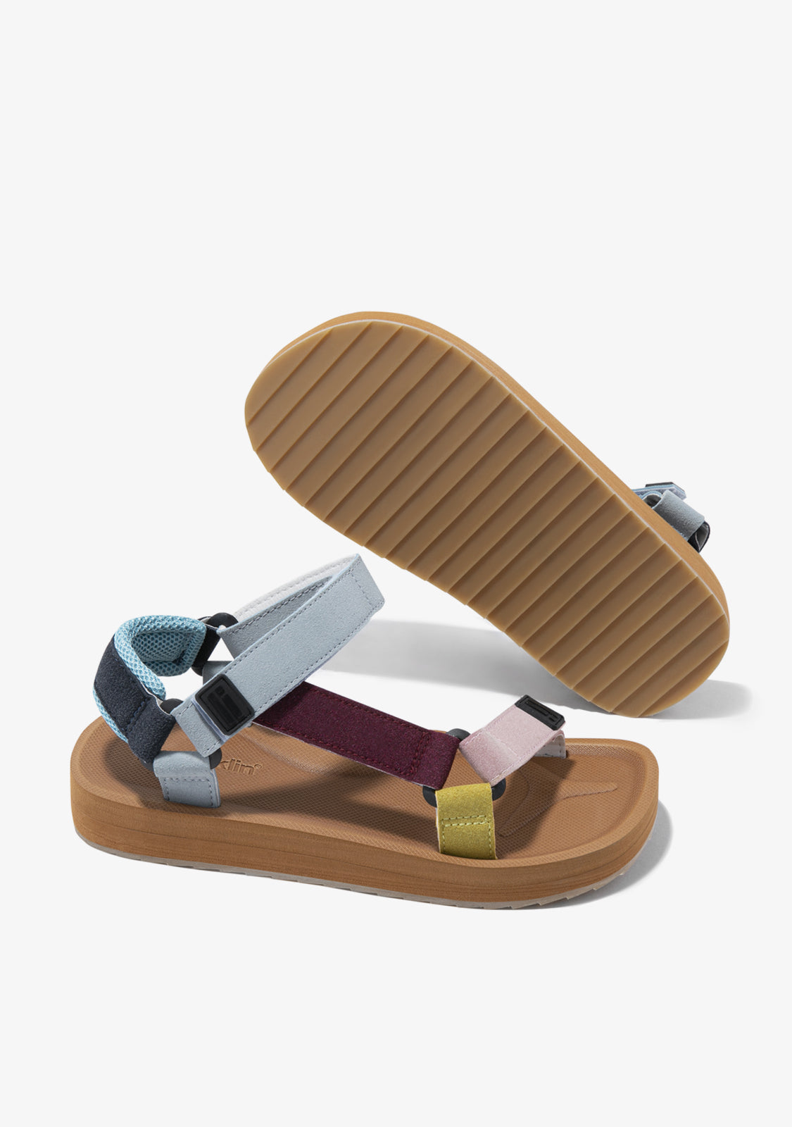 Eine Flucht aus der Stadt. Eine Auszeit vom Alltag. Ein Design, um neue Orte fernab des Bekannten zu entdecken. Sportlicher Sandale mit einem grauen, fuchsiafarbenen und gelben Kombinationsriemen, der auf einer braunen Sohle befestigt ist. Hergestellt mit EVA-Sohle für Komfort.
