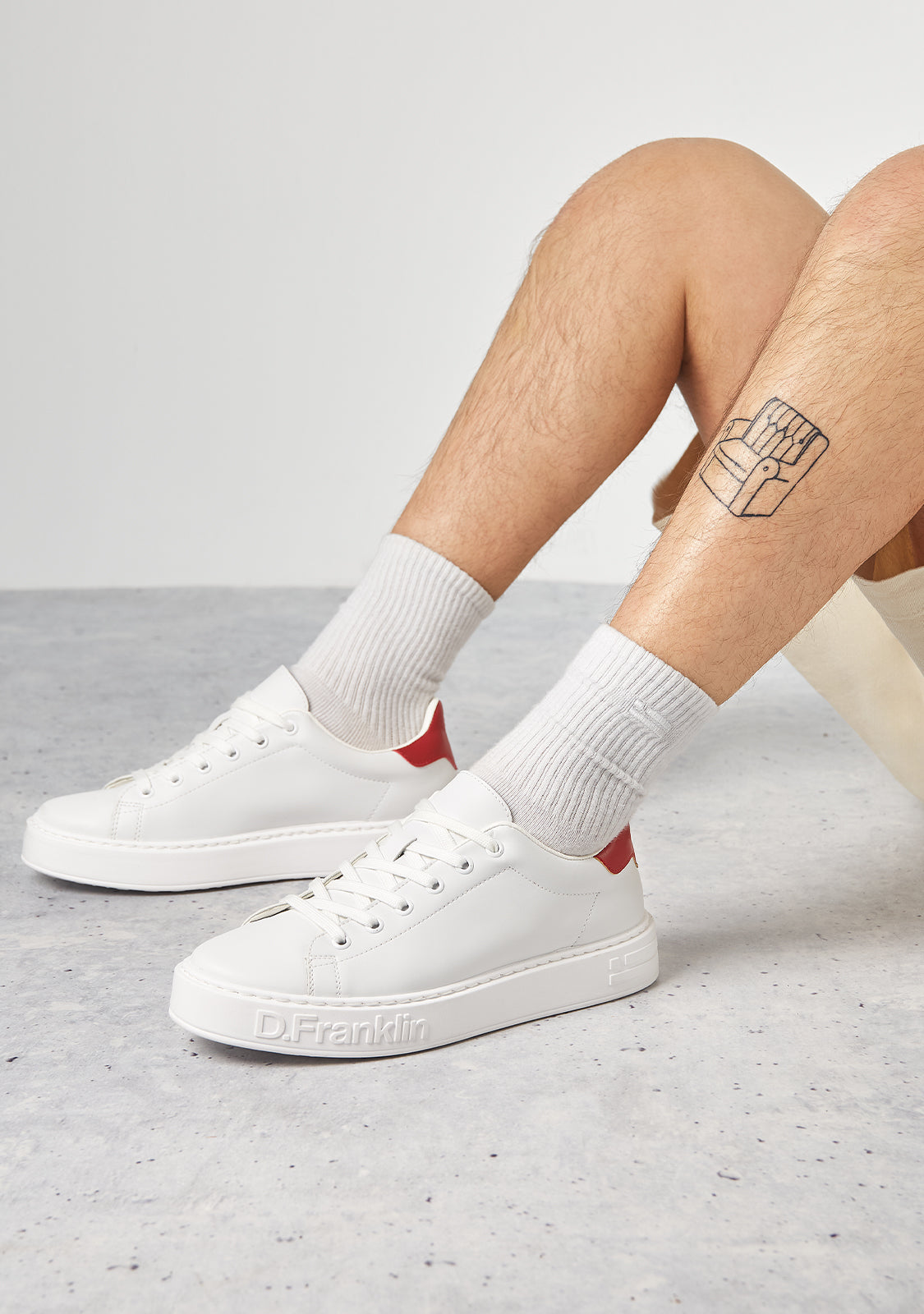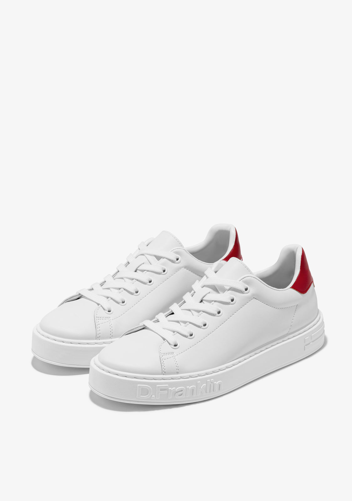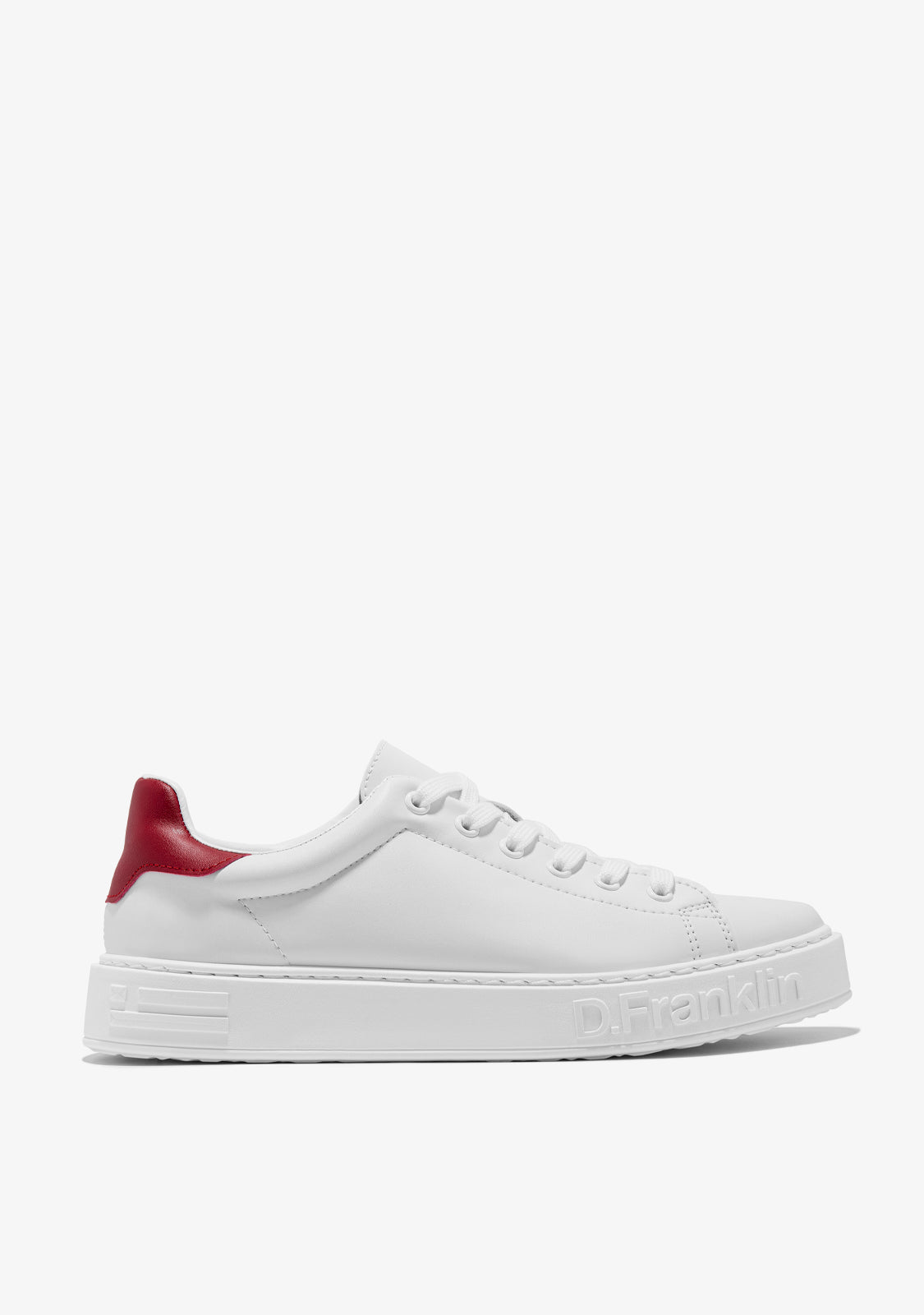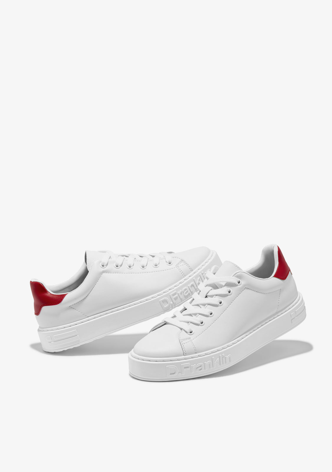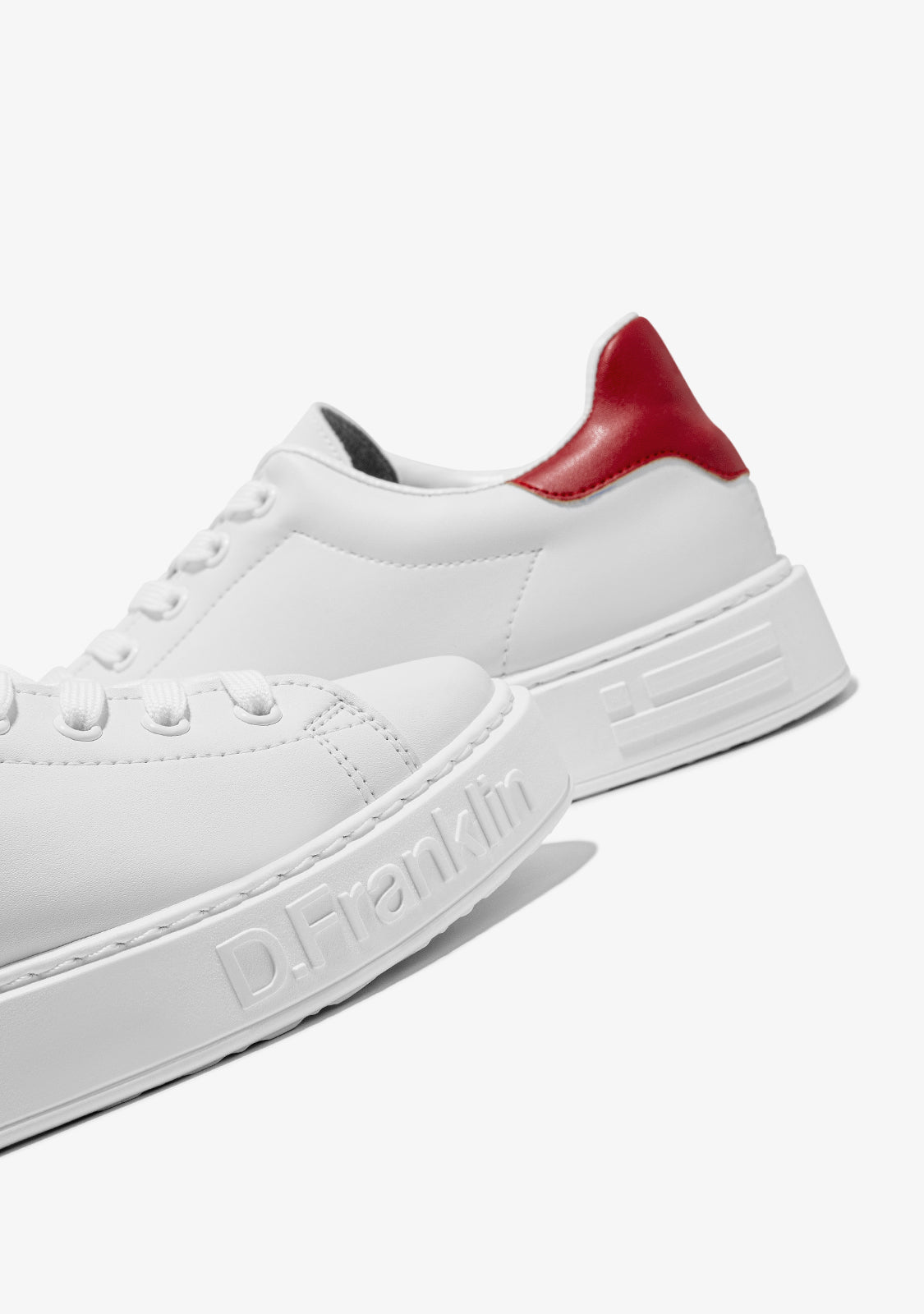 Die D.Franklin Gumme 101 Schuhe atmen die Energie der großen Hauptstädte mit einem einfachen Design aus weißem Kunstleder und roten Details. Sie verfügen über eine 3,5 cm hohe Sohle für leichte Dämpfung bei jedem Schritt. Mit verstellbaren Baumwollschnürsenkeln für eine perfekte Passform.