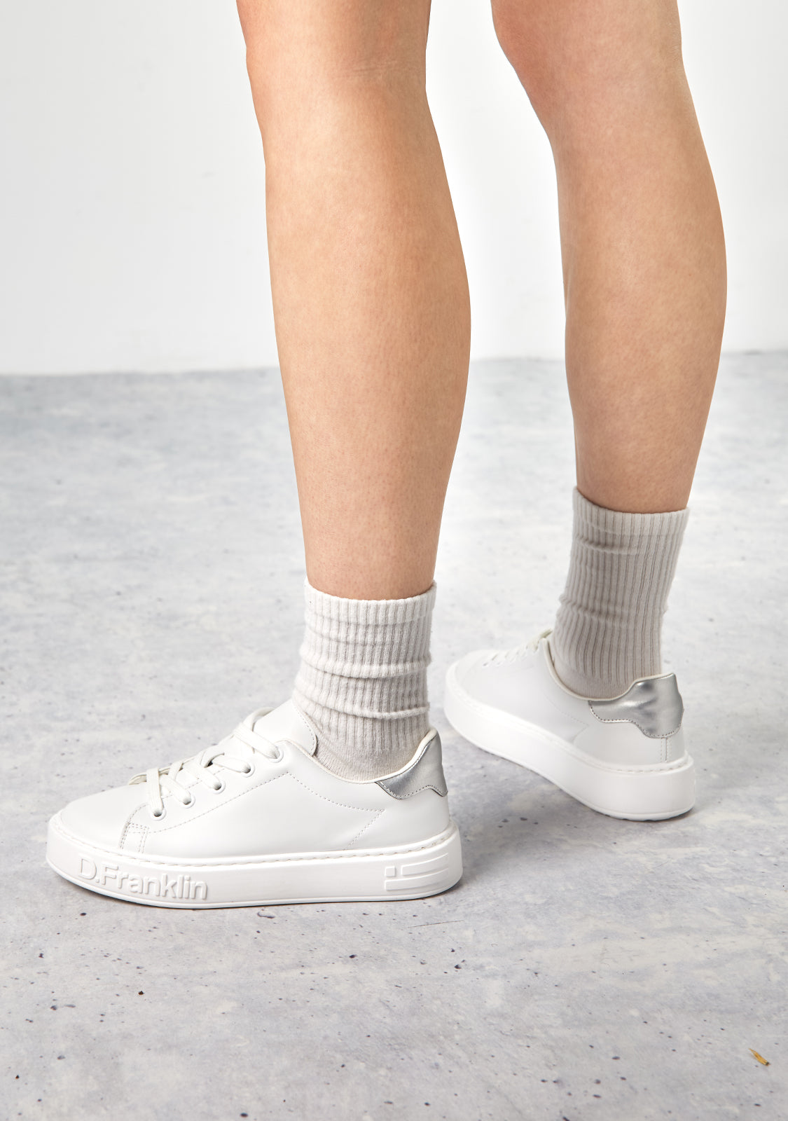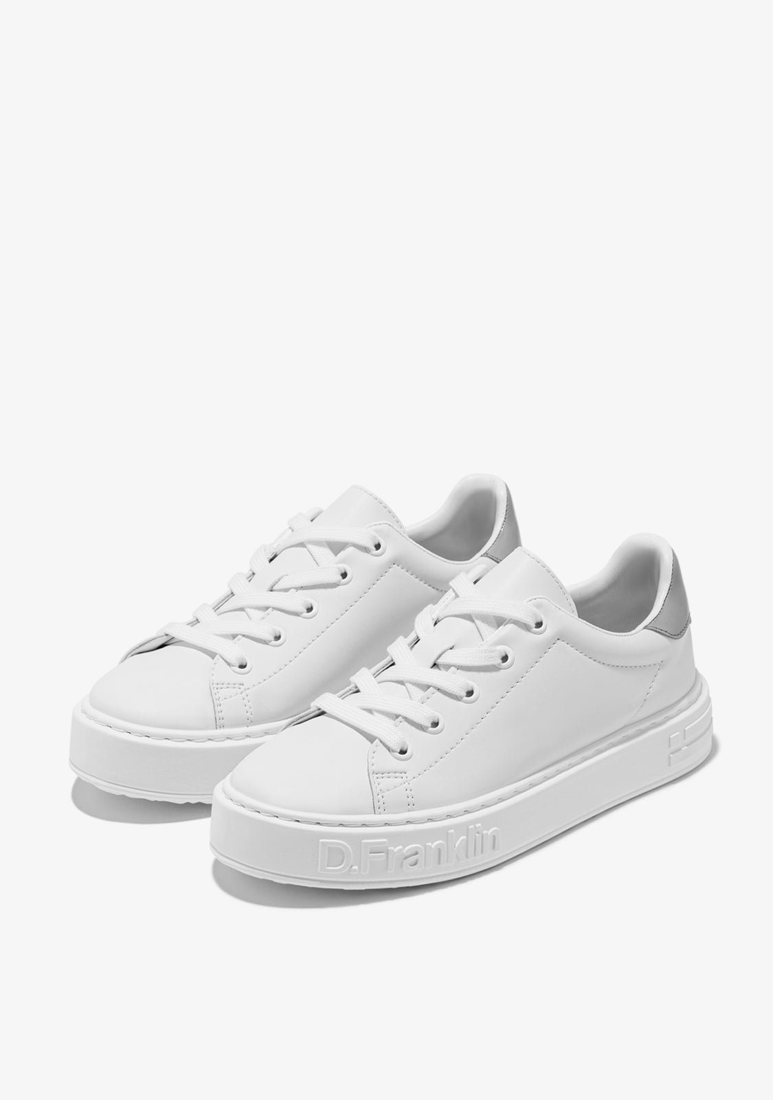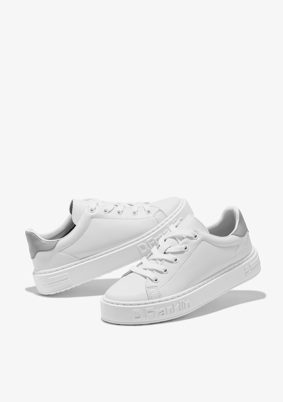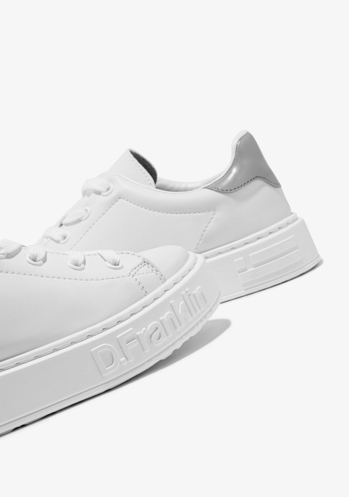 Die D.Franklin Gumme 101 Schuhe atmen die Energie der großen Hauptstädte mit einem schlichten Design aus weißem Kunstleder und silbernen Details. Sie verfügen über eine 3,5 cm hohe Sohle für leichte Dämpfung bei jedem Schritt. Mit verstellbaren Baumwollschnürsenkeln für eine perfekte Passform.