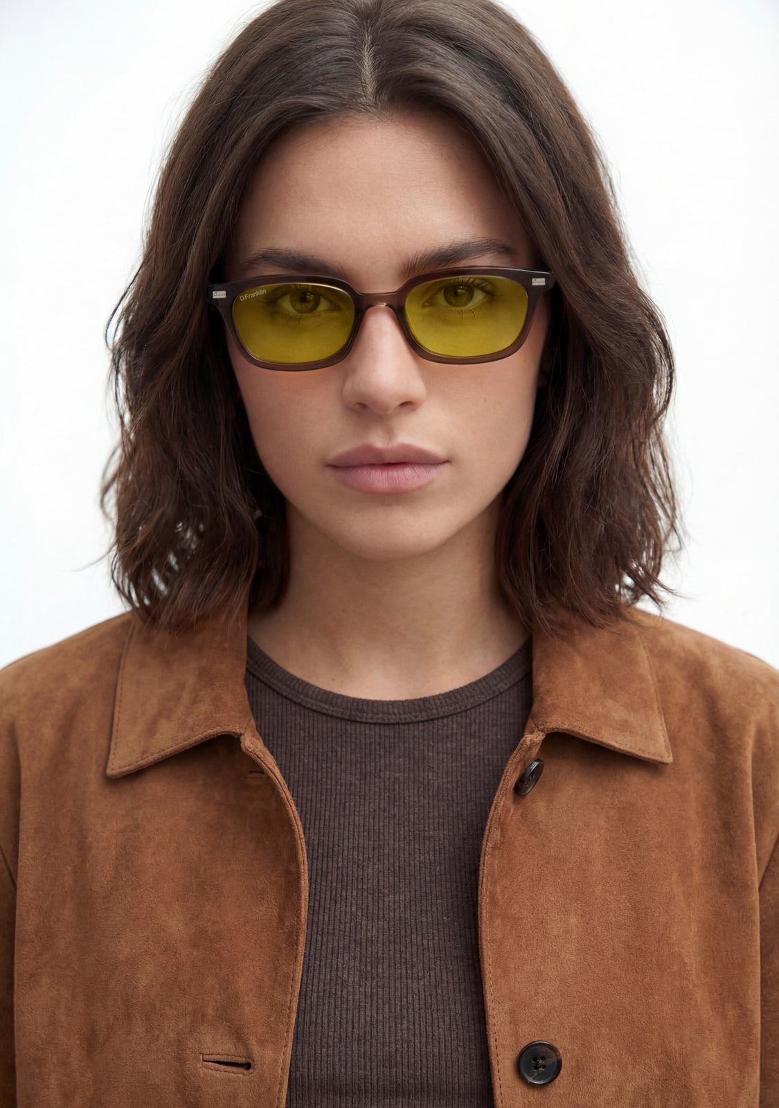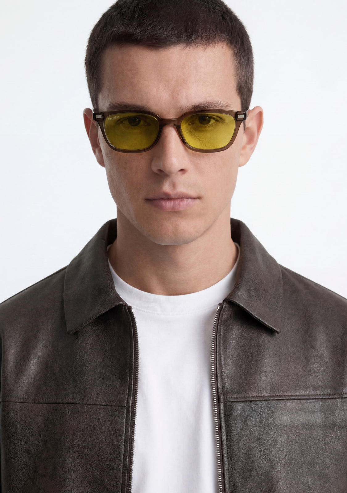 Die Hackney Dark Green / Yellow Sonnenbrille von D.Franklin kombiniert eine rechteckige, retroinspirierte Silhouette mit einem klaren, modernen Design. Ihre dunkelgrüne Fassung und gelben Gläser schaffen einen markanten Kontrast, der jedem Look einen modernen Akzent verleiht.