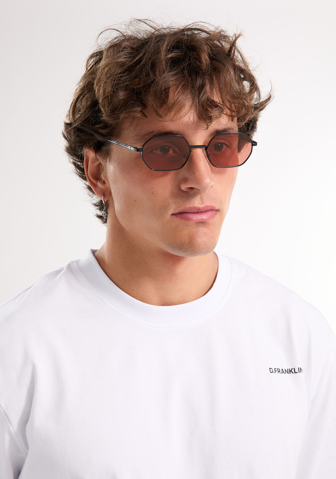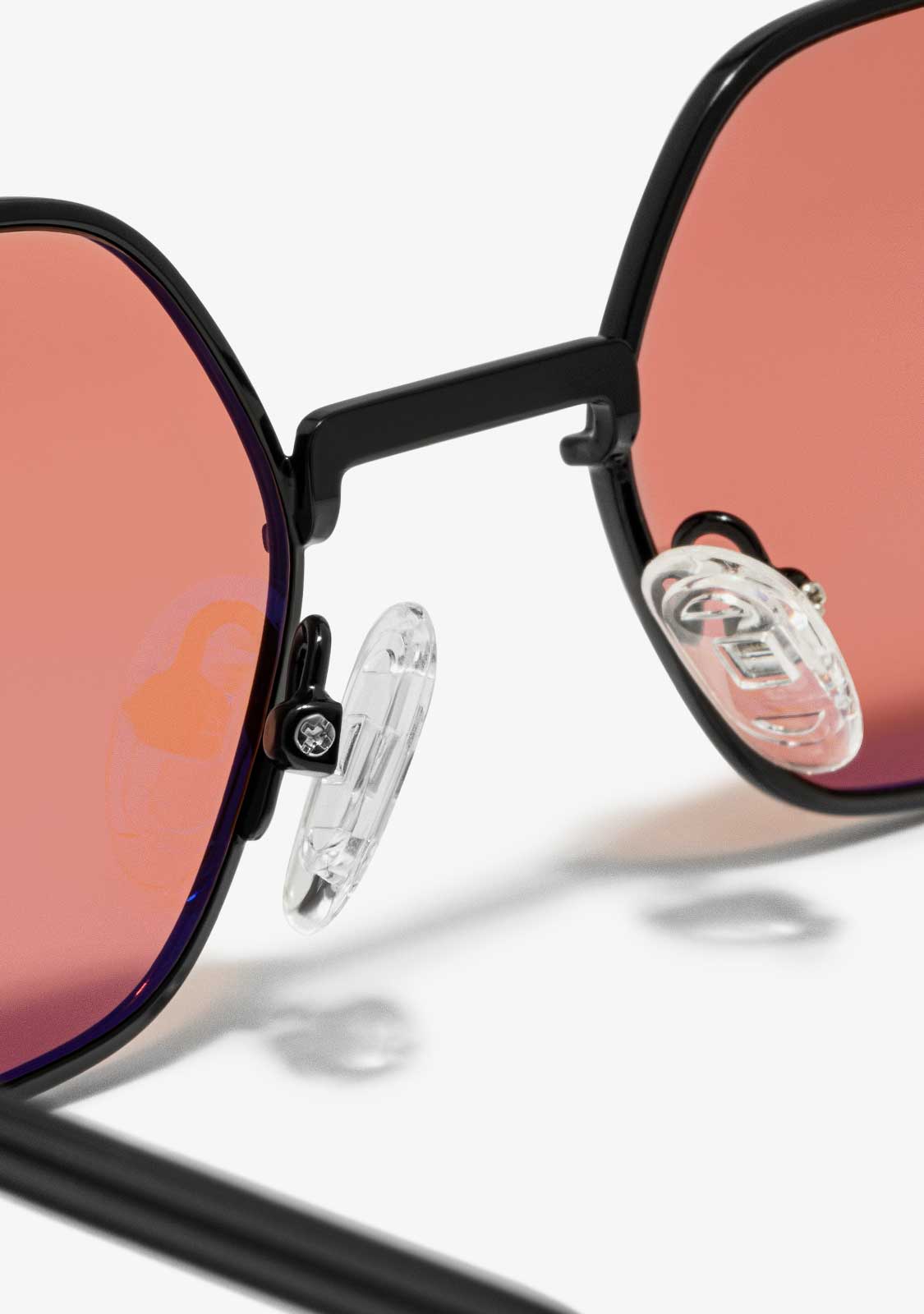 Das Square Legacy Design verfügt über ein metallisches Finish mit einer hexagonalen Ästhetik. Das schwarze Gestell wird mit roten, entspiegeltenden Gläsern kombiniert, die einen subtilen Blick durchlassen und die Gesichtszüge definieren. Die Front misst 141 mm, und die Glasbreite beträgt 54 mm. Die Bügel sind 140 mm lang und enthalten unsere charakteristischen Details. Ein retro, aber minimalistisches Stück, um jedes Outfit zu rahmen.