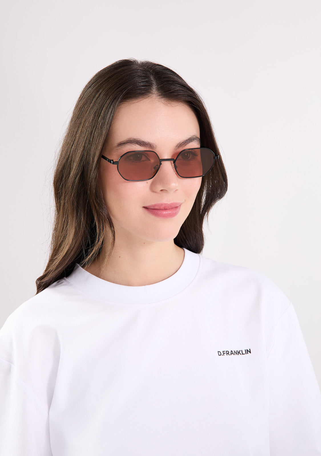 Translucente Sonnenbrillen mit einem geometrischen Design. Das Erbe der ikonischsten Stücke aus den 70er Jahren wird mit einer Auswahl moderner Details kombiniert.