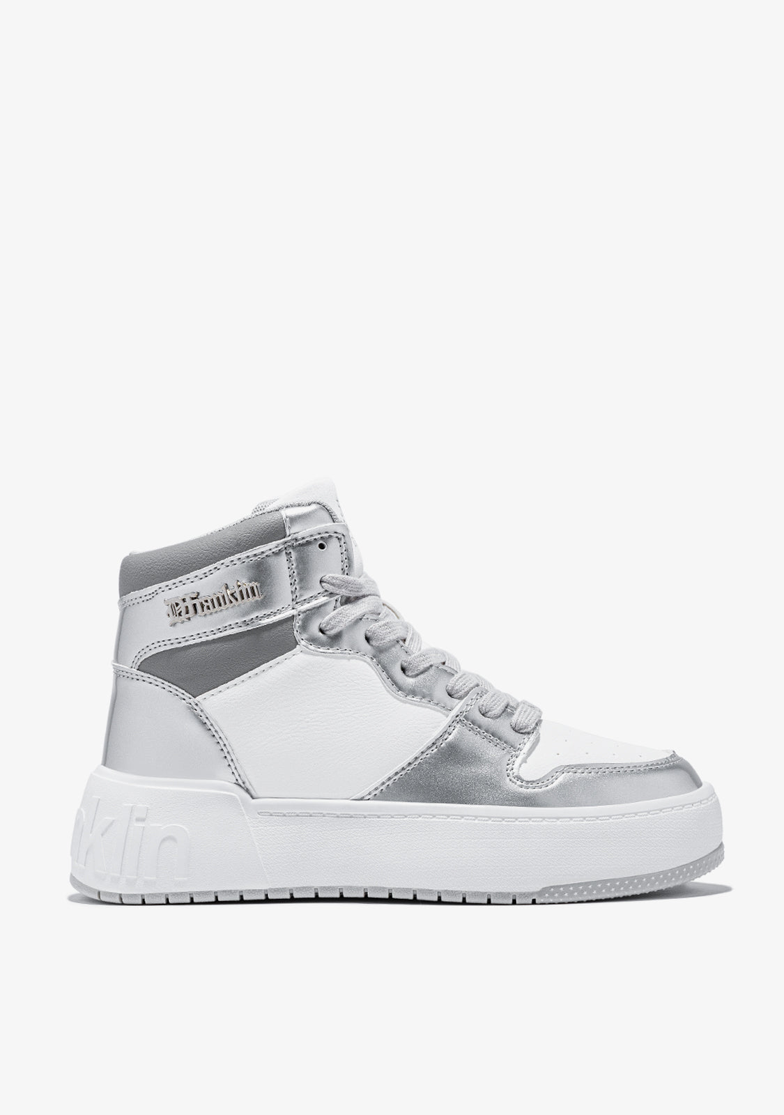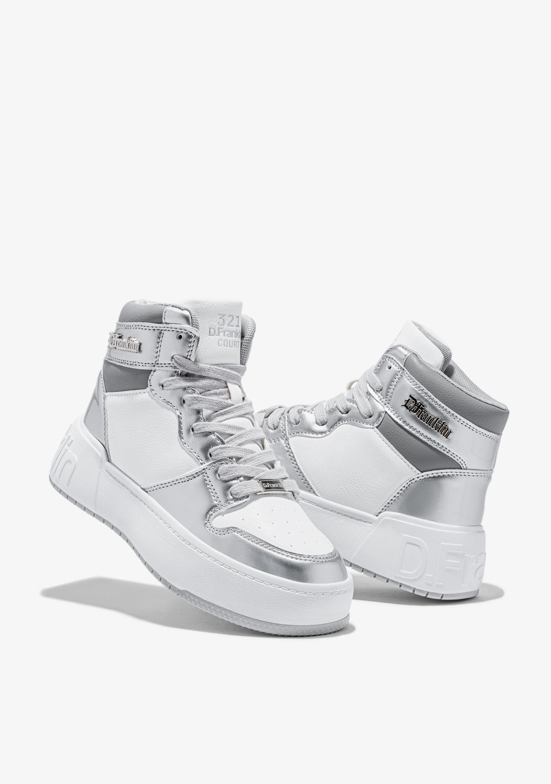 Präsentation D.Franklins Court Collection. Ein neues, sportlich inspiriertes Modell, das aus dem Feld geschaffen wurde, um ein mutiges und vielseitiges Design zu bieten. Jetzt mit einem Hi-Top-Design, das High Court White / Silver zeichnet sich durch eine Neuinterpretation der klassischen Schichtenlinie aus, mit einer Kombination aus Weiß und Silber.