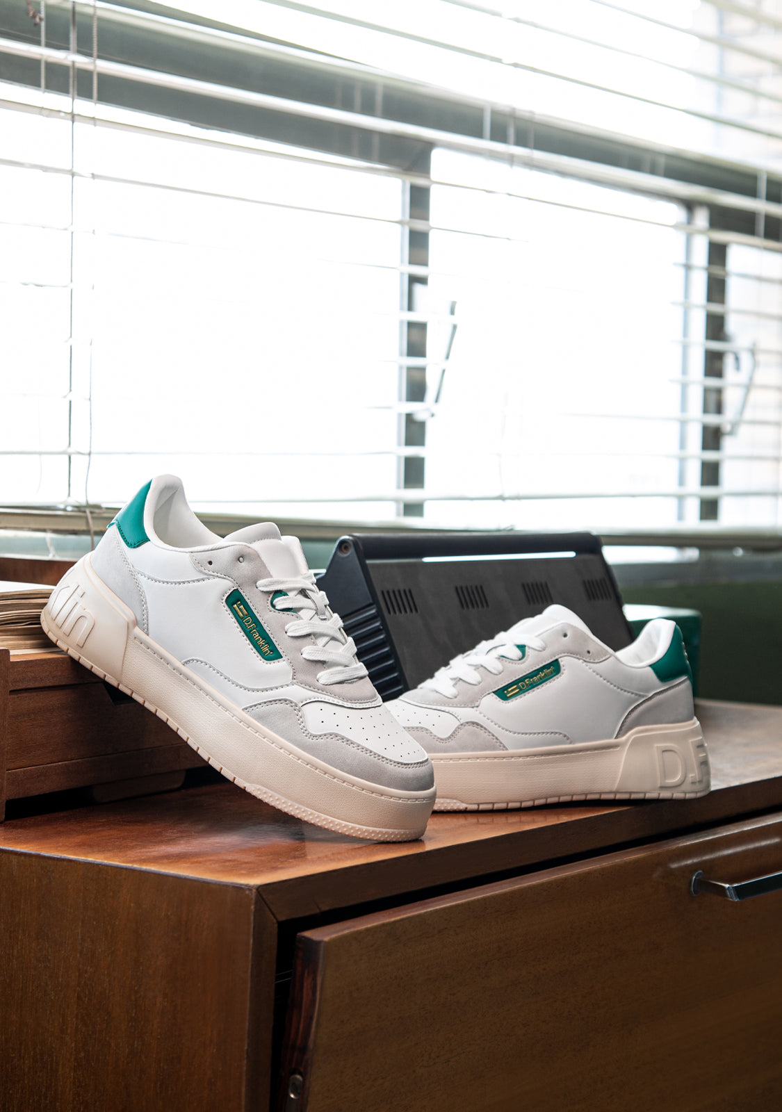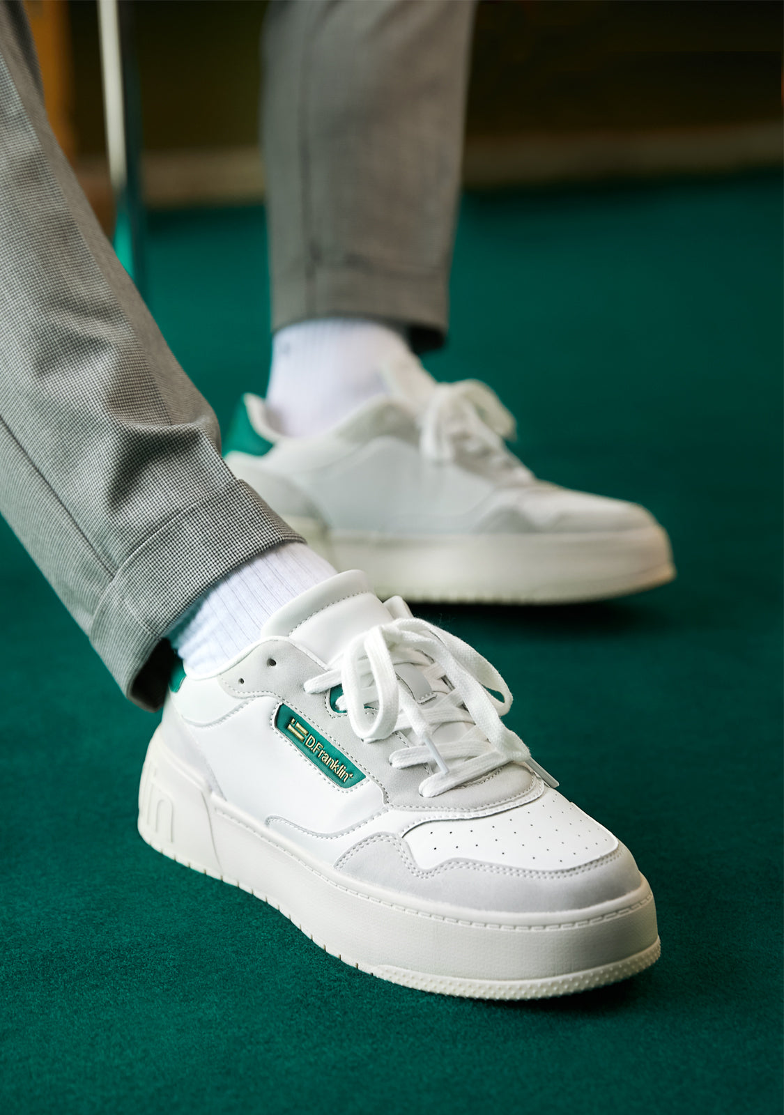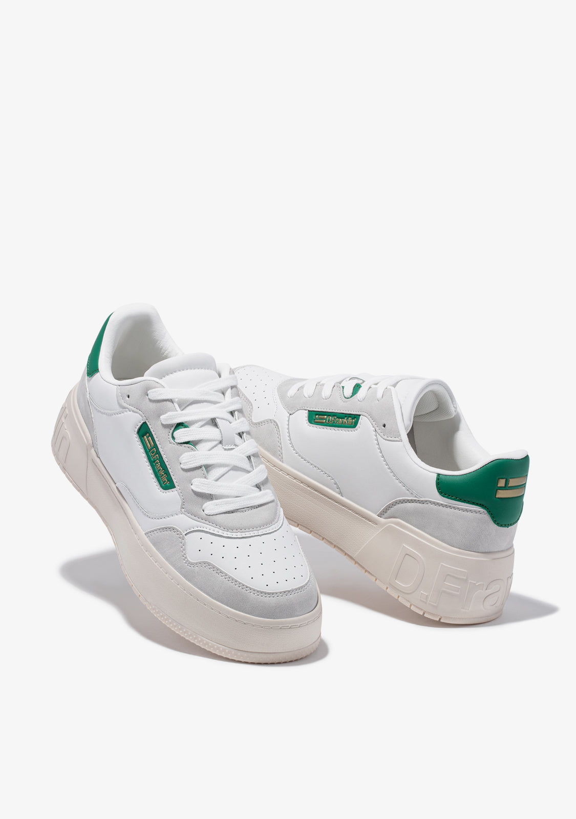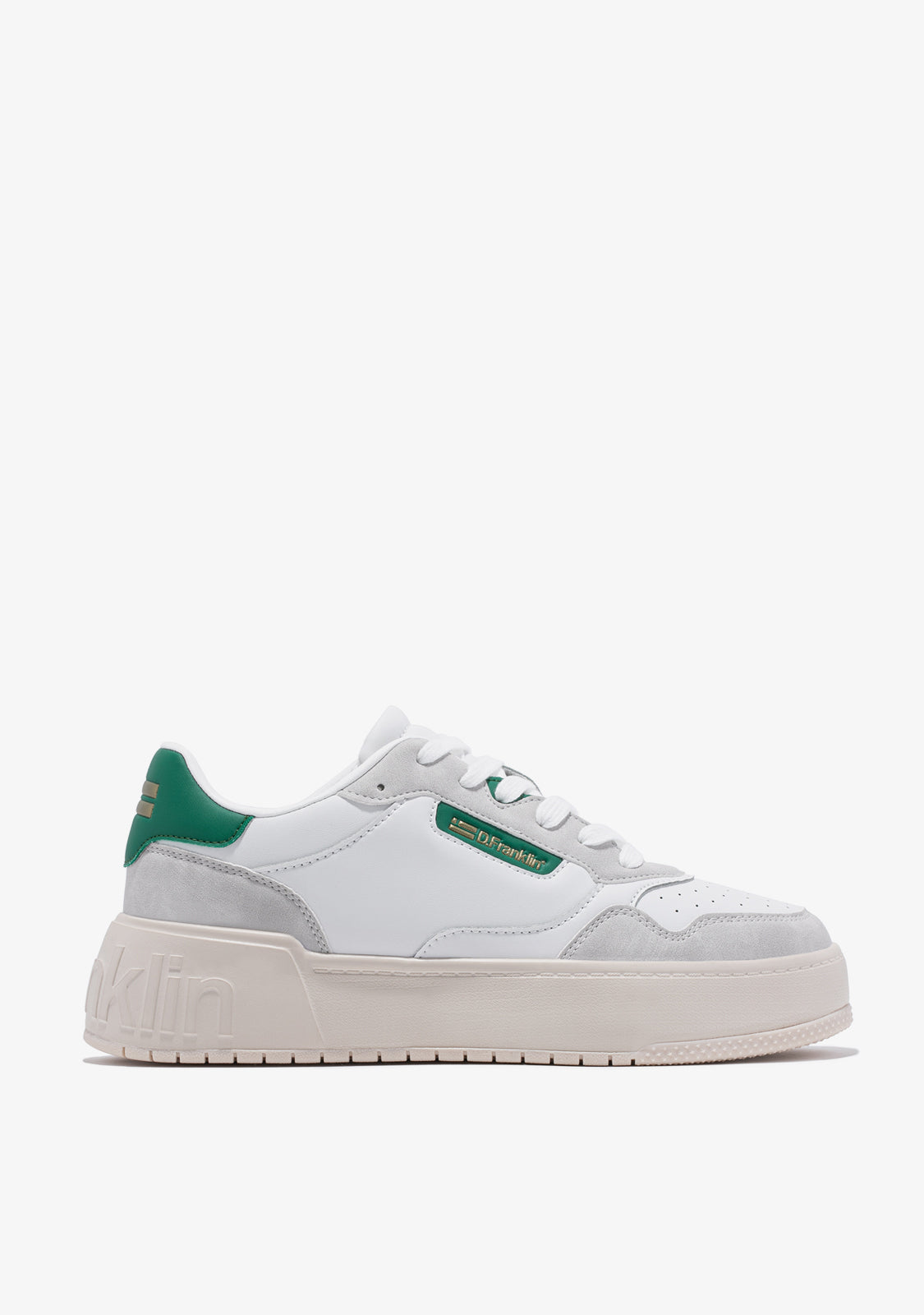 Ein verfeinerter Ansatz inspiriert von der '90er Basketballszene. Minimalistischer Trainer mit Ferse und D.Franklin-Emblem an der Seite in Goldton auf Grün. Kontrastierende graue Teile auf weißem veganem Kunstleder. Konstruiert mit Gummisohle. Prägung des D.Franklin Logos auf der Ferse. Baumwollschnürsenkel. 4 cm Sohle.