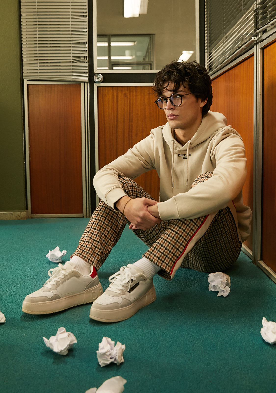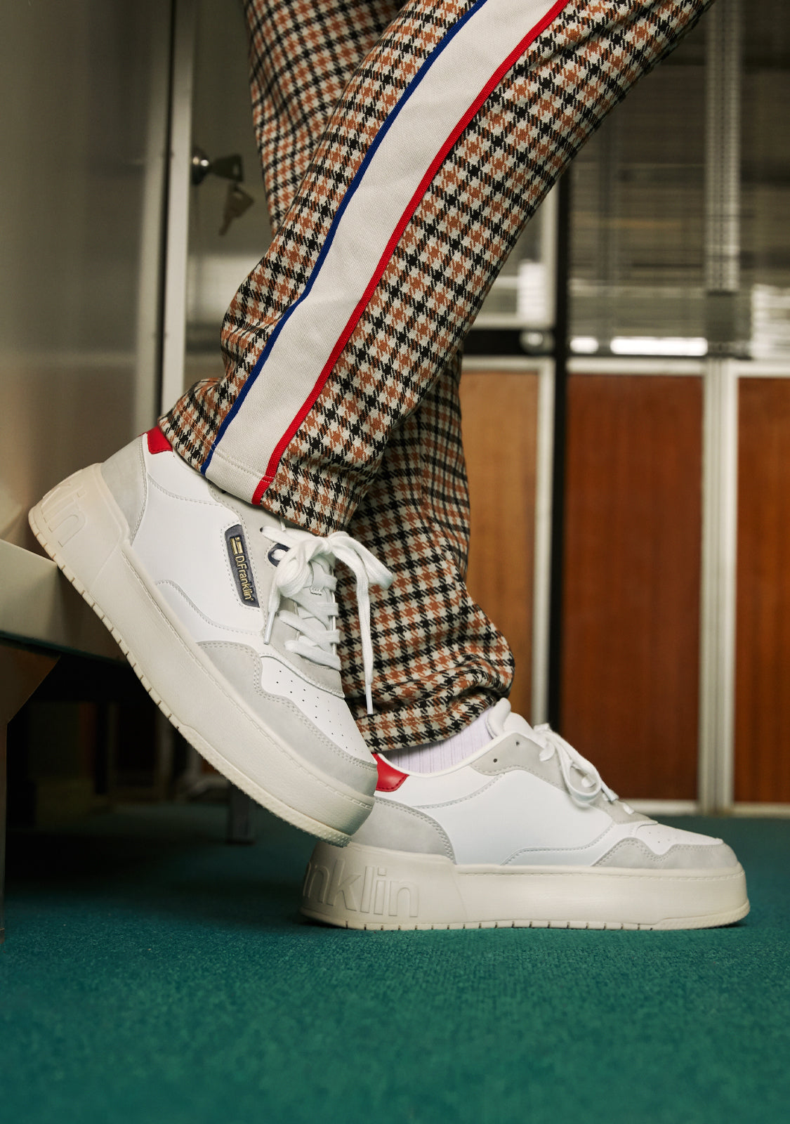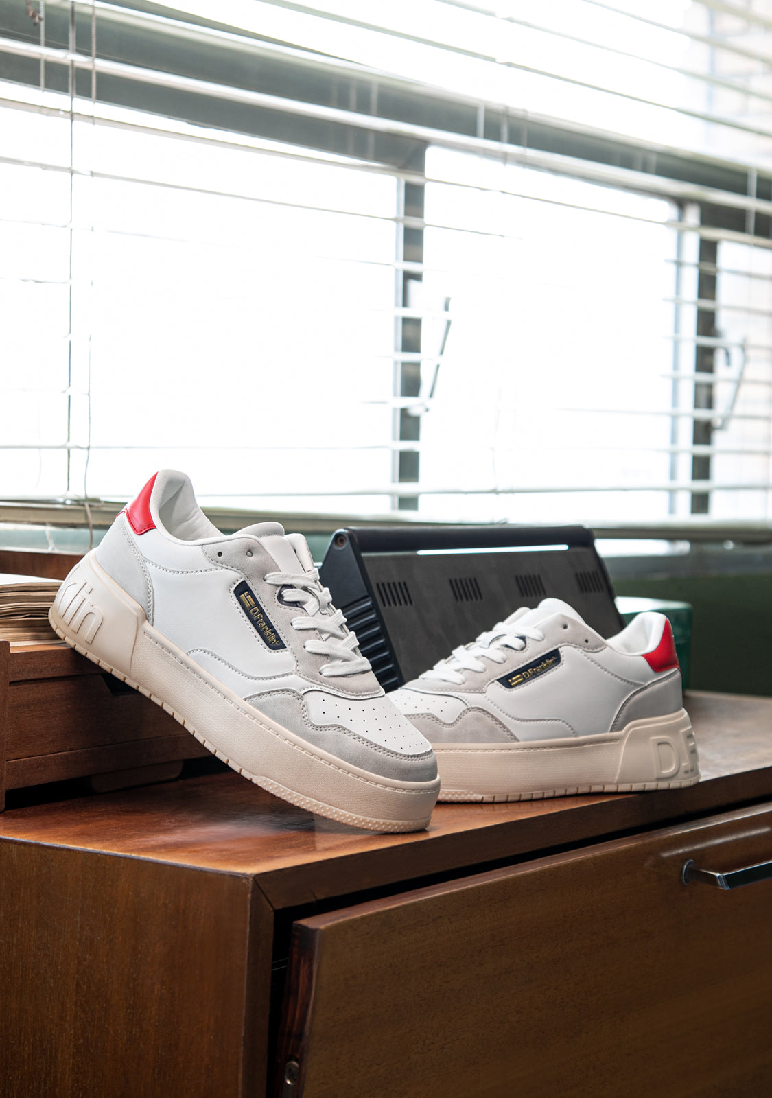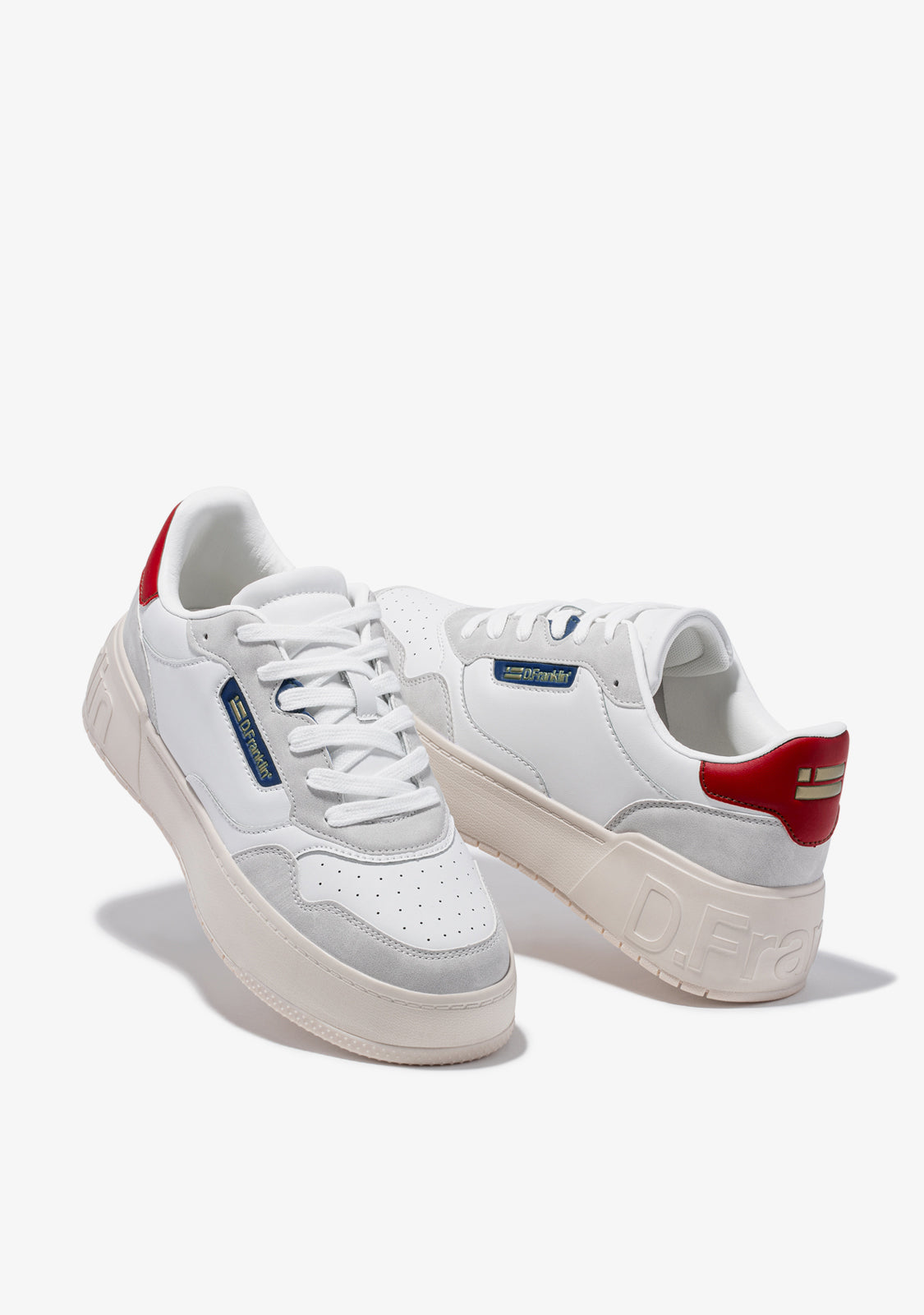 Ein verfeinerter Ansatz, inspiriert von der '90er Basketballszene. Minimalistischer Trainer mit rotem Absatz und D.Franklin-Emblem an der Seite in goldener Farbe auf marineblauem Hintergrund. Kontrastierende graue Teile aus weißem veganem Kunstleder. Konstruiert mit Gummisohle. Prägung des D.Franklin-Logos auf der Ferse. Baumwollschnürsenkel. 4 cm Sohle.