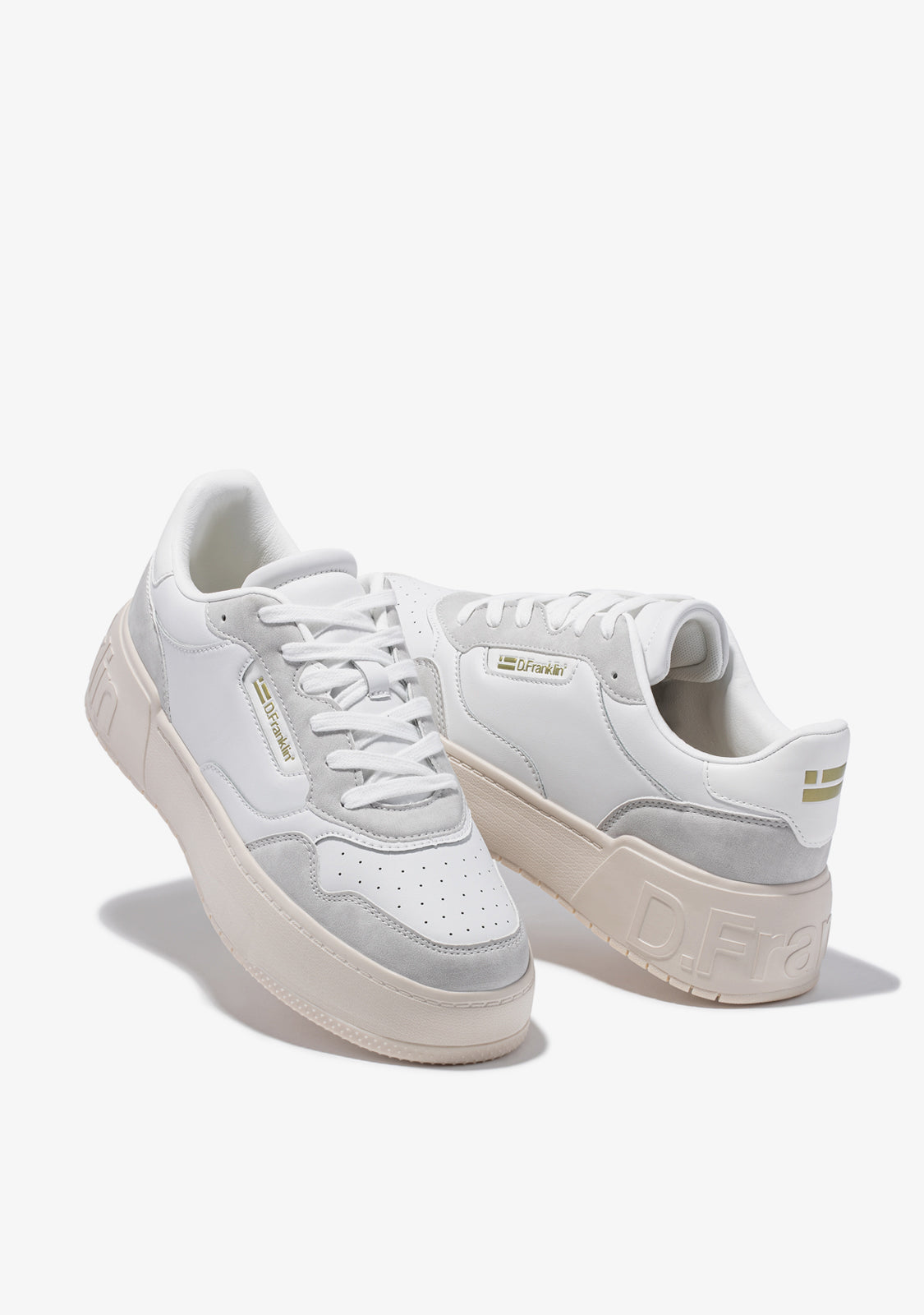 Ein verfeinerter Ansatz inspiriert von der '90er Basketballszene. Minimalistischer Trainer aus weißem veganem synthetischem Leder. Konstruiert mit Gummisohle. Prägung des D.Franklin Logos an der Ferse. Baumwollschnürsenkel. 4 cm Sohle.