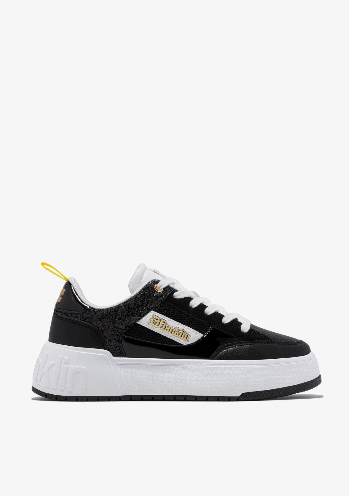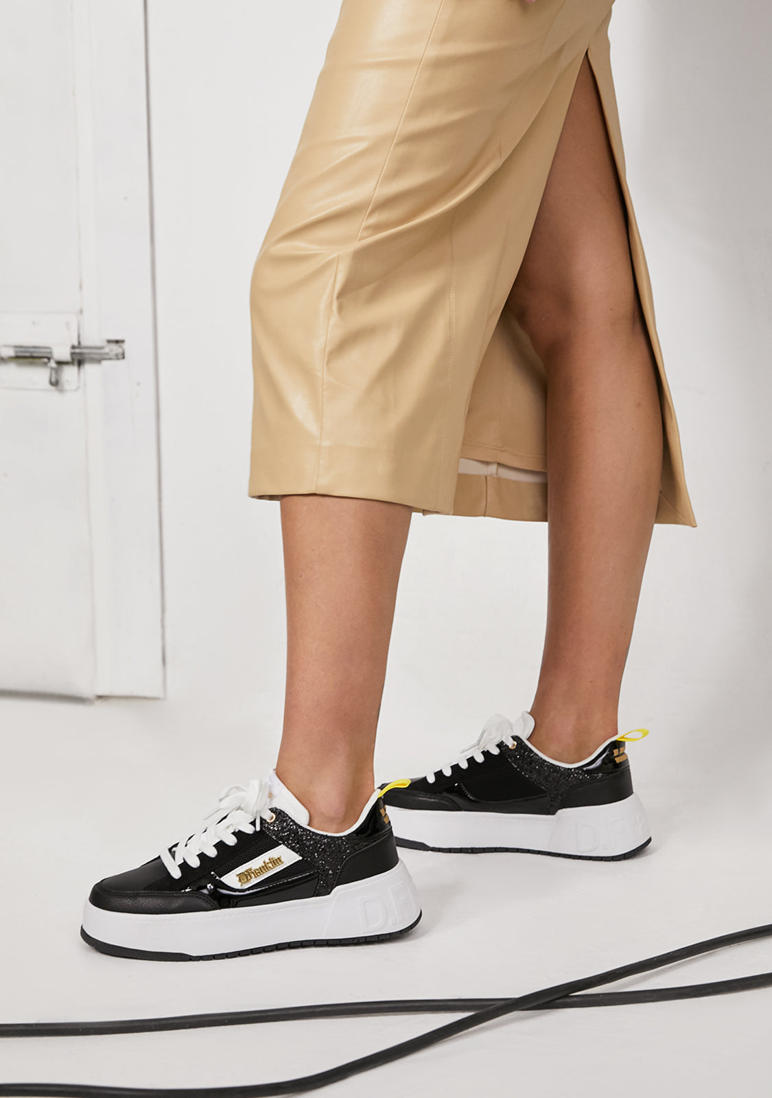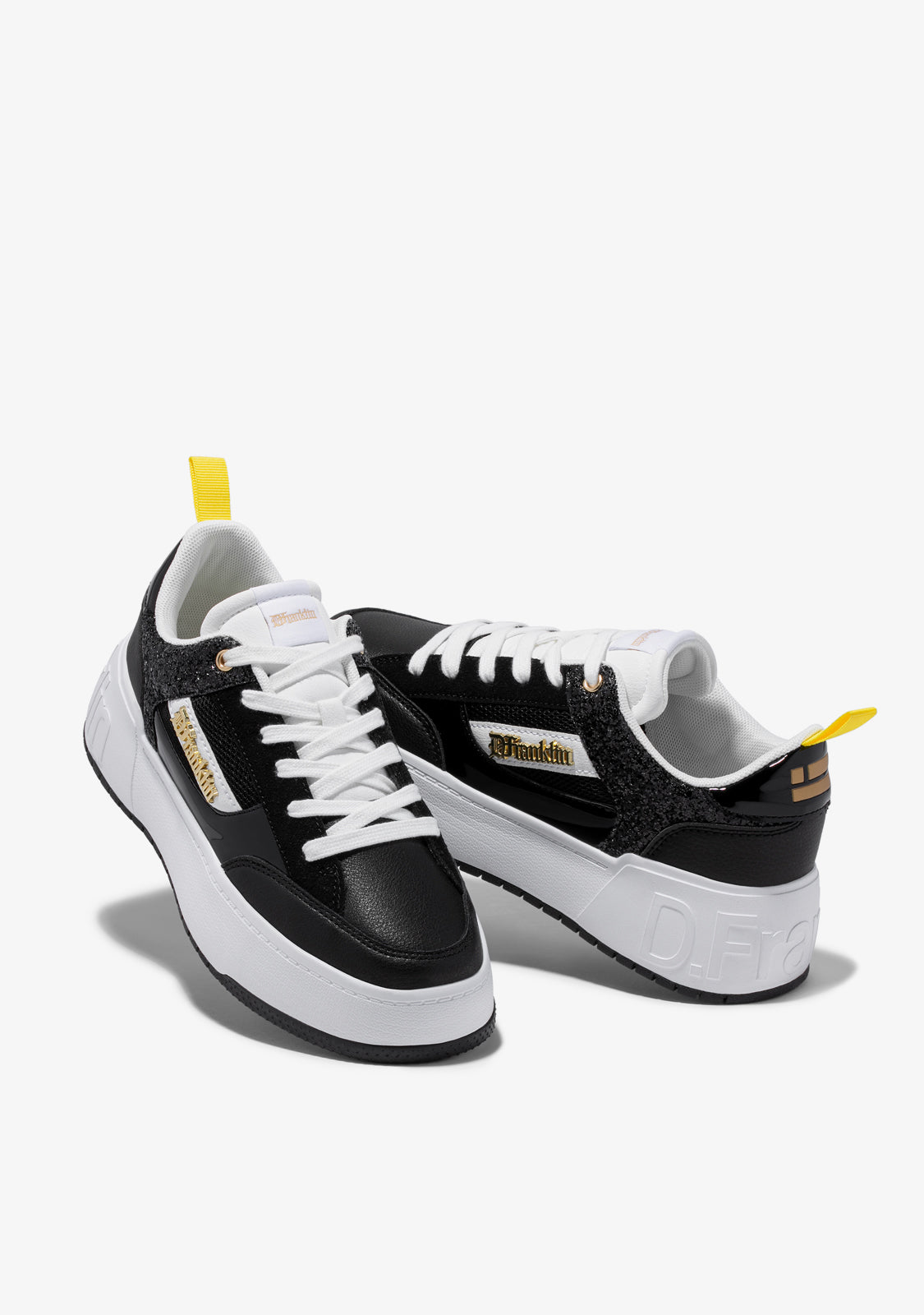 Entwickelt, um den Adrenalinkick unseres ikonischen Court-Schuhs zurückzubringen. Inspiriert von dem '90er-Basketball-Trend. Mit schwarzem Glitzer, um das Klassische neu zu definieren. Ikonisches D.Franklin-Emblem in Gold auf weißem veganem Kunstleder. Konstruiert mit einer Gummisohle. Prägung des D.Franklin-Logos an der Ferse. Baumwollschnürsenkel. 4 cm Sohle.