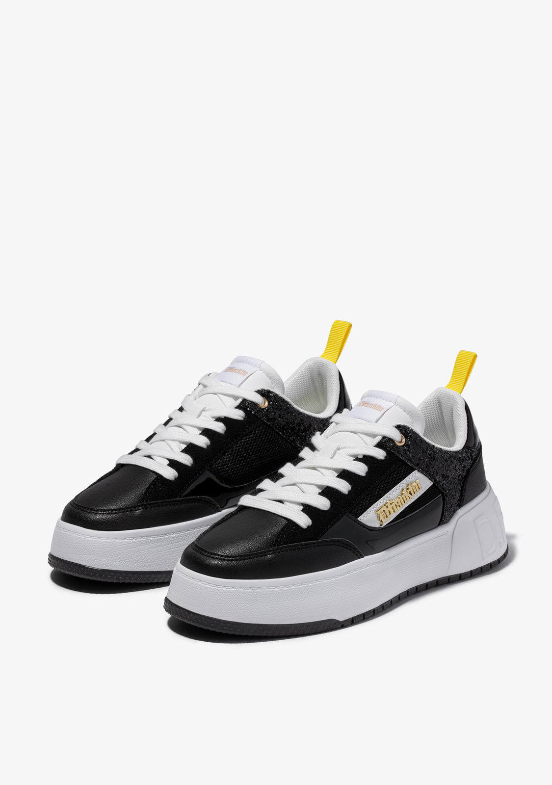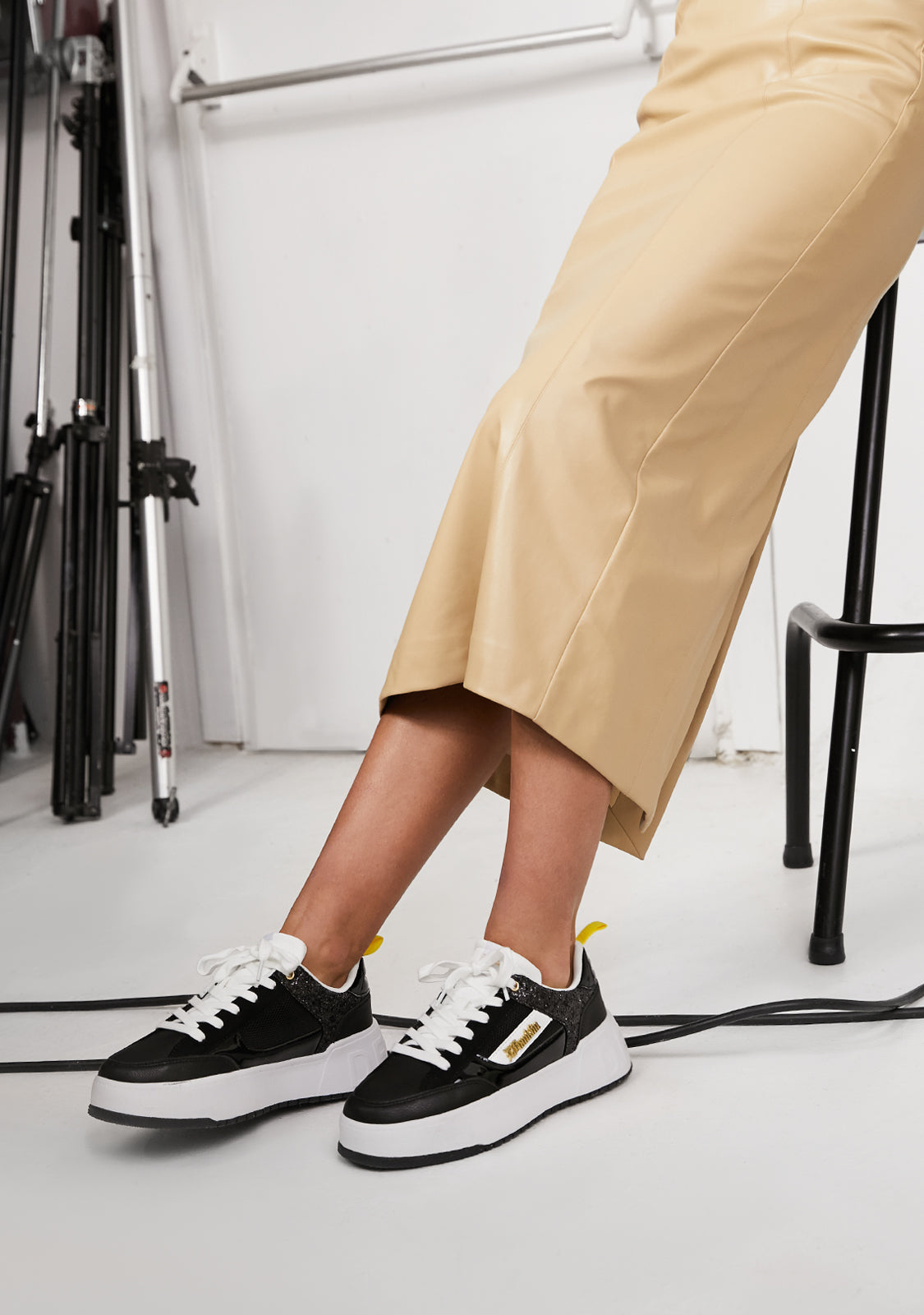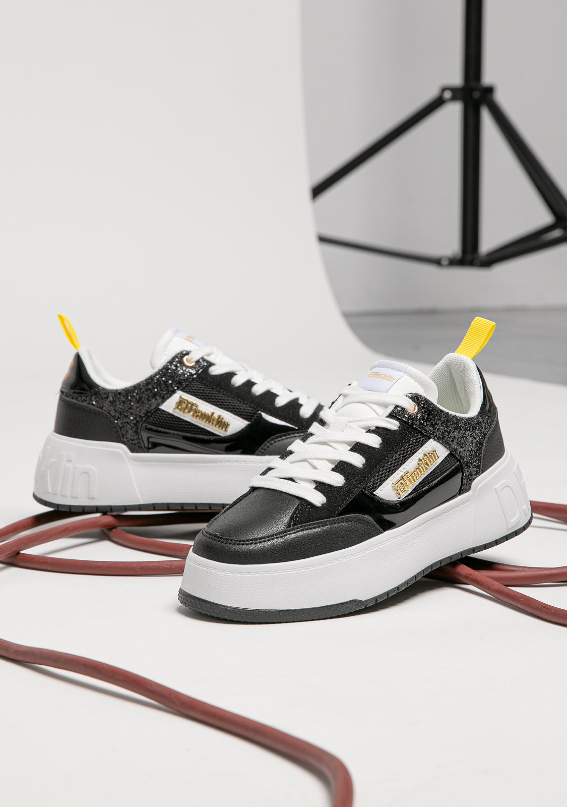Entwickelt, um den Adrenalinkick unseres ikonischen Court-Schuhs zurückzubringen. Inspiriert von dem '90er-Basketball-Trend. Mit schwarzem Glitzer, um das Klassische neu zu definieren. Ikonisches D.Franklin-Emblem in Gold auf weißem veganem Kunstleder. Konstruiert mit einer Gummisohle. Prägung des D.Franklin-Logos an der Ferse. Baumwollschnürsenkel. 4 cm Sohle.