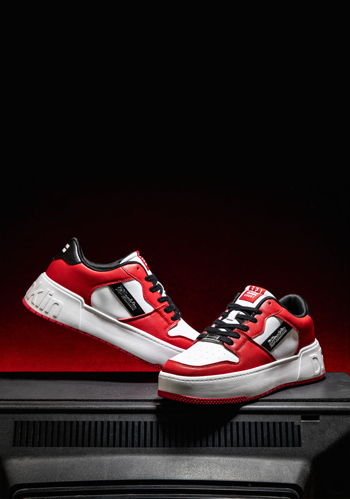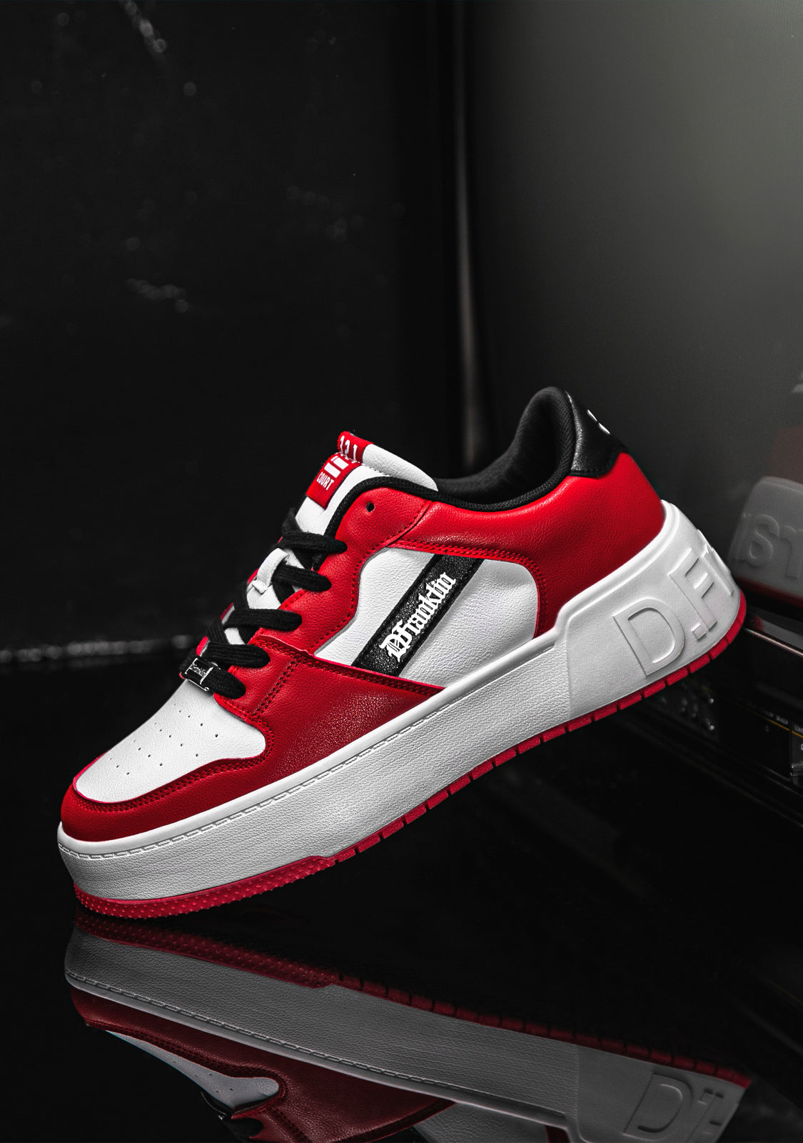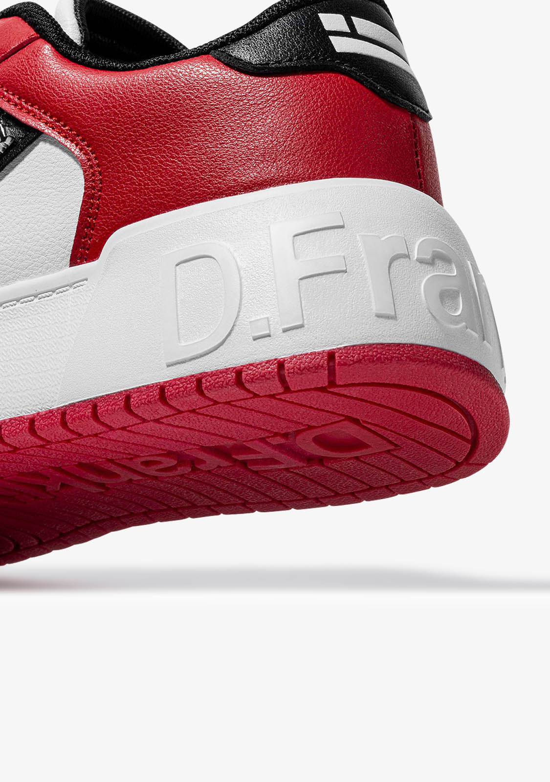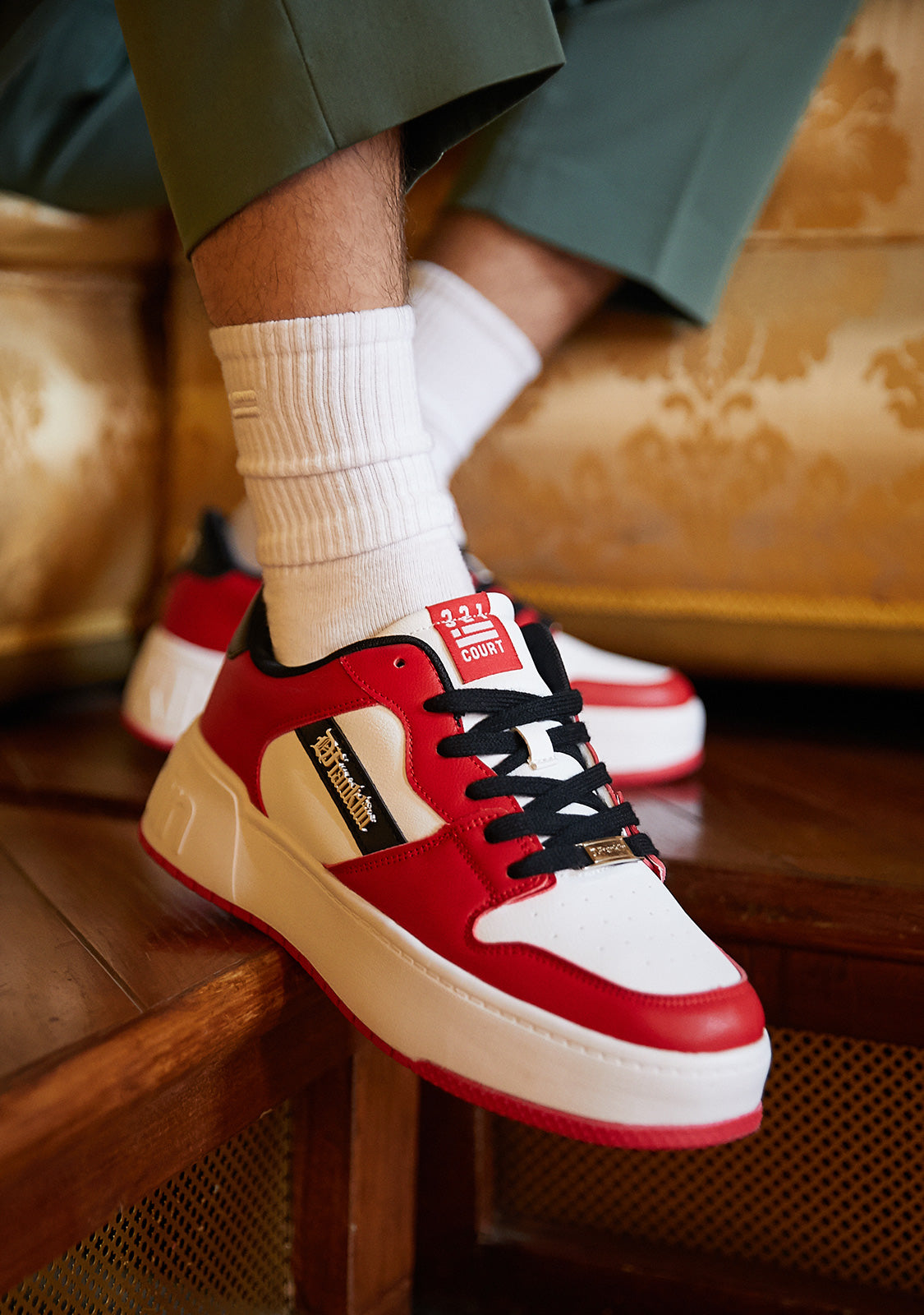 Präsentation D.Franklins 321 Court Collection. Ein neues sportlich inspiriertes Modell, das vom Spielfeld geschaffen wurde, um ein mutiges und vielseitiges Design zu bieten. Der Low Court Red zeichnet sich durch eine Neuinterpretation der klassischen Schichtenlinie aus, mit einer bahnbrechenden Farbkombination.