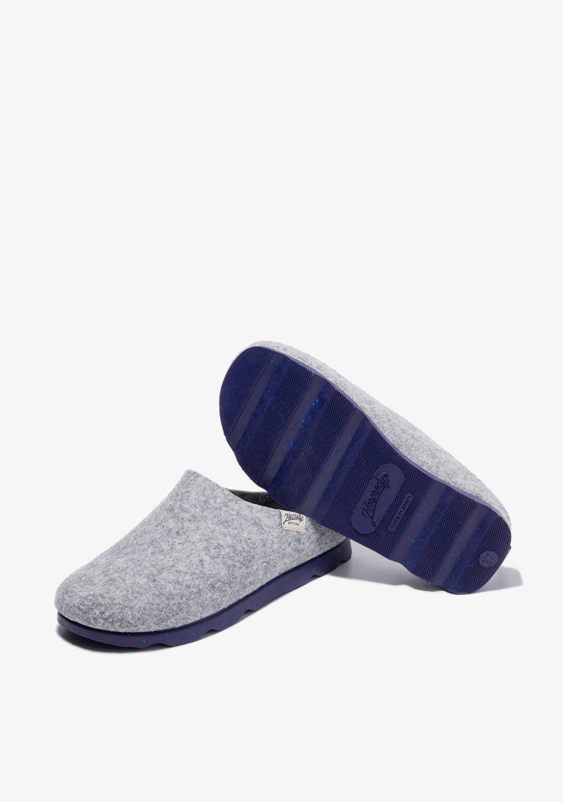 Schütze dich vor der Kälte mit diesem Design aus wiederverwendbaren Materialien. Das Obermaterial aus recyceltem PET-Filz hat einen grauen Farbton mit kleinen marineblauen Akzenten. Die kontrastierende Sohle ist aus zweifarbigen Naturkautschuk gefertigt, der aus recycelten Partikeln besteht.