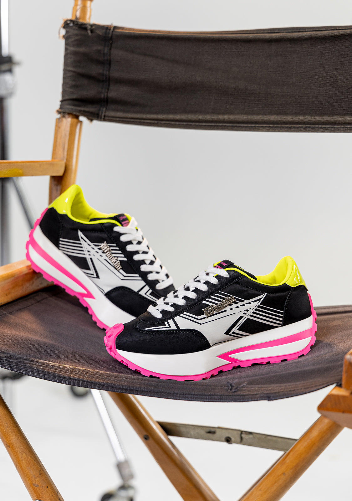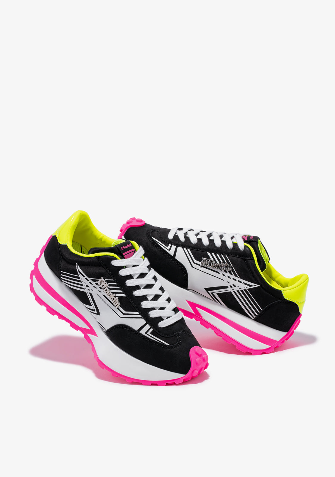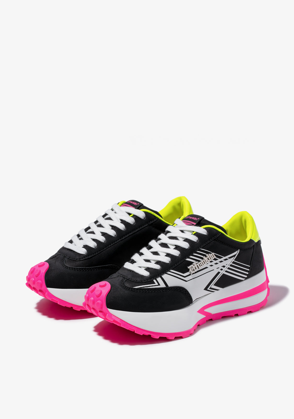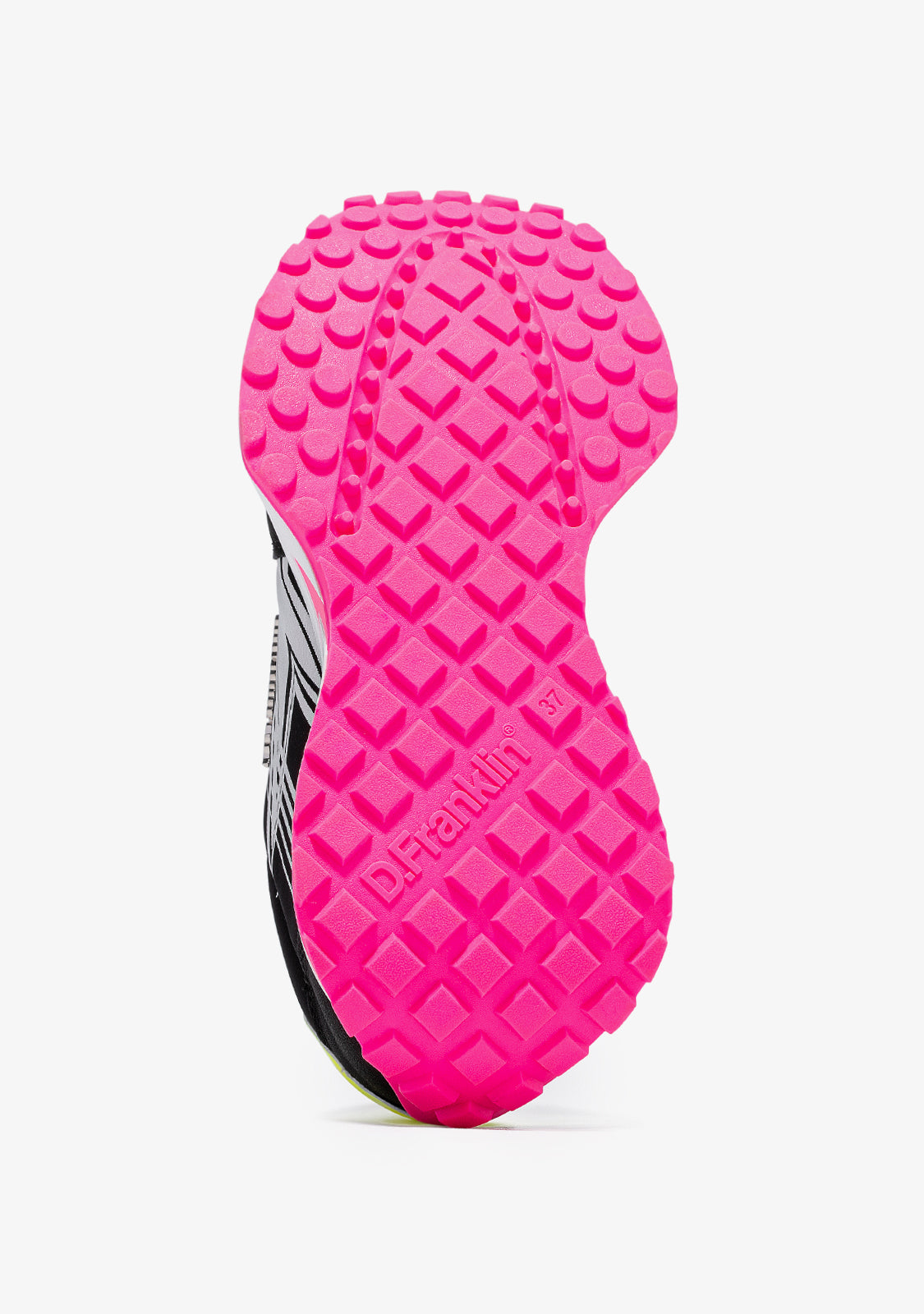 Sneaker inspiriert vom Rhythmus der Stadt. Trendiges Design aus tierfreundlichen Materialien gefertigt. Seitlicher Sternendruck in Weiß. Plattiertes Metall D.Franklin Detail. 4 cm weiße Plattform. Spezielle rutschfeste TR-Sohle in Fuchsia.