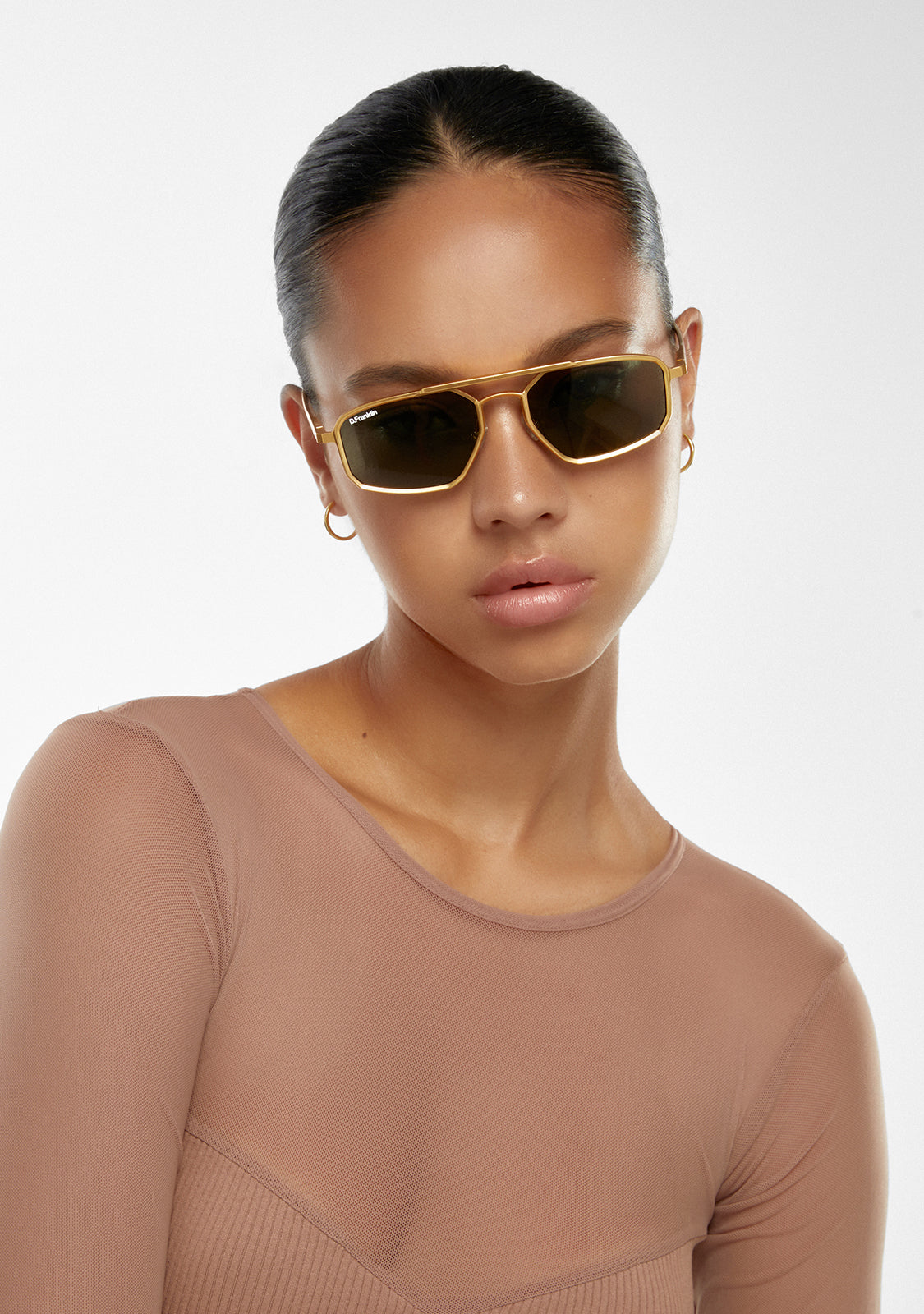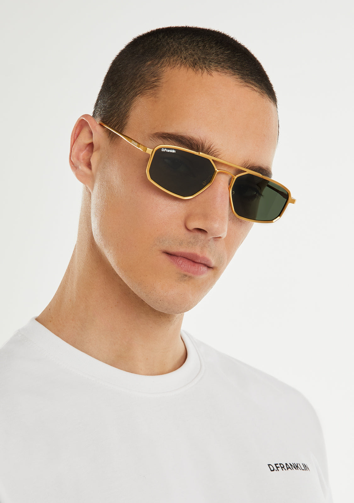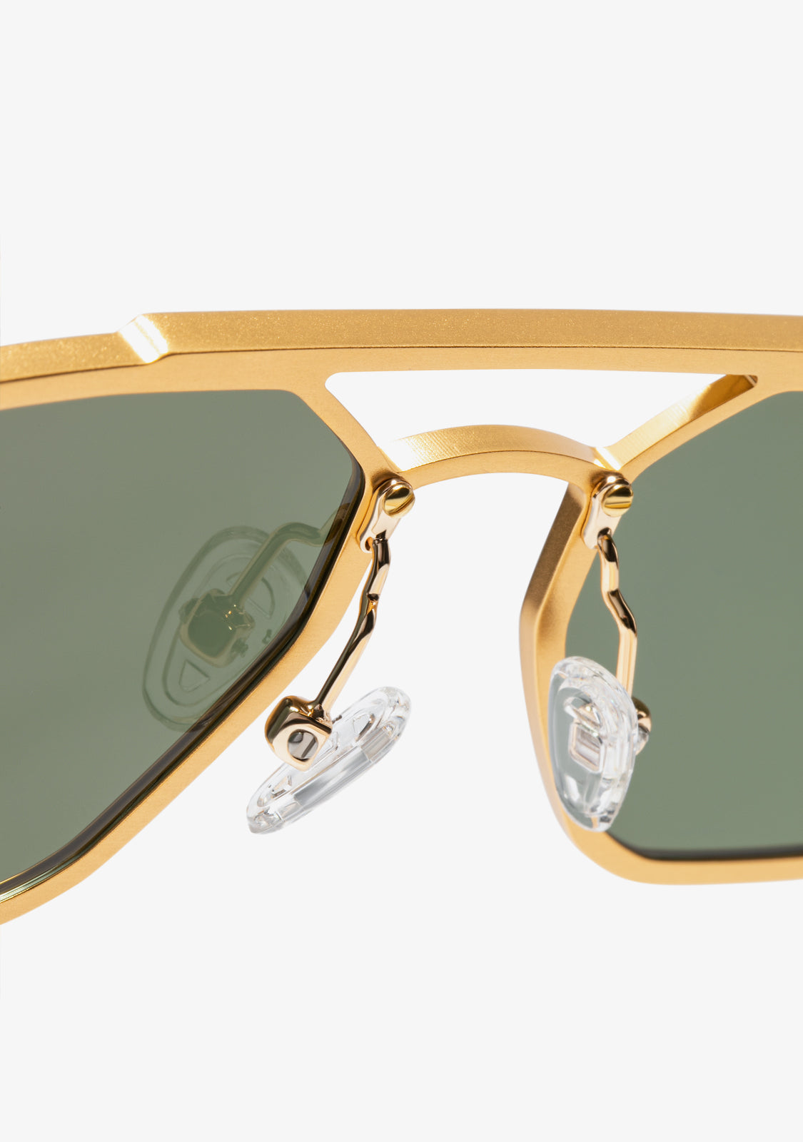 Dank ihrer Aluminiumkonstruktion sind diese Brillen ultraleicht. Sie verfügen über grüne polarisierte Gläser und einen matten goldenen Rahmen für eine markante Ästhetik. Das Design zeigt unser Emblem auf dem rechten Glas und ein metallisches Logo an der Seite der Bügel. Der Rahmen hat eine Frontbreite von 143 mm und eine Glasbreite von 52 mm, die den meisten Gesichtern passt. Die Bügel sind 138 mm lang.