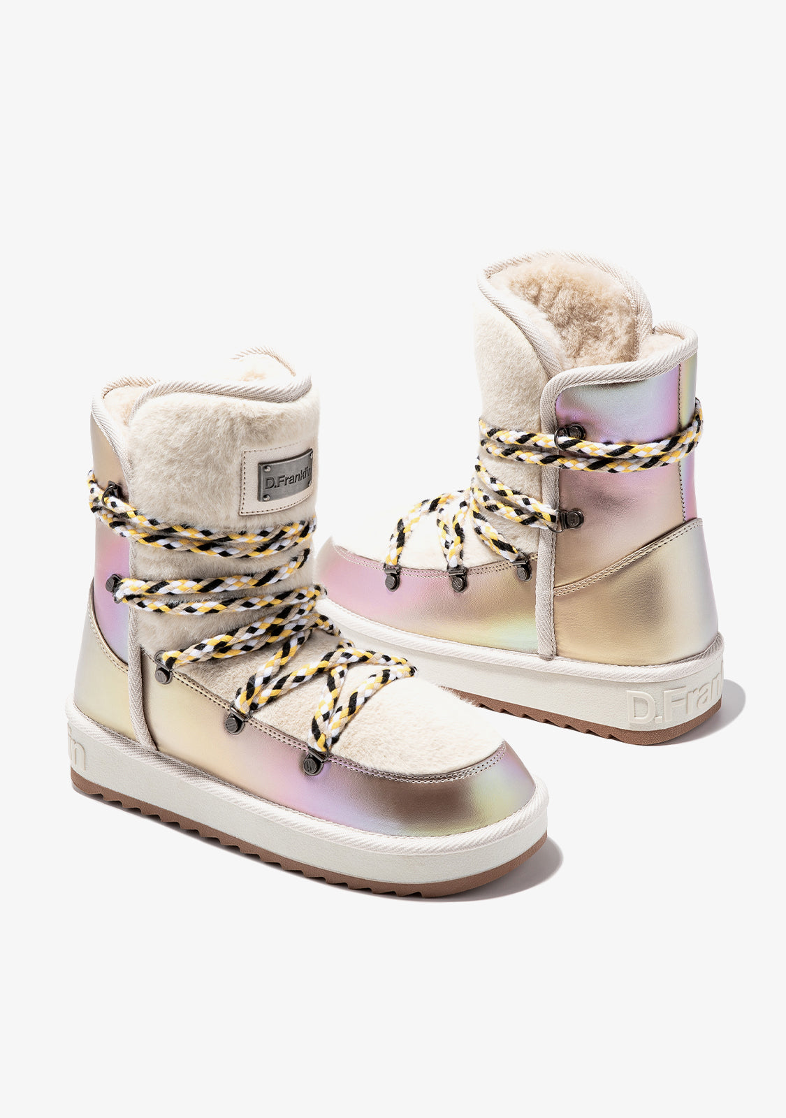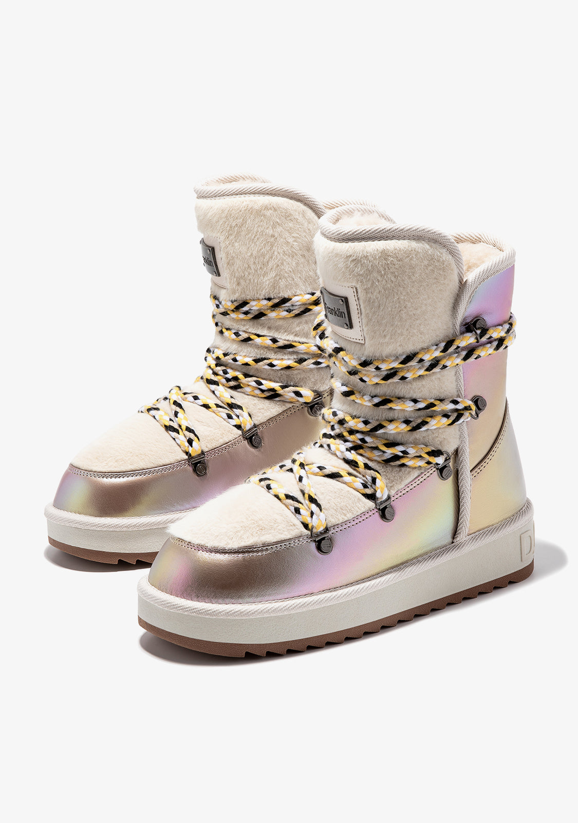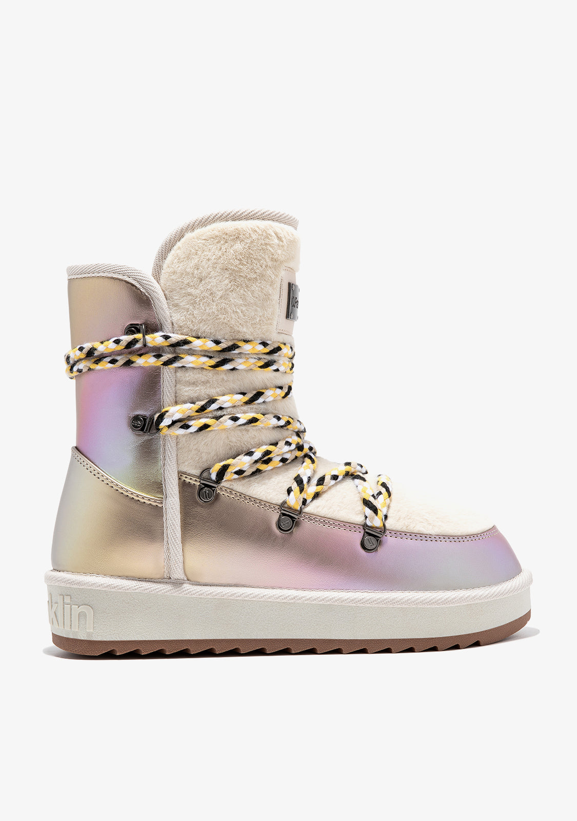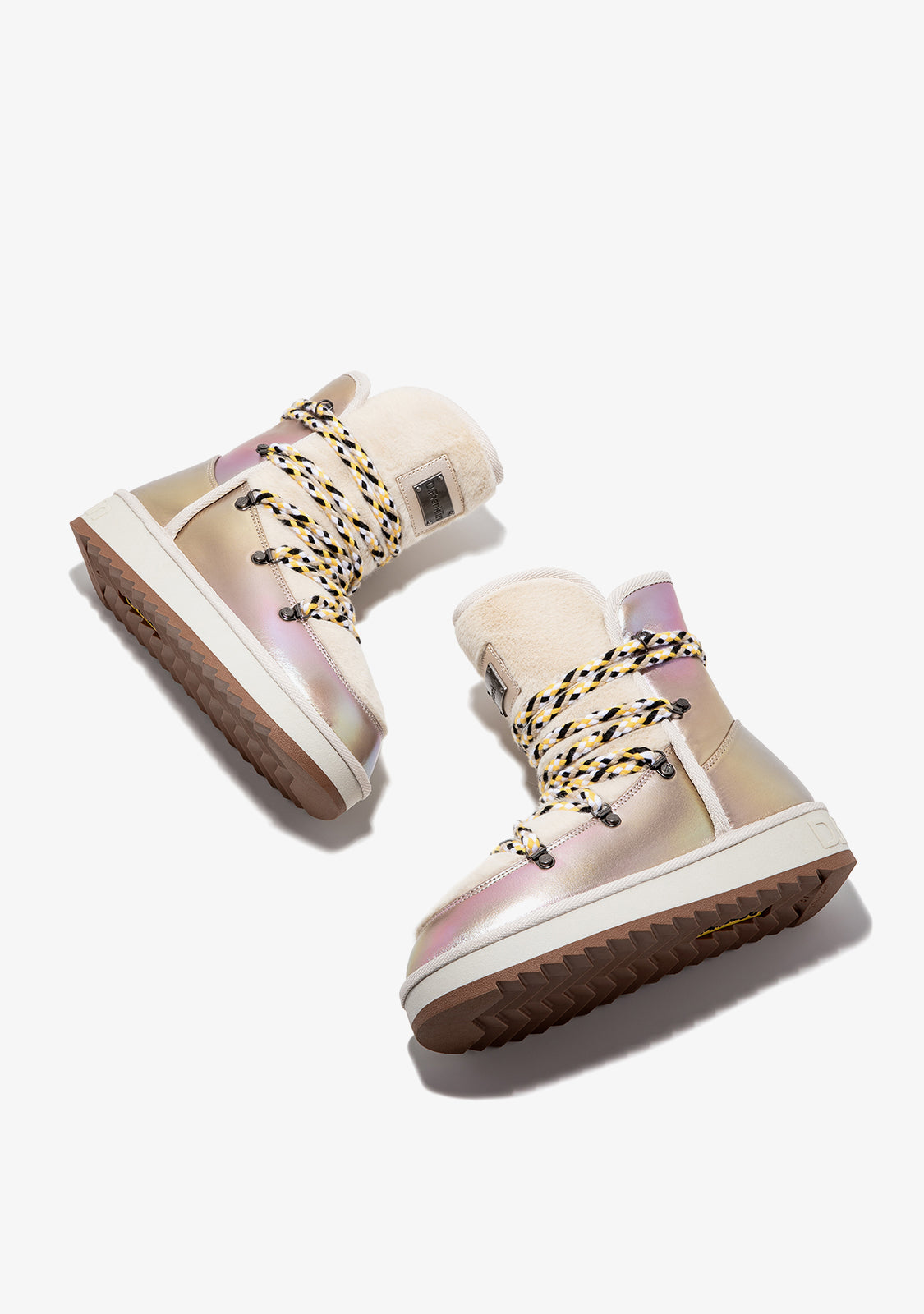 Diese schimmernden beigen Boots bestehen aus hochwertigem, wasserabweisendem Mikrofaserstoff. Eine neu gestaltete Sohle macht sie leichter für eine bequemere Fahrt. Sie verfügen auch über unser personalisiertes Fersenabzeichen. Mehrfach verstellbare Bergschuh-Schnürsenkel bieten optimalen Halt und reflektierende Details. Außerdem sorgt ein Kunstfellfutter für den ultimativen Winterlook.