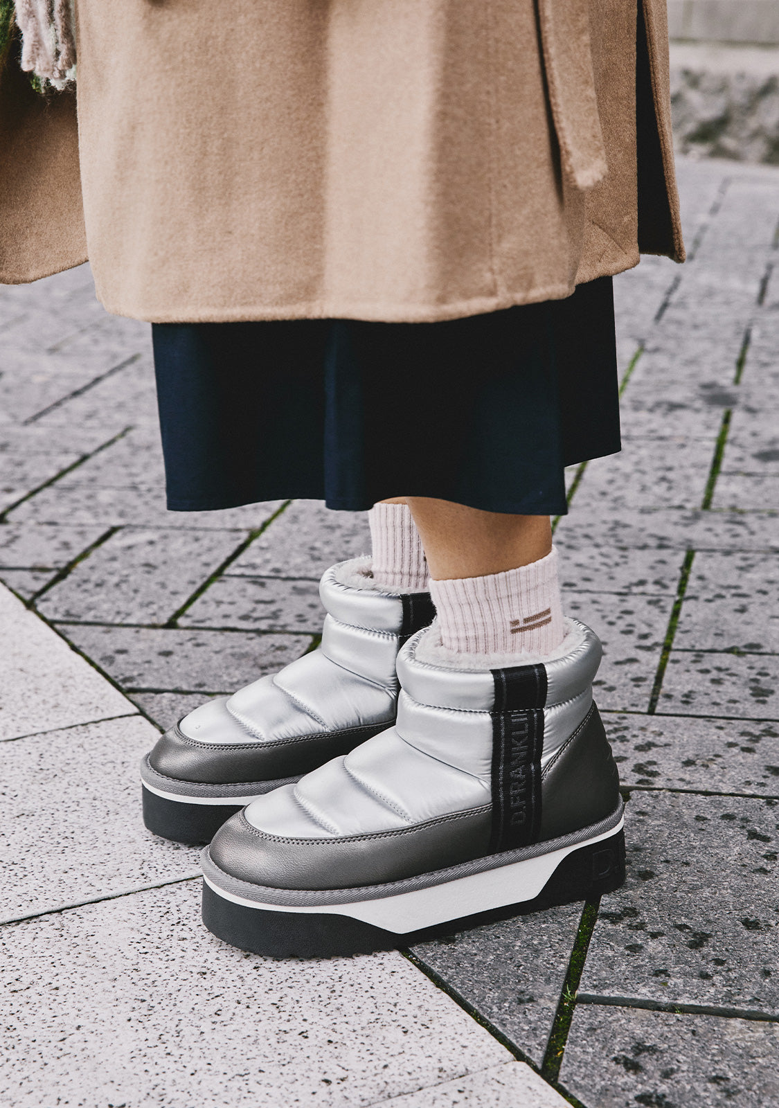 Gerade geschnittenes Schaftdesign in silbernen Tönen und synthetischem Innenfutter für überlegene Wärme.