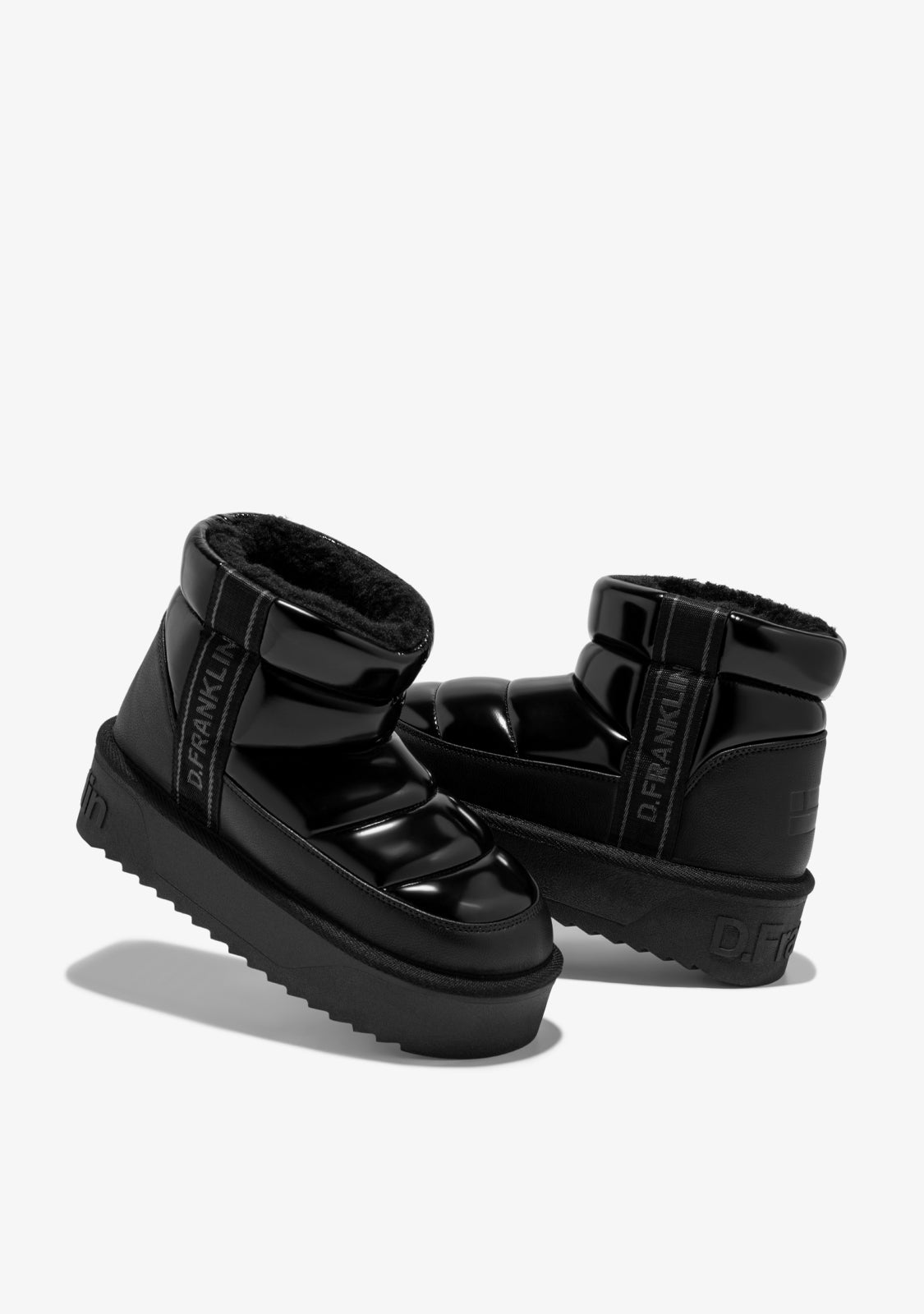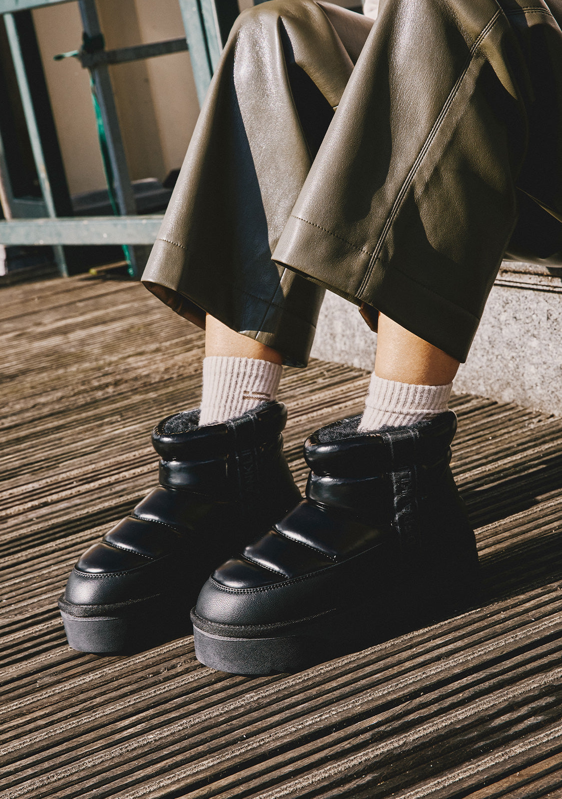 Gerade geschnittenes Schaftdesign in dunklen Tönen, glänzende Ästhetik und synthetisches Innenfutter für überlegene Wärme.