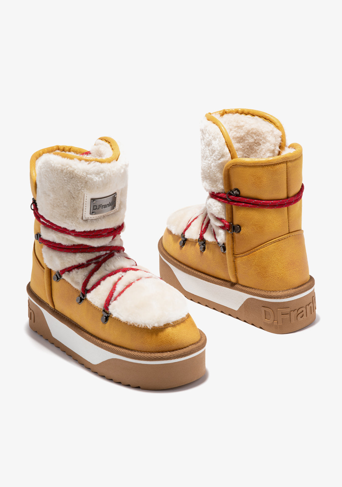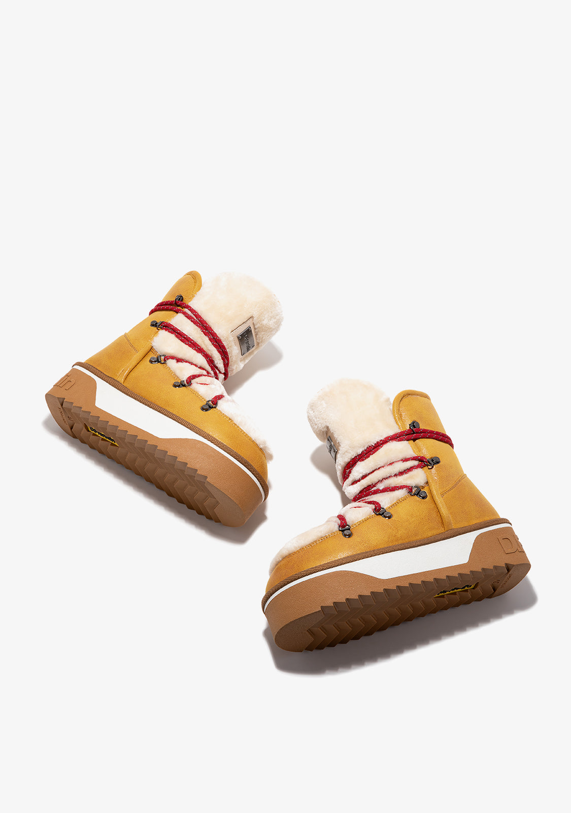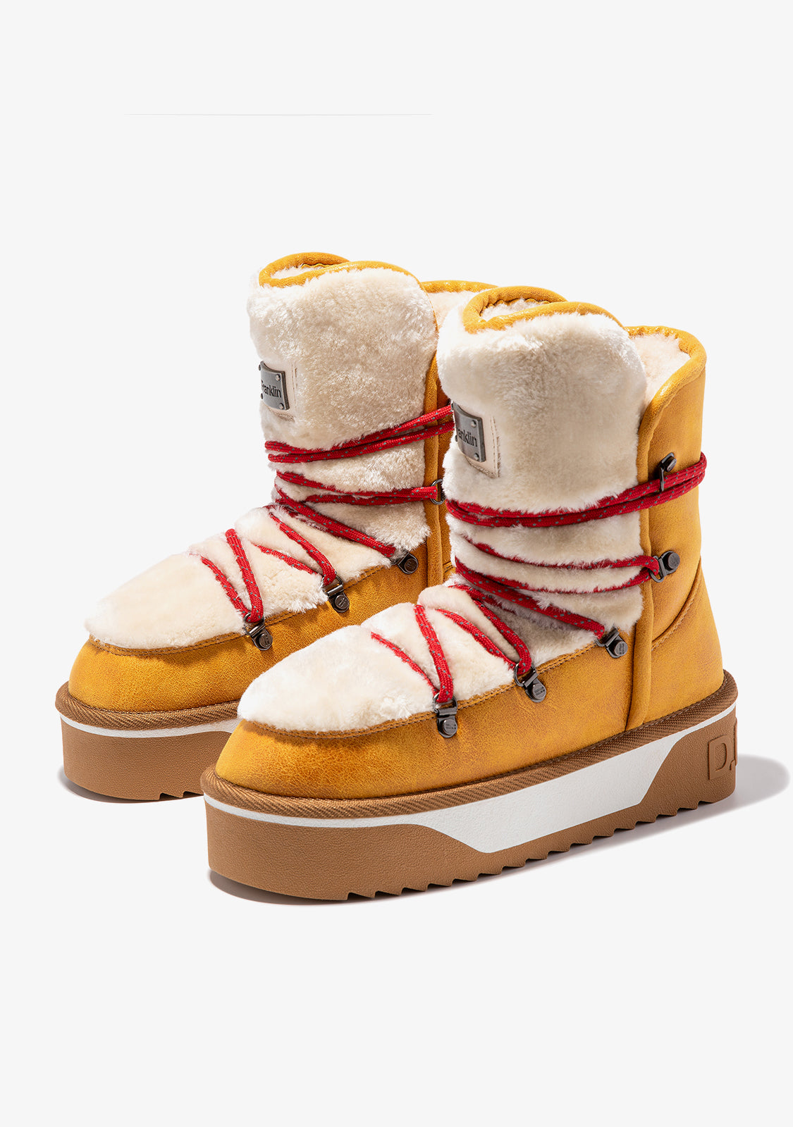 Diese senfgelben Boots bestehen aus hochwertigem Mikrofaserstoff. Die neu gestaltete Sohle sorgt für ein geringeres Gewicht und einen komfortableren Tragekomfort. Sie verfügt auch über unser individuelles Fersenabzeichen. Mehrfach verstellbare Bergstile-Schnürsenkel bieten optimalen Halt und reflektierende Details. Außerdem sorgt ein Kunstfellfutter für den ultimativen Winterlook.