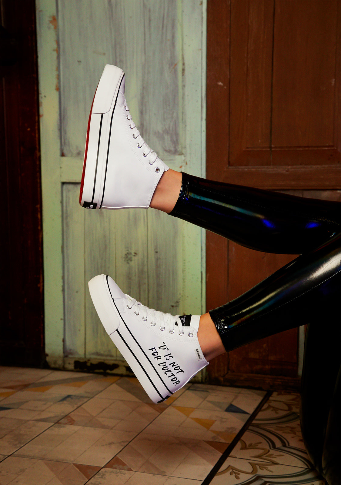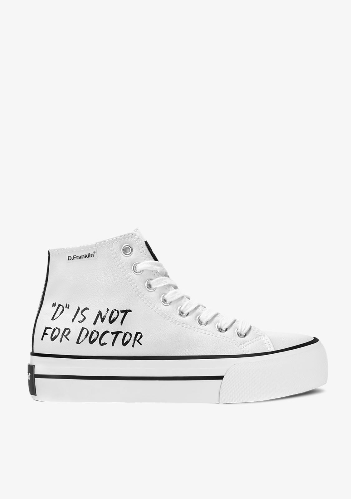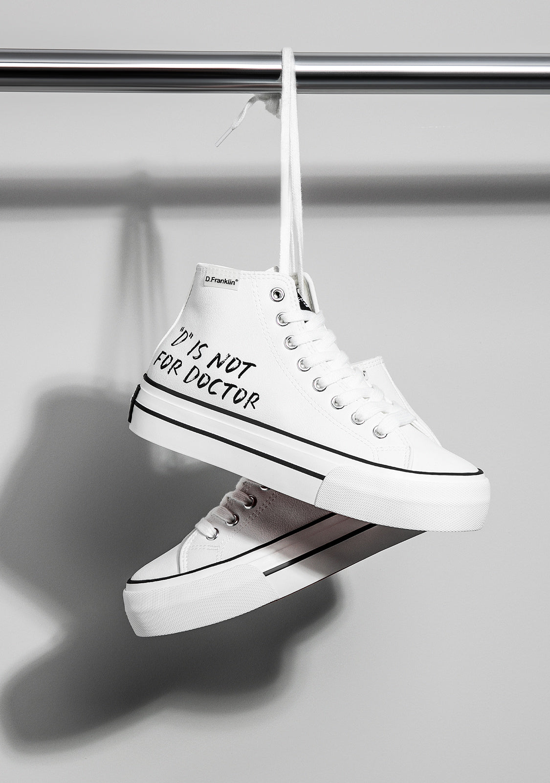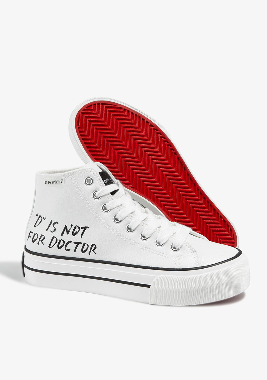 Die One Way Limited Edition ist inspiriert von den lässigsten Kollektionen, kombiniert mit der Persönlichkeit und dem ausgeprägtesten Stil von D.Franklin®. Die One Way D Is Not White sind die perfekten Hi-Top Sneakers für alle Arten von neuen Wegen. Ein Streetstyle-Modell, das aktuelle Trends mit originalen Details seiner Materialien kombiniert. Hergestellt aus weißem Synthetikleder, entworfen aus unserem Anspruch 'D ist nicht für Doktor'.