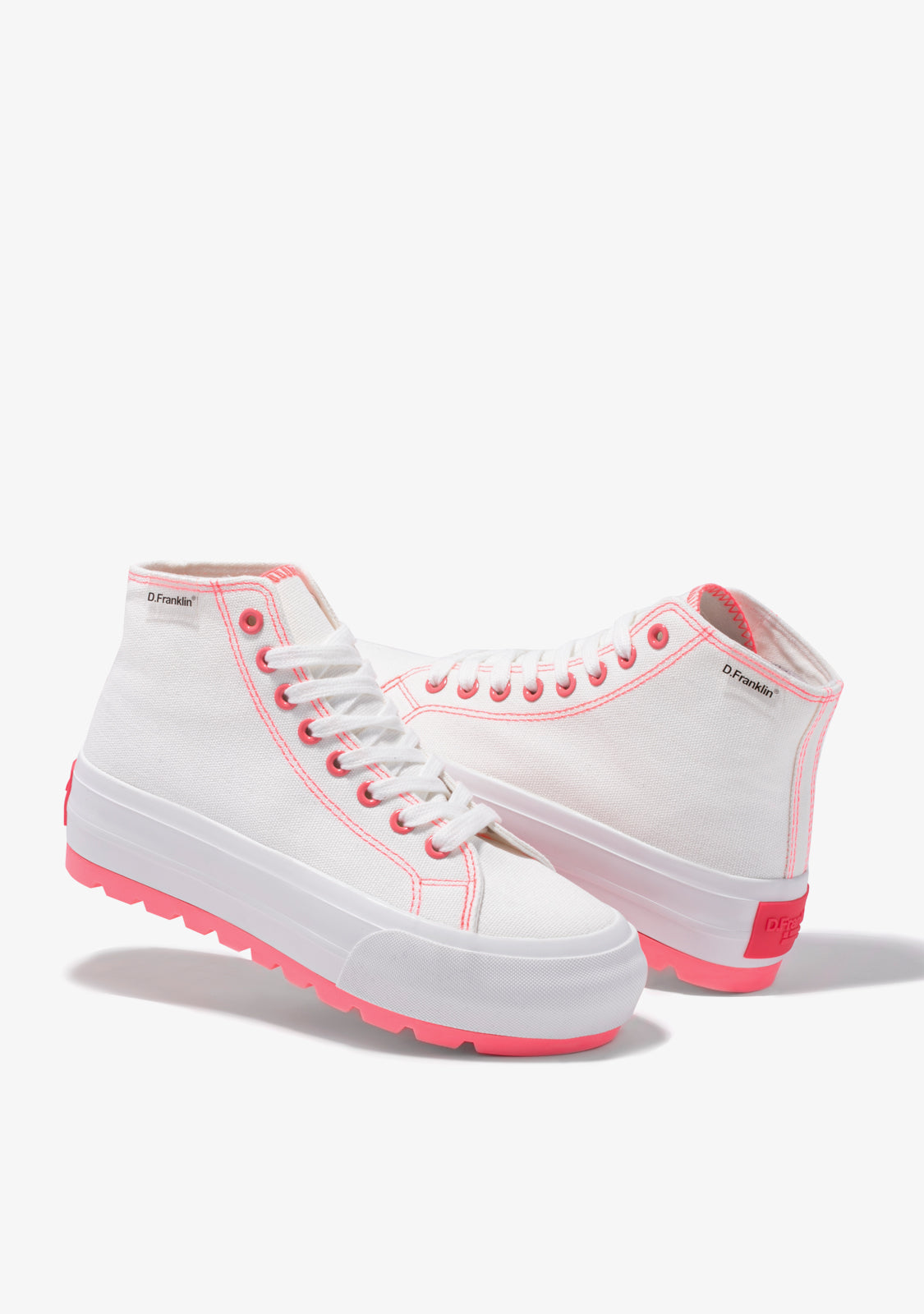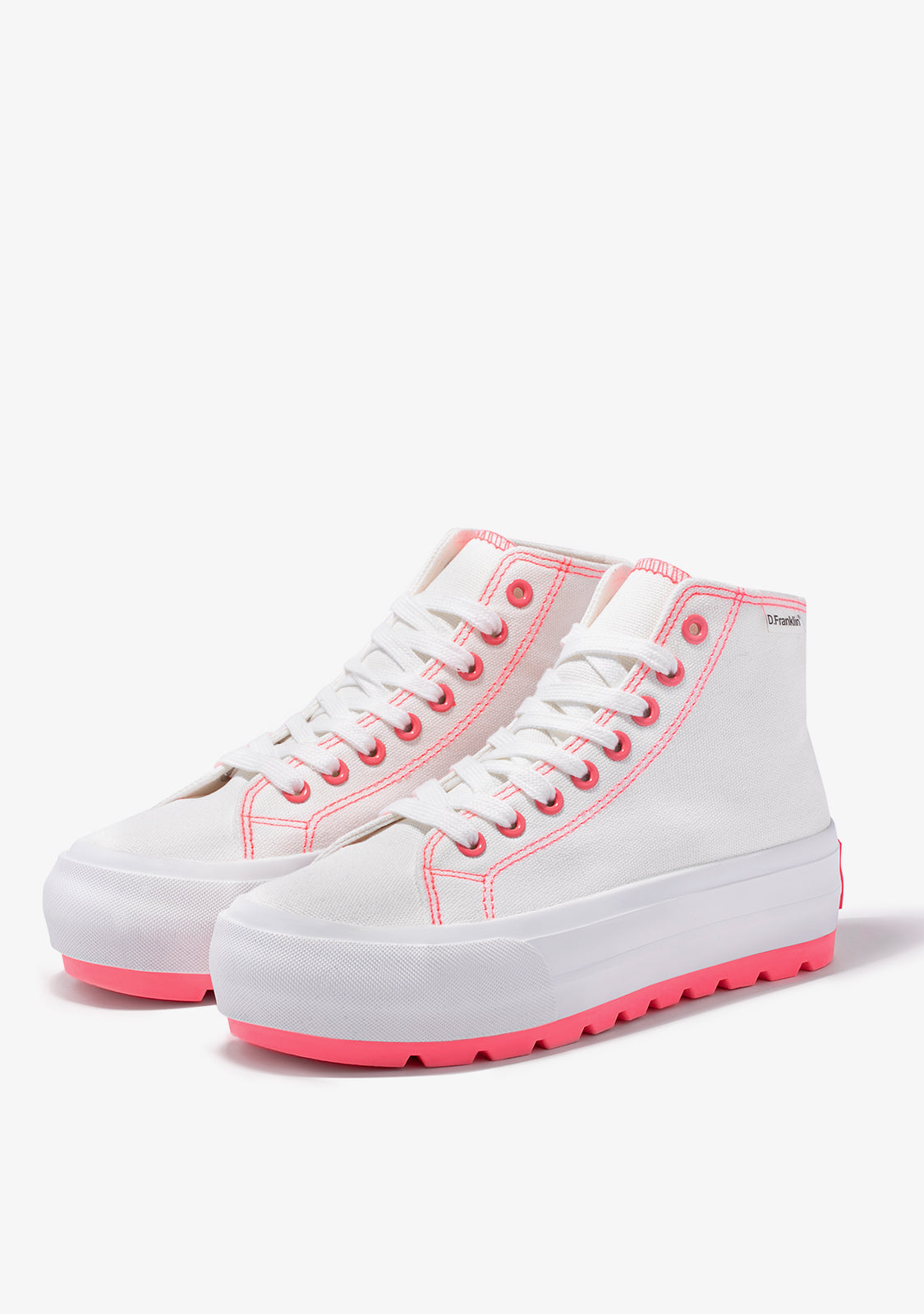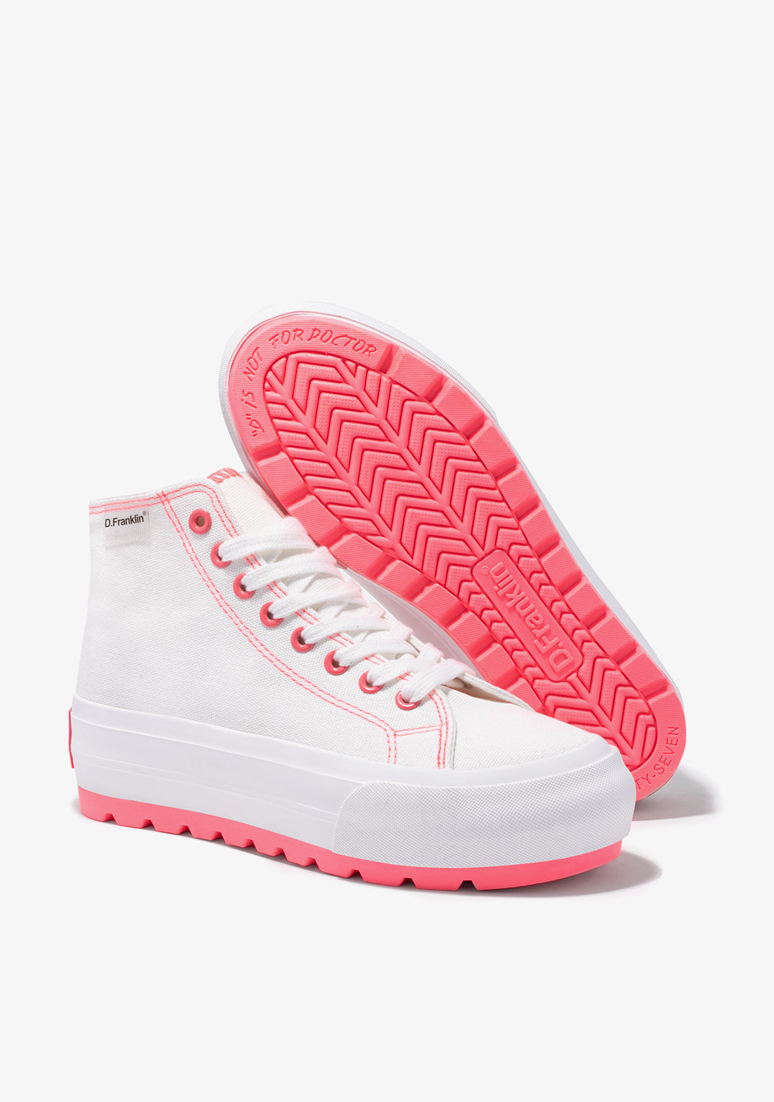 Verschiedene Wege zur Entdeckung. Verschiedene Möglichkeiten, es zu tun. Inspiriert von dem klassischen One Way High-Top-Trainer mit einem Hauch von Pink. Konstruiert mit einer 5 cm extra griffigen, leichten weißen Sohle. Weißes, geprägtes Logo auf pinkem Hintergrund an der Ferse.