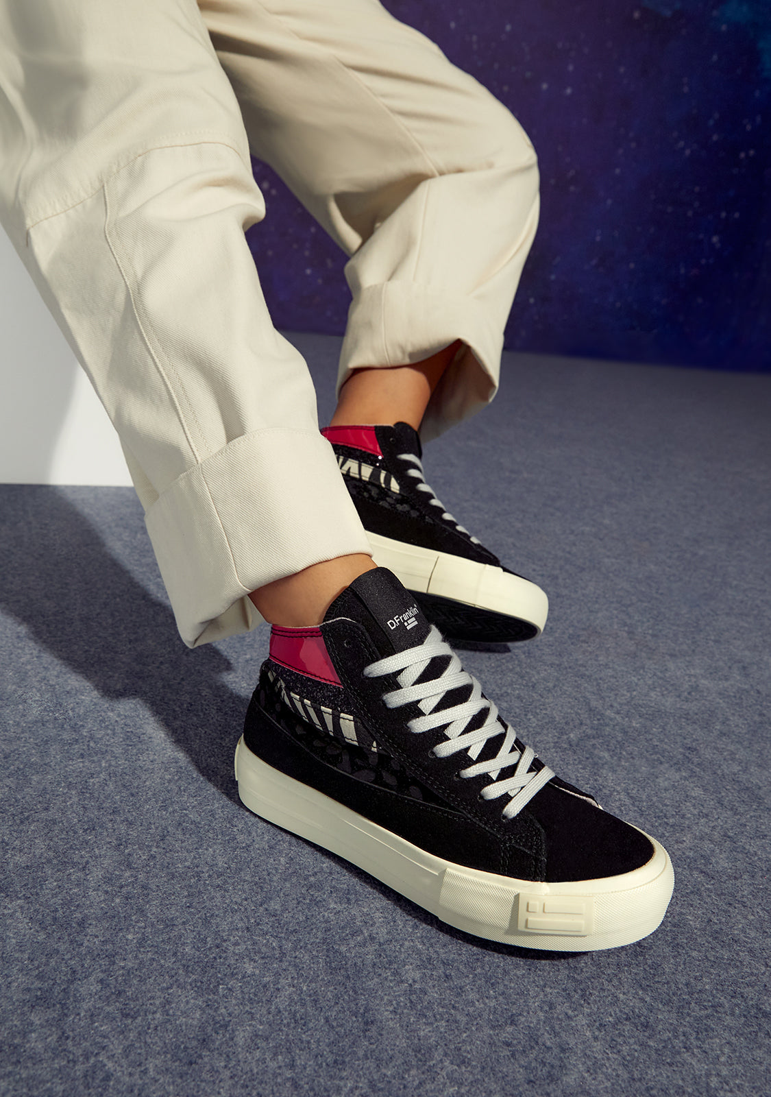 Hoch geschnittene D.Franklin Sneakers, die mit einer mutigen Kombination aus Materialien und Texturen entworfen wurden. Ein herausfordernder Vorschlag, um mit Konventionalität zu brechen und mit jedem Schritt einen Eindruck zu hinterlassen.