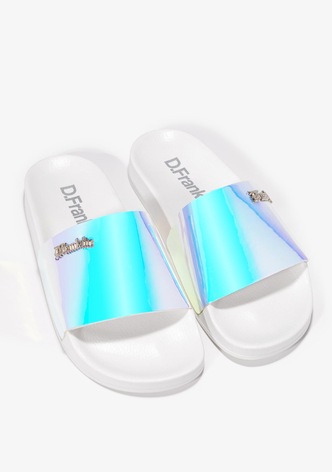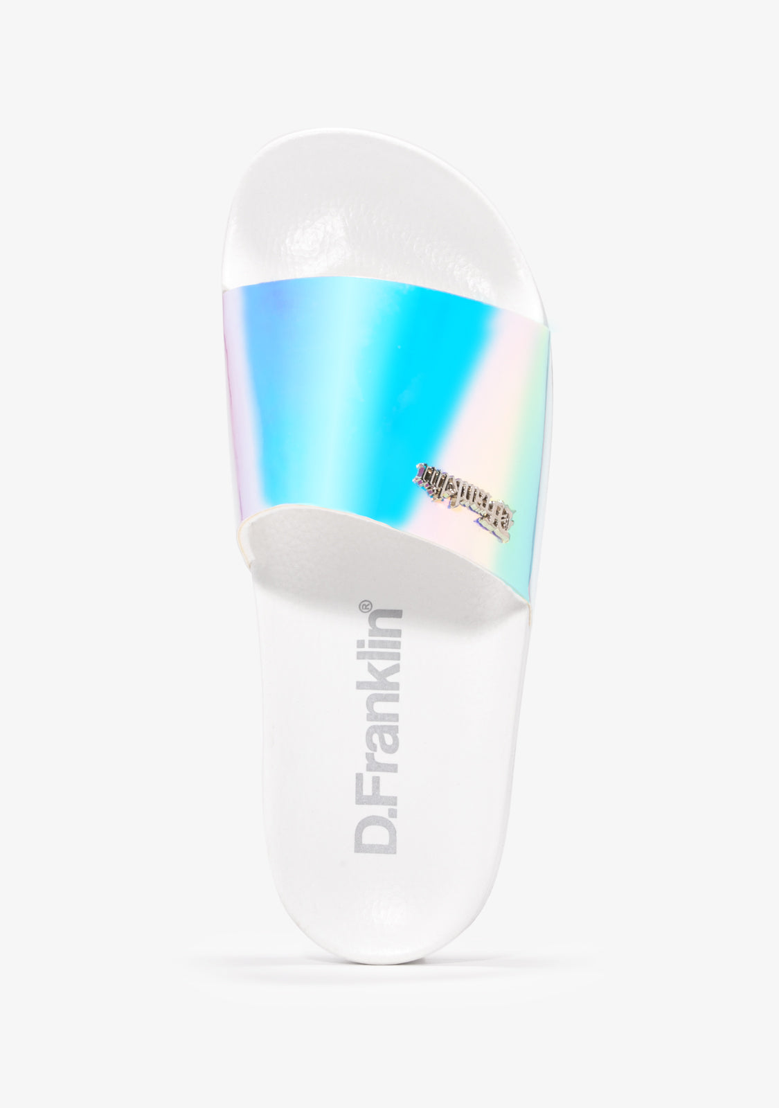 Die D.Franklin Pala Slide Patent Sandalen verfügen über einen breiten synthetischen Riemen mit einem Iris-Effekt, der Unterstützung bietet. Sie sind außerdem mit unserem D.Franklin Emblem auf dem Obermaterial ausgestattet. Das Sohlen-Design ist so geformt, dass es perfekt der Fußform entspricht.