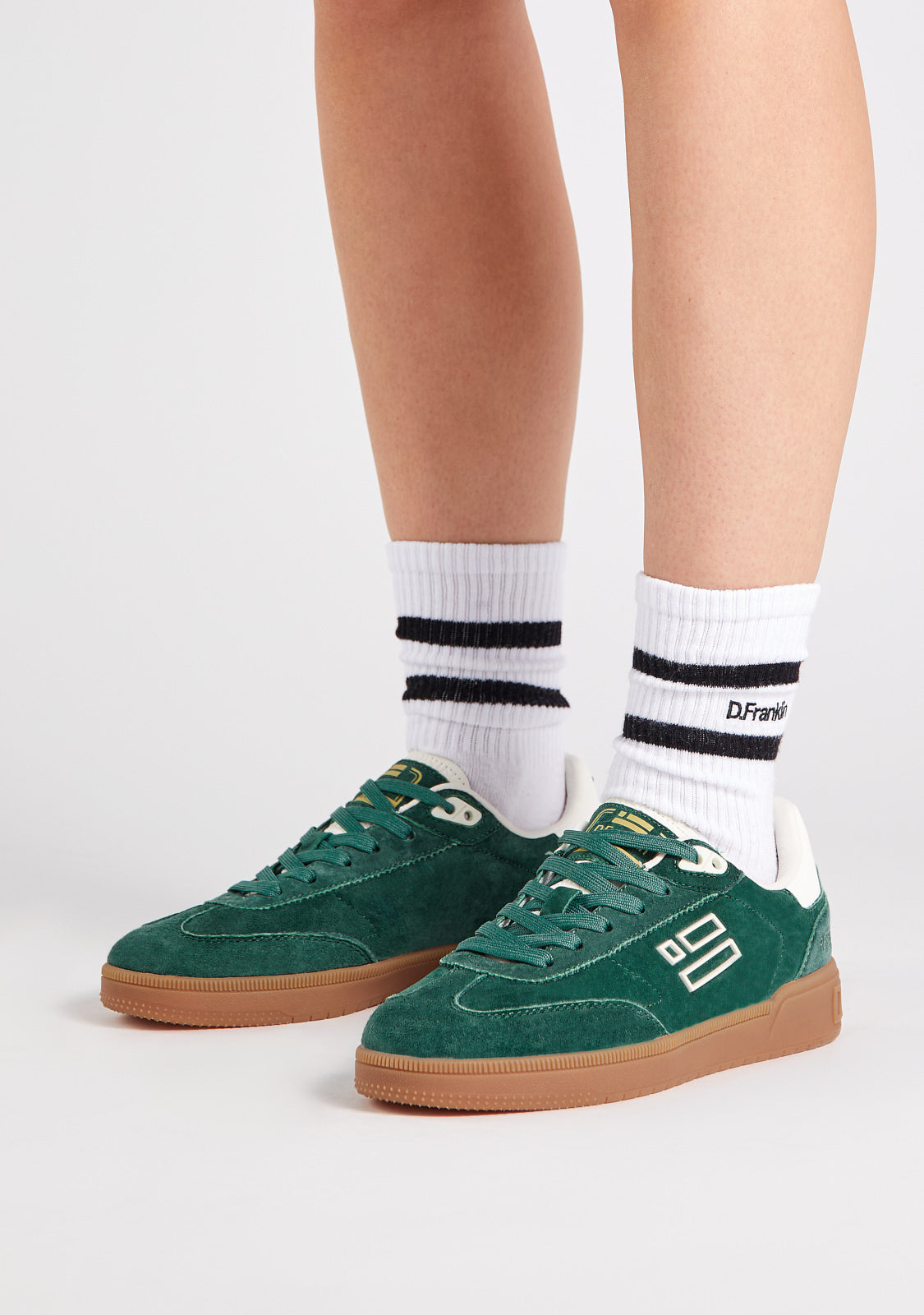 Der Rebel D.Franklin hat eine niedrig geschnittene Silhouette in Grüntönen. Er verfügt über eine Auswahl an Details, die sein Wesen definieren. Er hat ein geprägtes Logo an der Ferse und Sohle, eine gestickte Flagge an der Seite und den Namen des Designs auf der Rückseite. Die 2 cm Gummisohle bietet überlegenen Halt und Traktion.