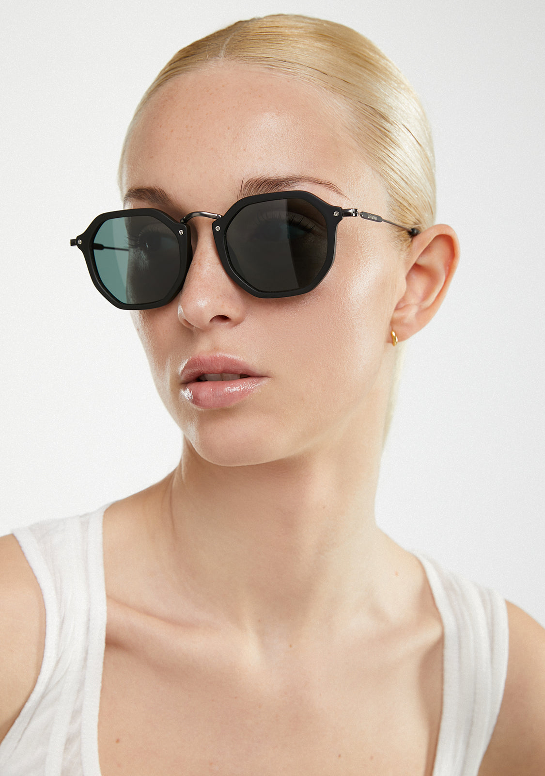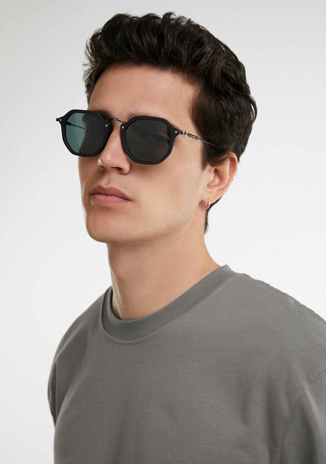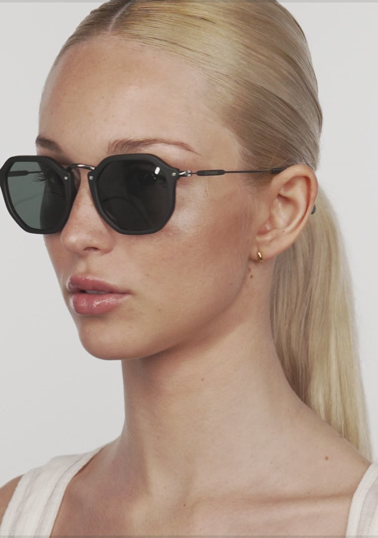Polycarbonat Linsen und ein matt schwarzer, achteckiger Kontur verstärken den ikonischen Stil. Sie verfügt über unsere charakteristischen D.Franklin Details: das Logo, das auf beiden Metallbügeln eingraviert ist, und unser Emblem auf der rechten Linse. Mit einer Linsenbreite von 51 mm und einem vorderen Rahmen von 148 mm betonen diese Brillen die Merkmale jedes Gesichts. Die Seitenarme aus rostfreiem Stahl sind 145 mm lang.